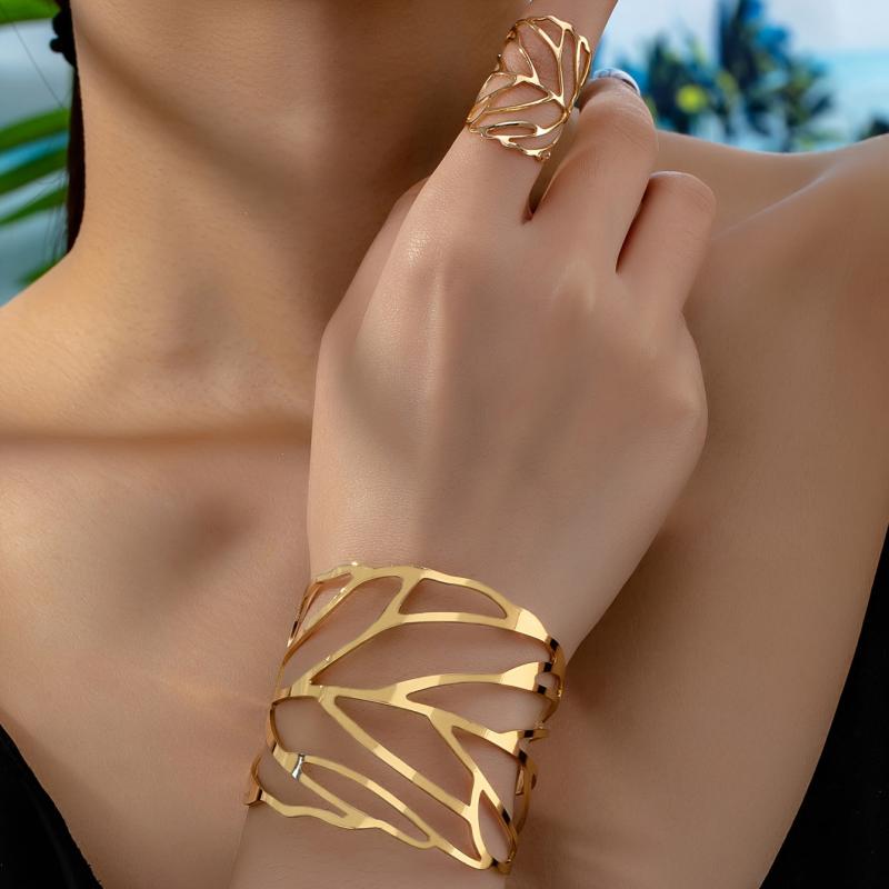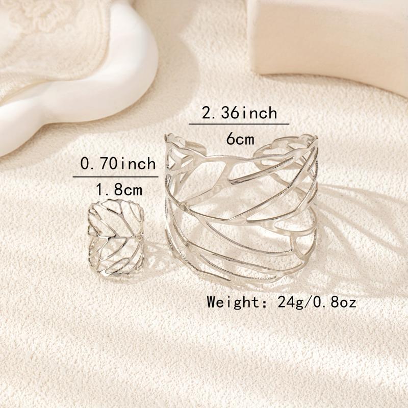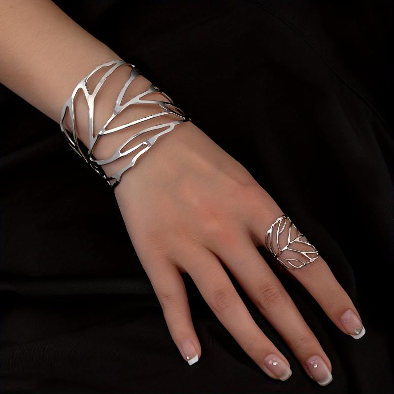 This stunning set features a wide-face leaf design ring and bracelet, perfect for adding a touch of nature-inspired beauty to your outfit.
