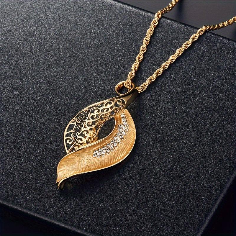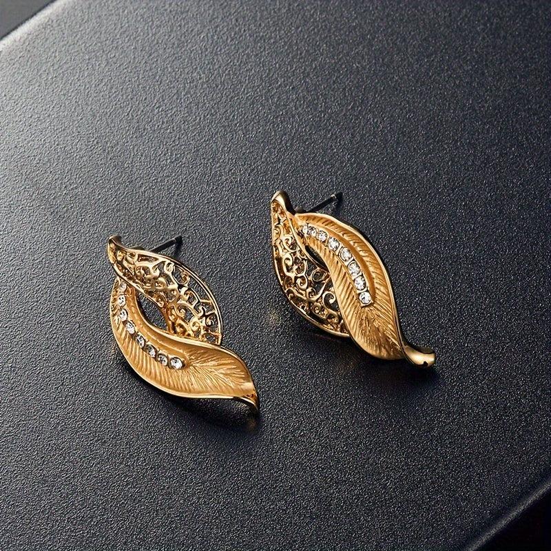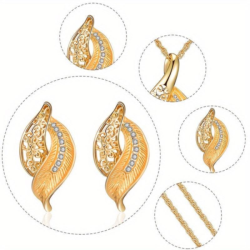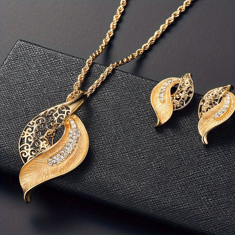 This elegant jewelry set features a hollow leaf design with inlaid rhinestones. Perfect gift for women who love unique accessories.