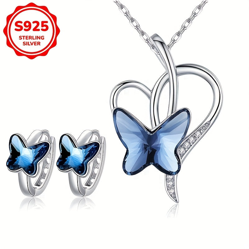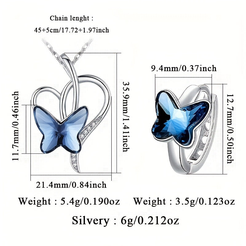 This two-piece jewelry set features a delicate butterfly design with inlaid zirconia. The set includes earrings and a necklace, perfect for daily wear. Made from S925silvery with a net weight of 6g.