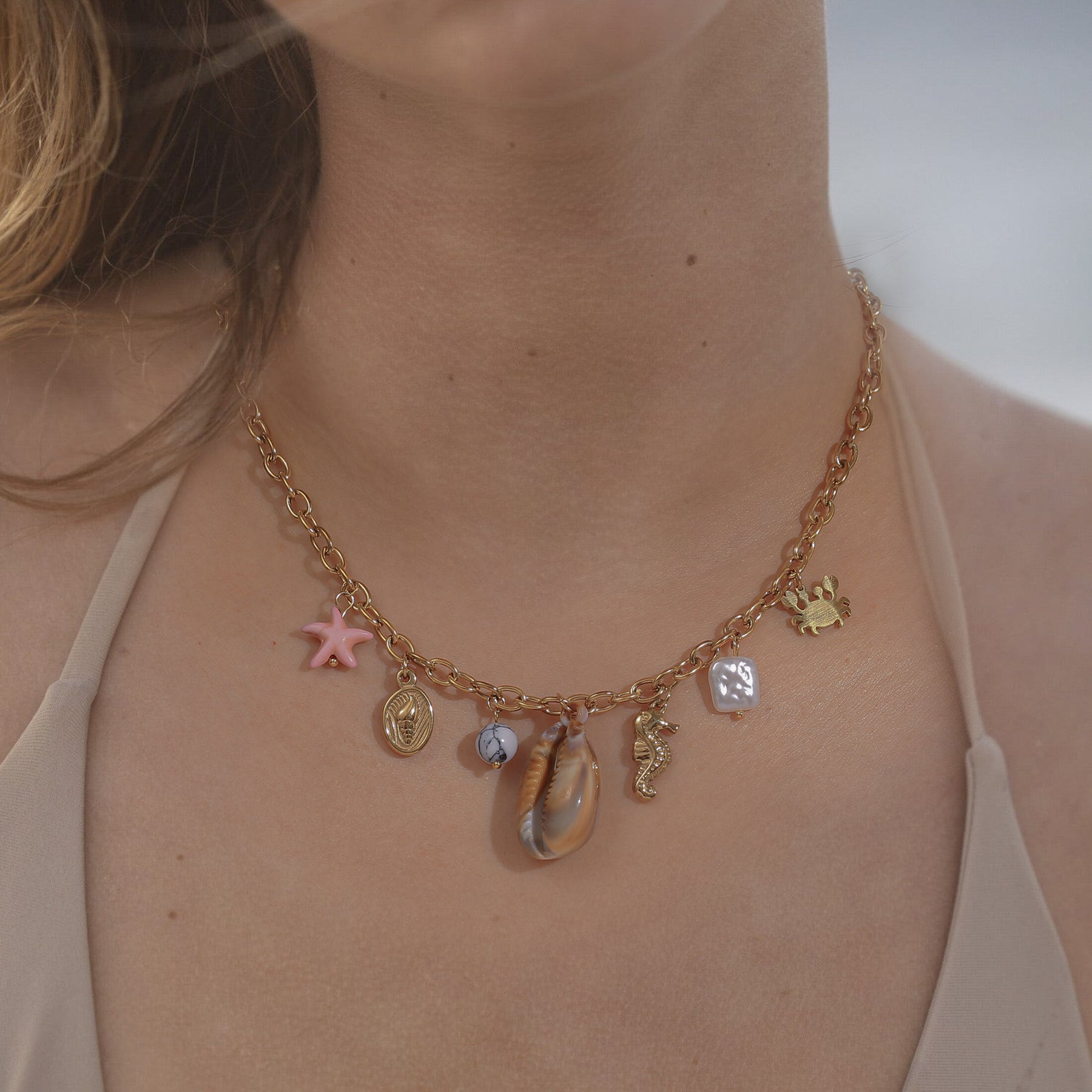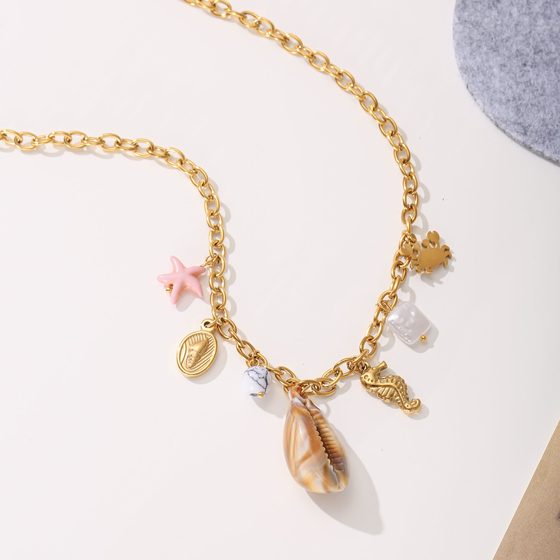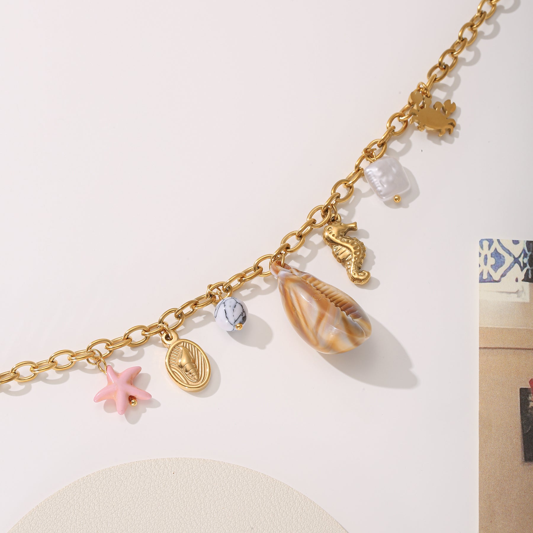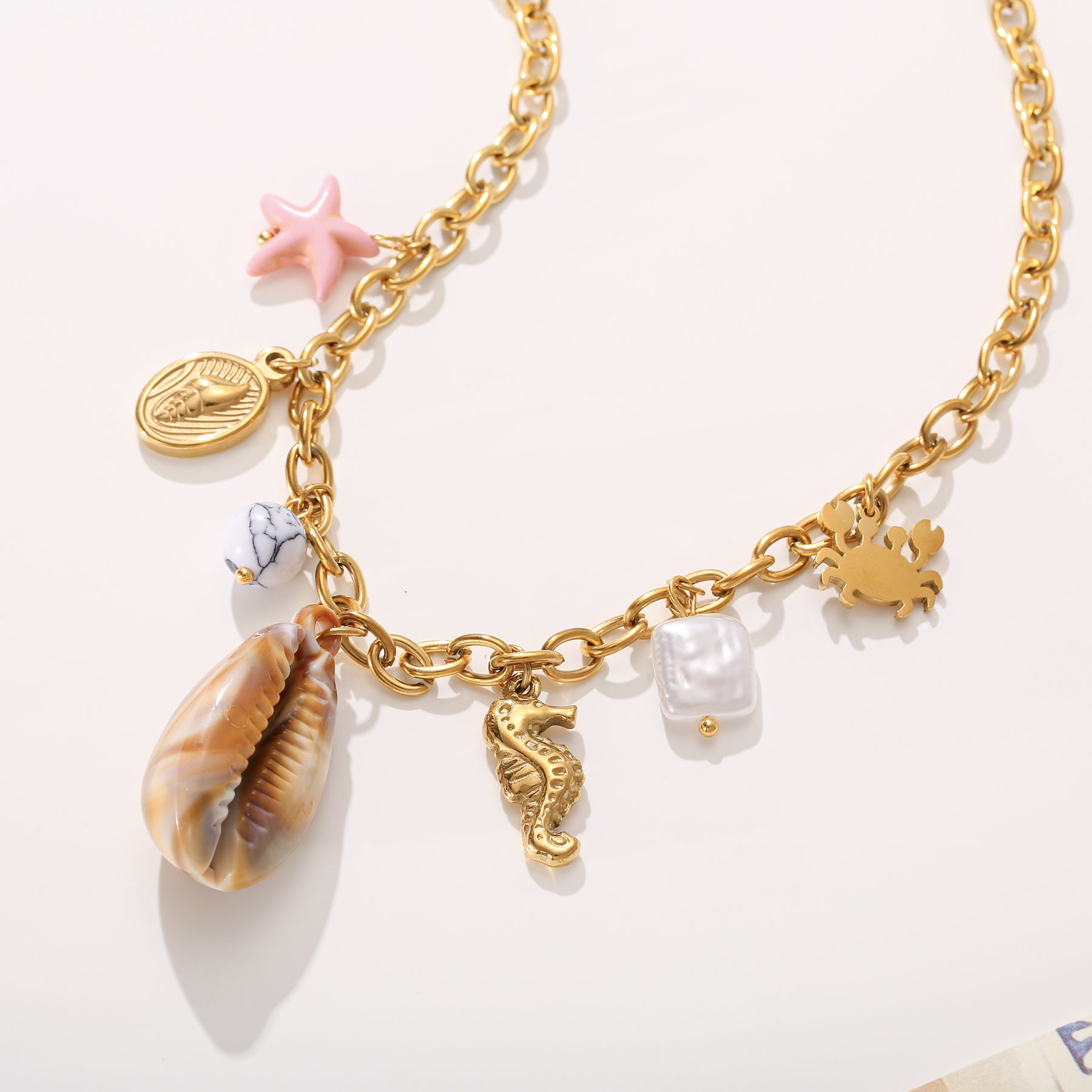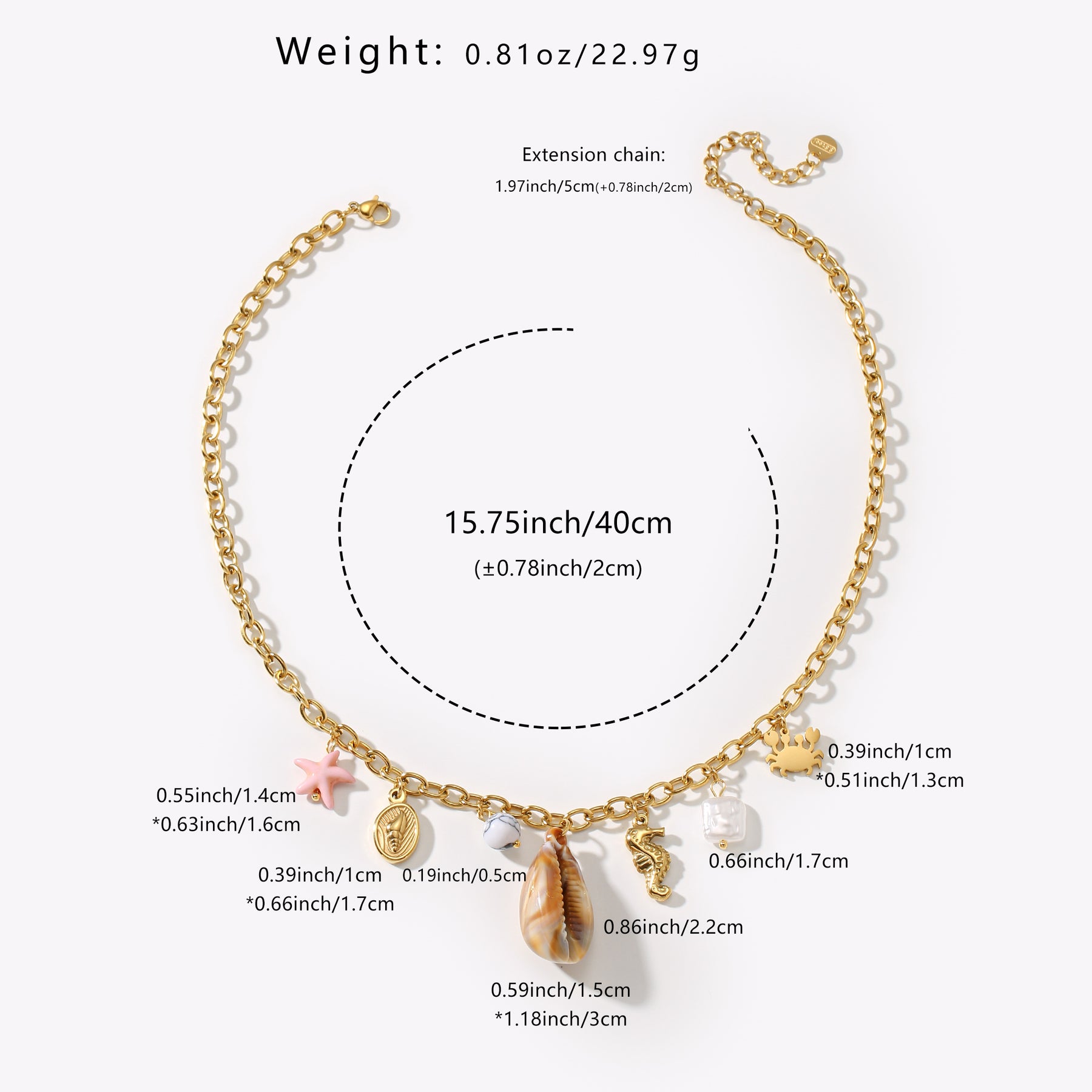 This necklace features seahorse, crab, and starfish charms, making it perfect for daily wear or vacation. The hypoallergenic material ensures comfortable wear.