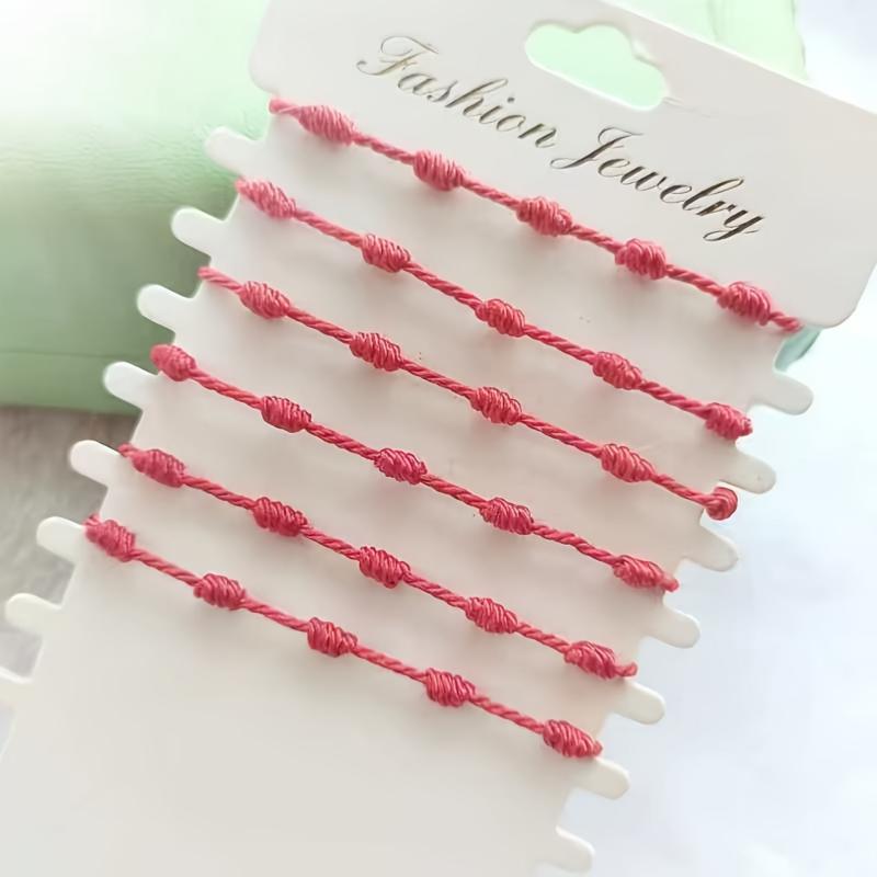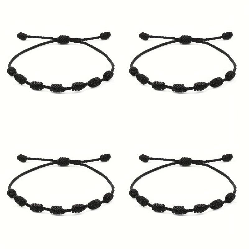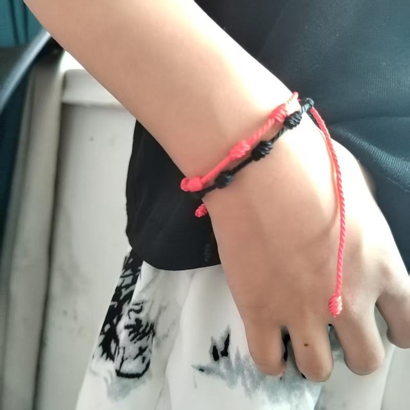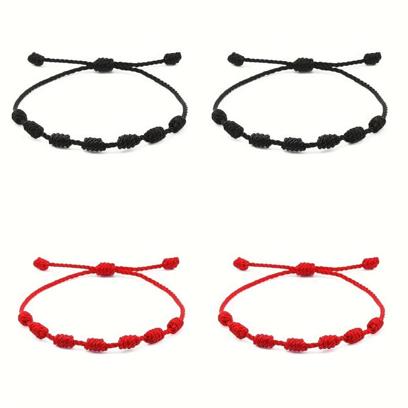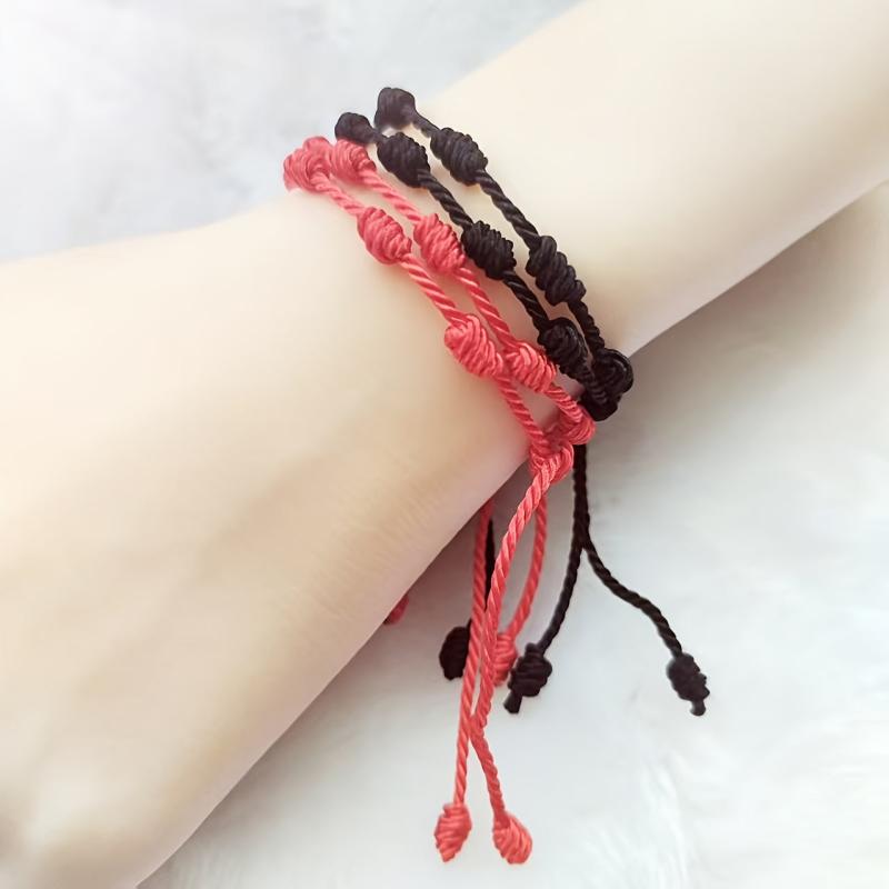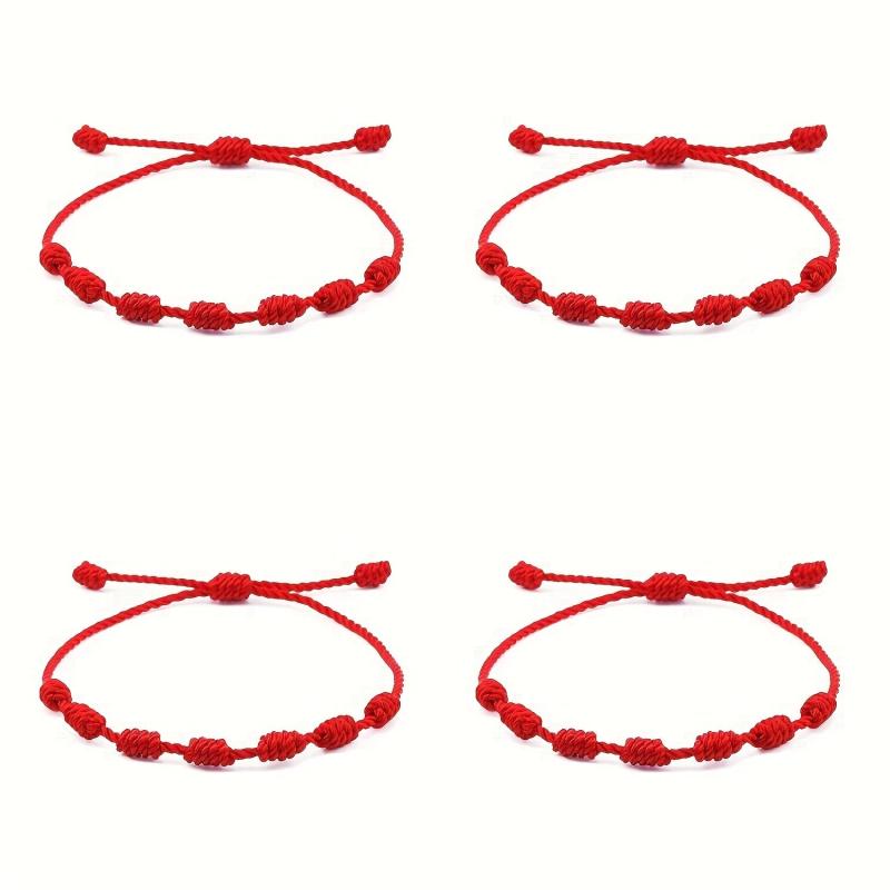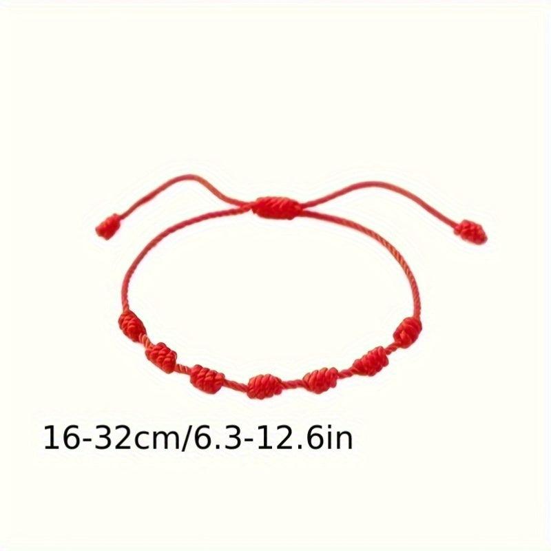 This beautiful red string bracelet features seven lucky knots and intricate Peruvian knot weaving. The thin cords are pullable to adjust the bracelet's size.