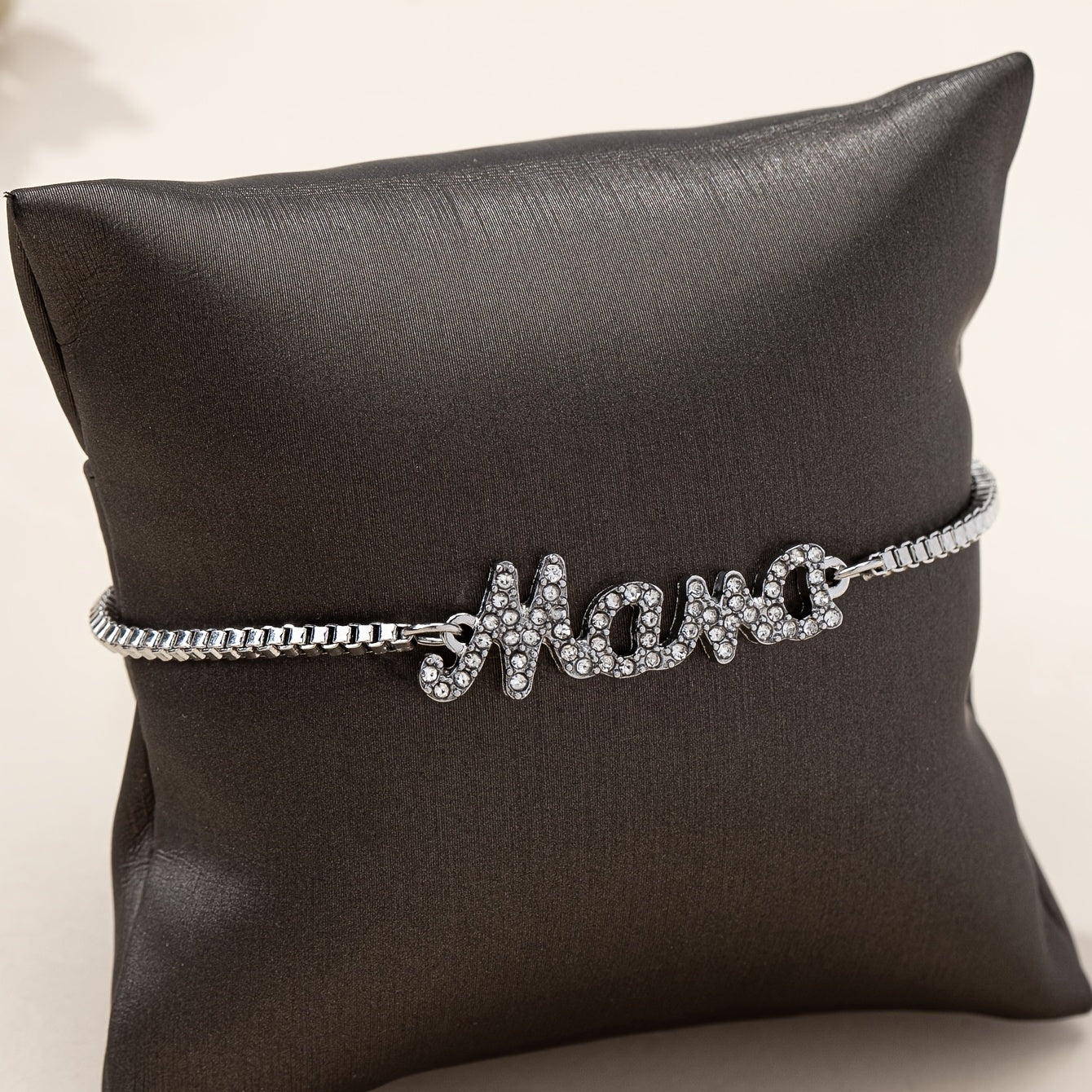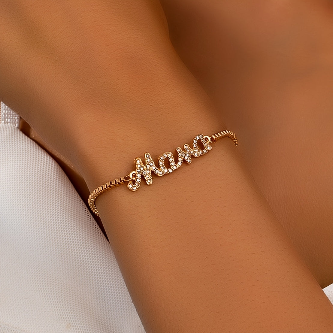 A stunning Mama letter charm bracelet featuring sparkling faux diamonds. Made of high-quality zinc alloy and glass, this bracelet is the perfect Mother's Day gift for casual attire.