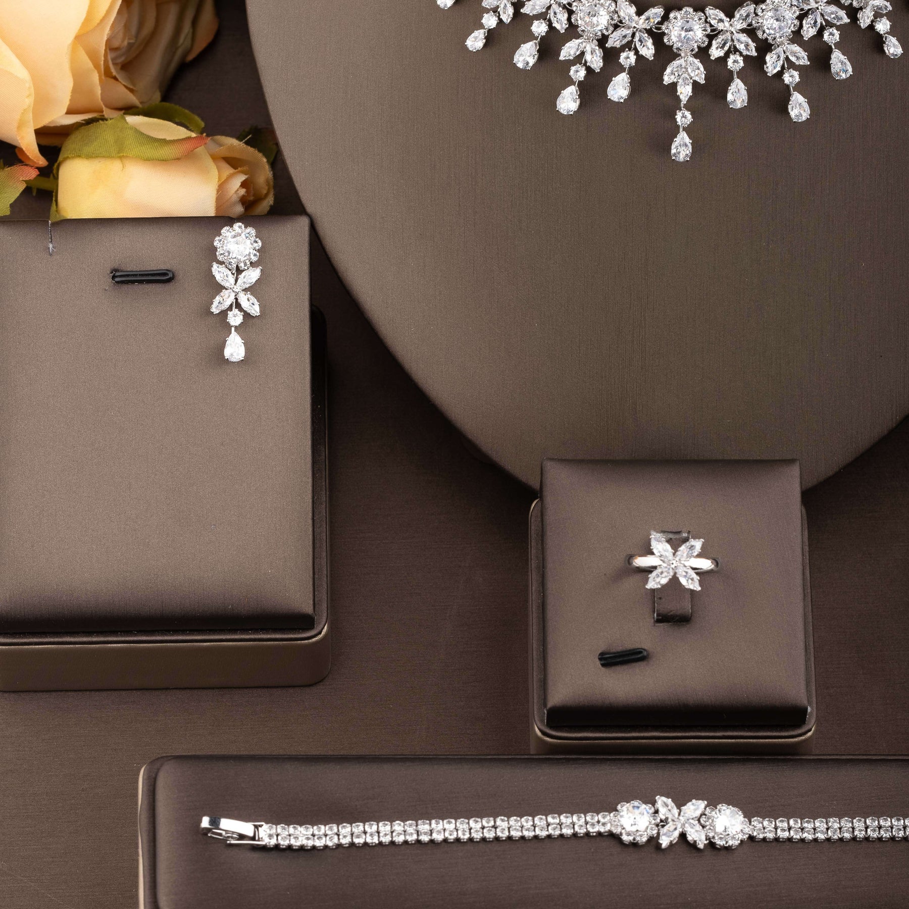 Complete your bridal look with this stunning floral cubic zirconia jewelry set. Perfect for weddings, parties, and special occasions with its sparkling design.