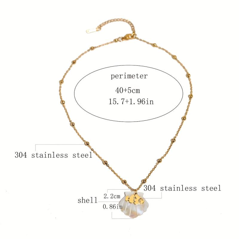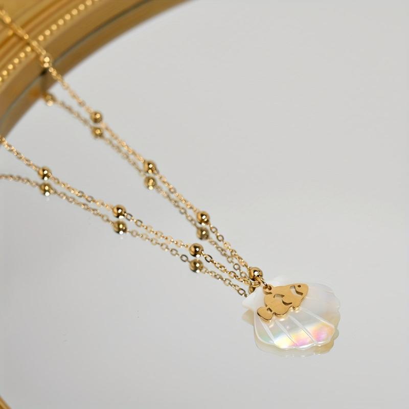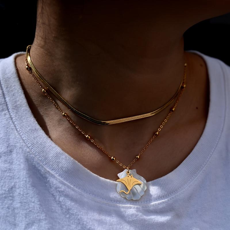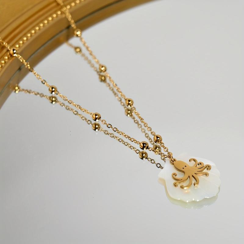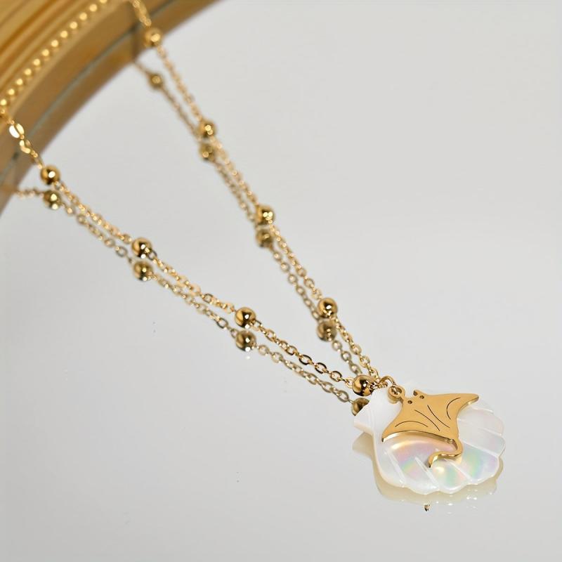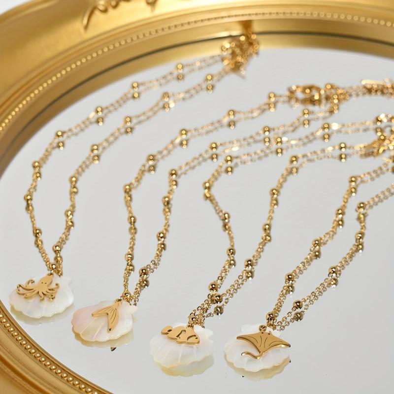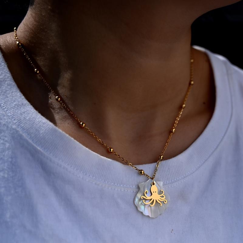 Elevate your beach look with this stunning necklace featuring seashell and devil fish pendants. The golden bead chain adds a touch of elegance to your outfit.
