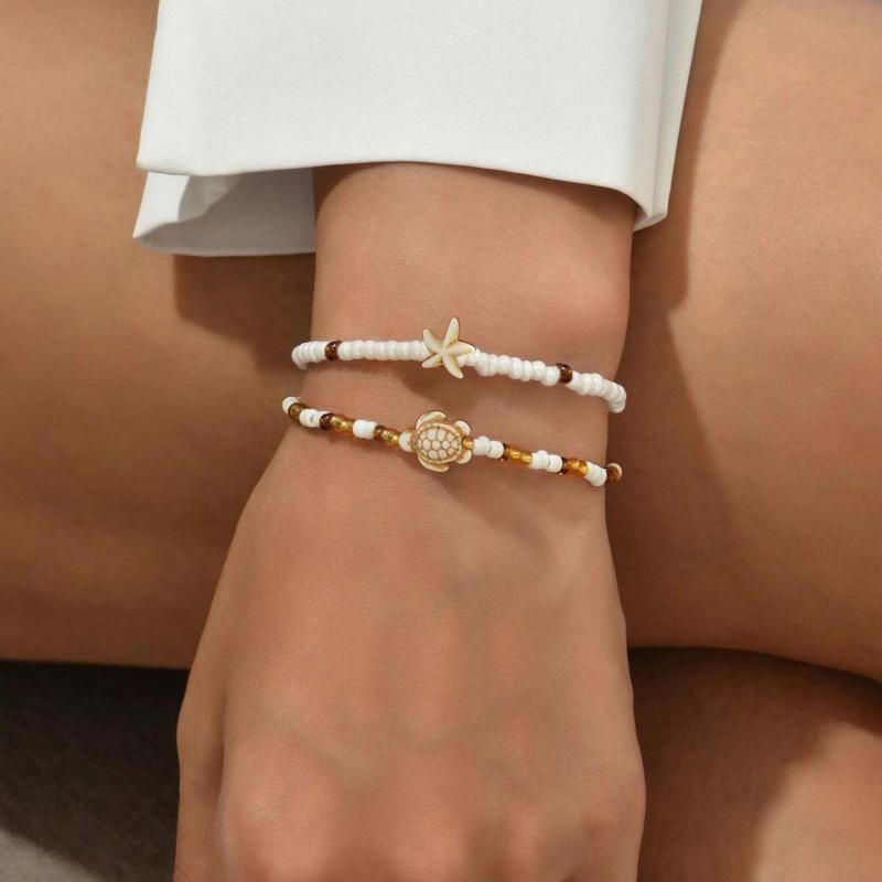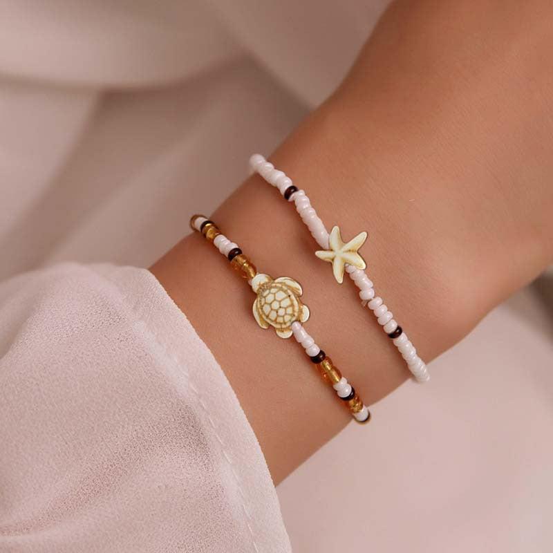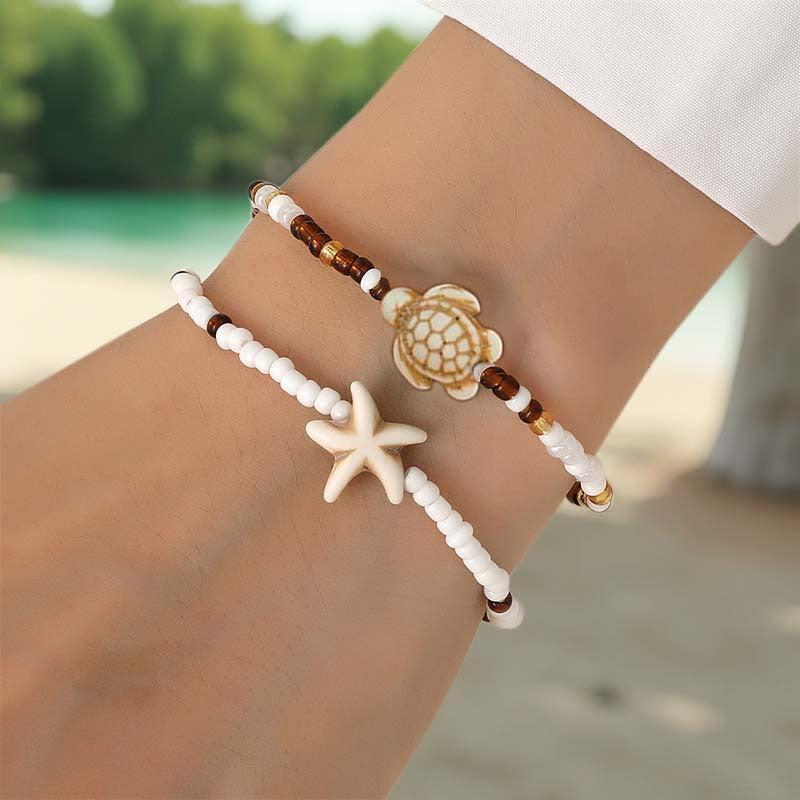 Ocean Style Turtle & Starfish Bracelet Set, Brown Beaded Bohemian Wristbands