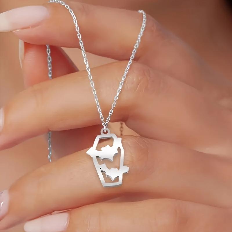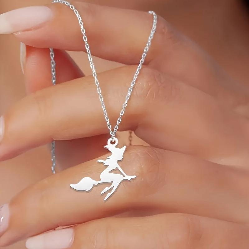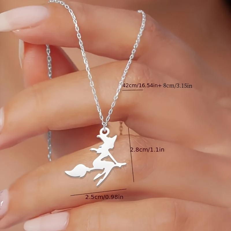 Embrace the spooky vibe with this European and American style Halloween witch pendant necklace. It features a detailed witch with a broom, spider web, and bat cross design, making it a perfect accessory for Halloween parties and gifts.