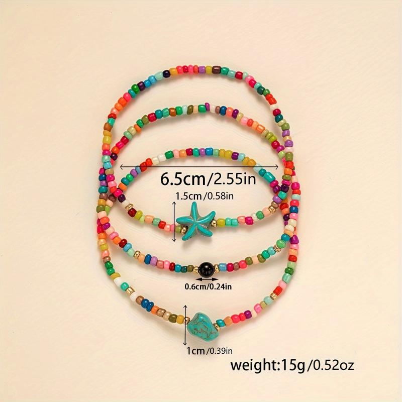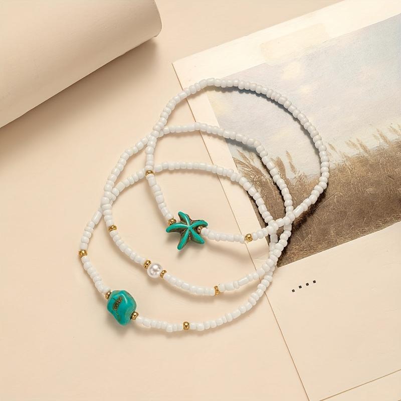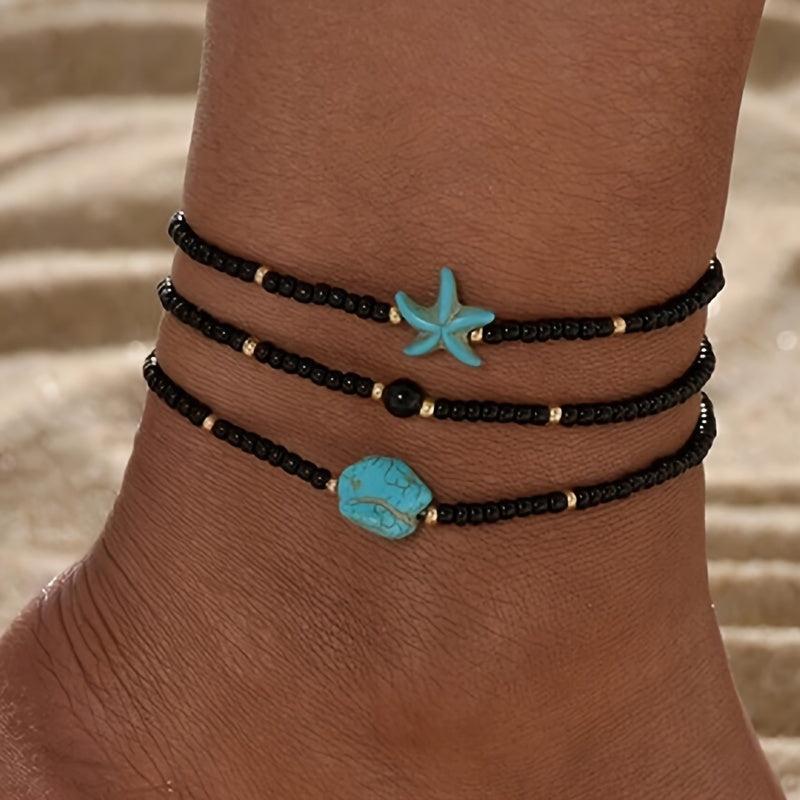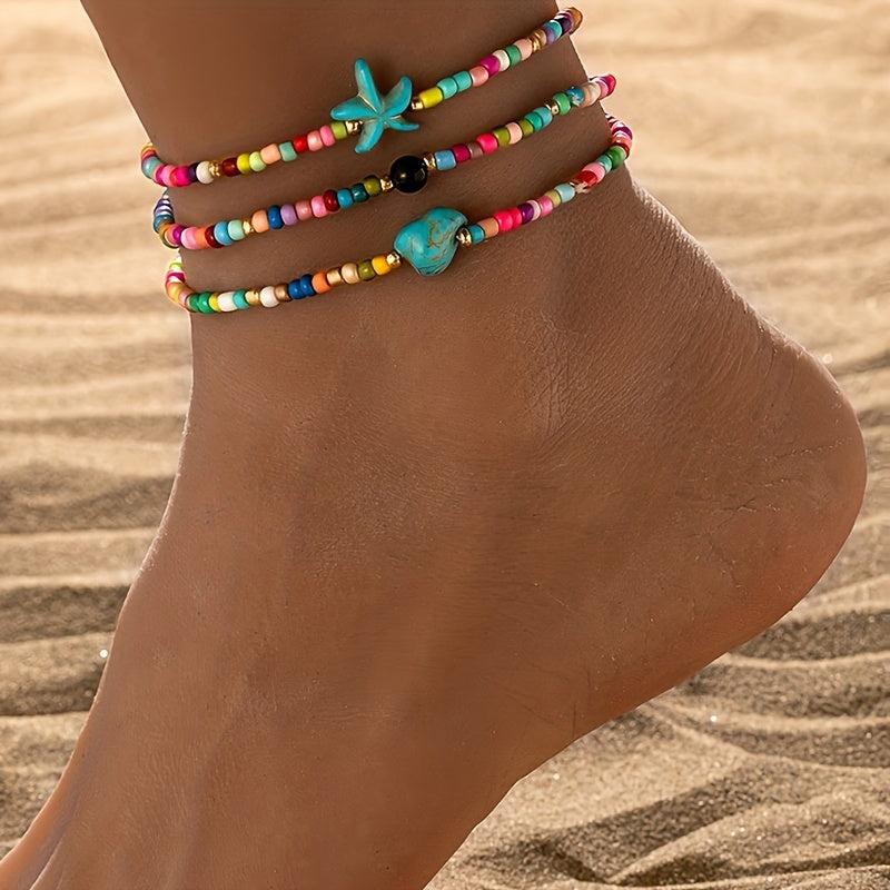 This anklet features a combination of sea starfish, rice beads, irregular stones, and shells, giving it a retro and beachy vibe. It has multiple layers for added style and is a perfect foot ornament for the summer.