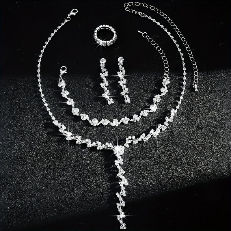 Complete your bridal look with this stunning jewelry set featuring a rhinestone twist design. Includes a necklace, bracelet, earrings, and ring.