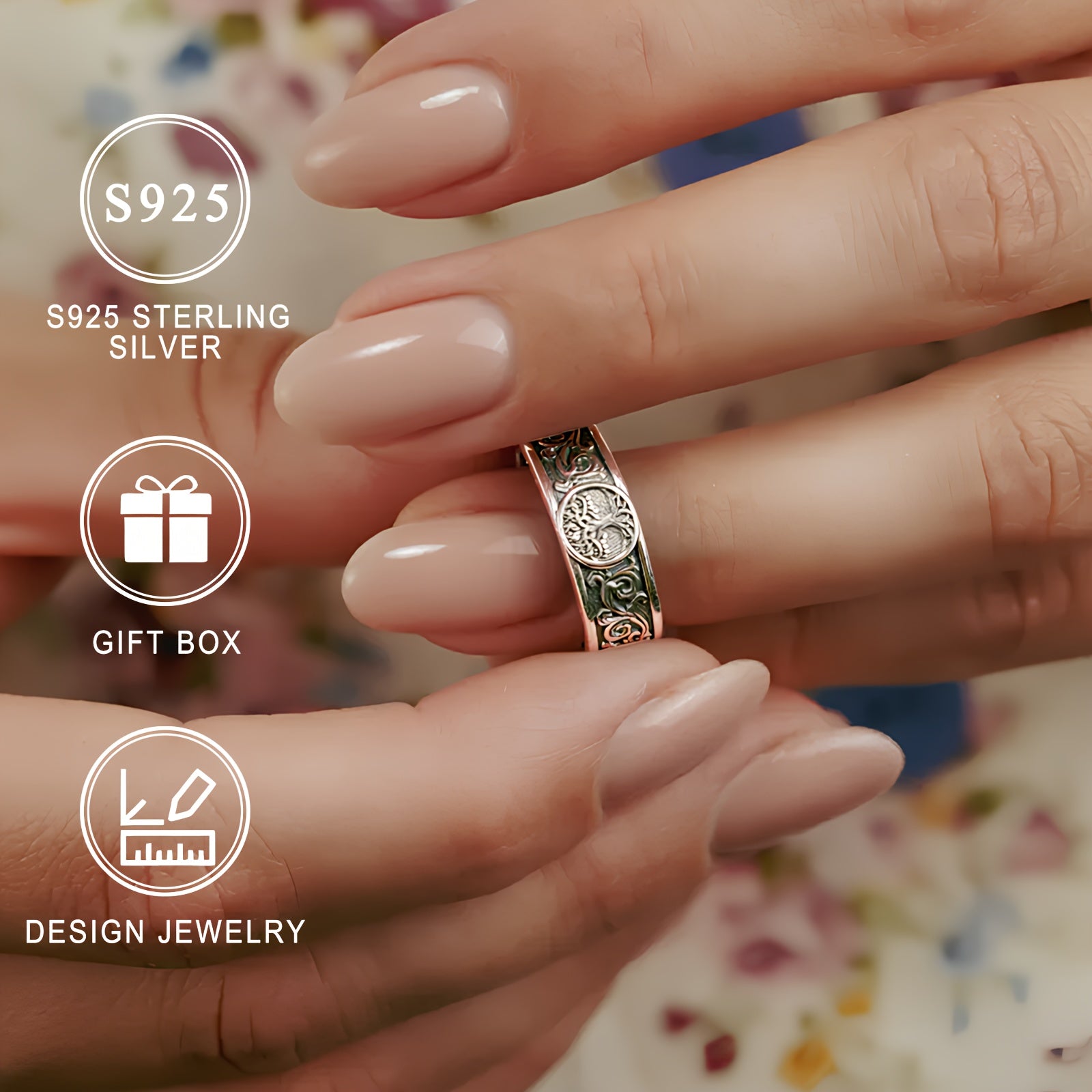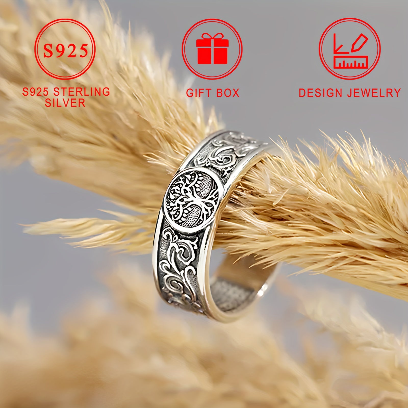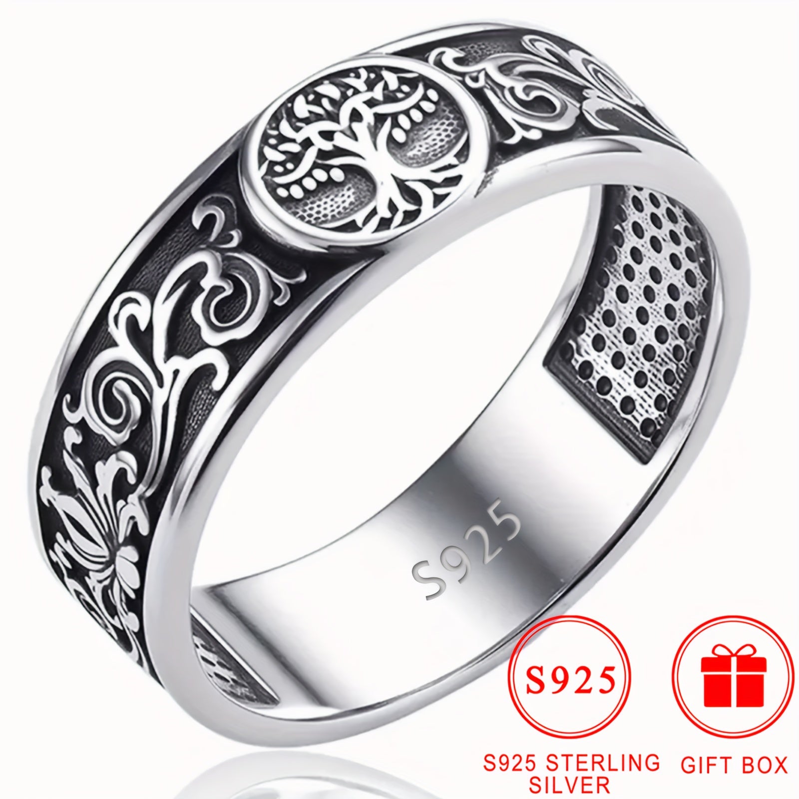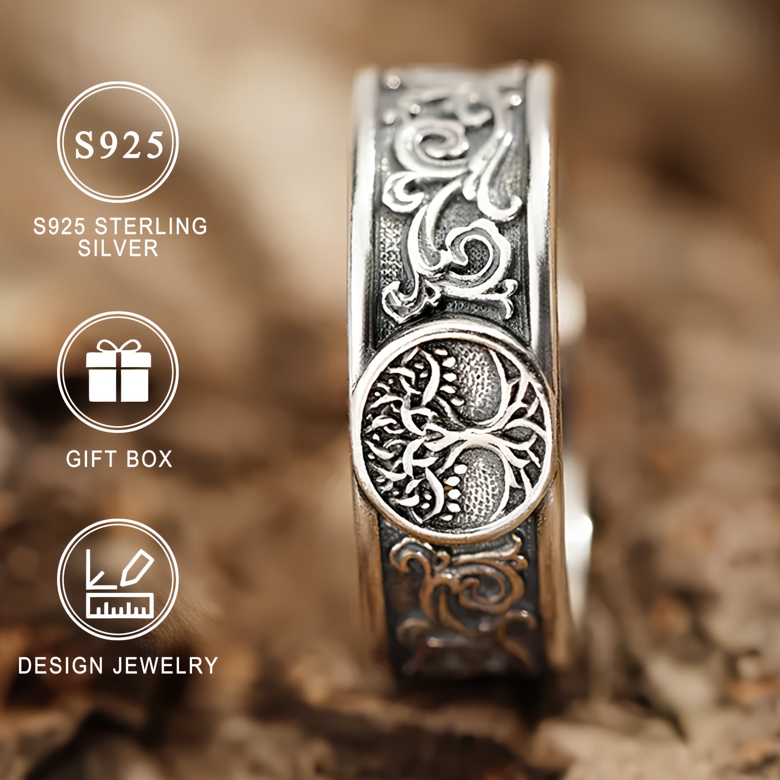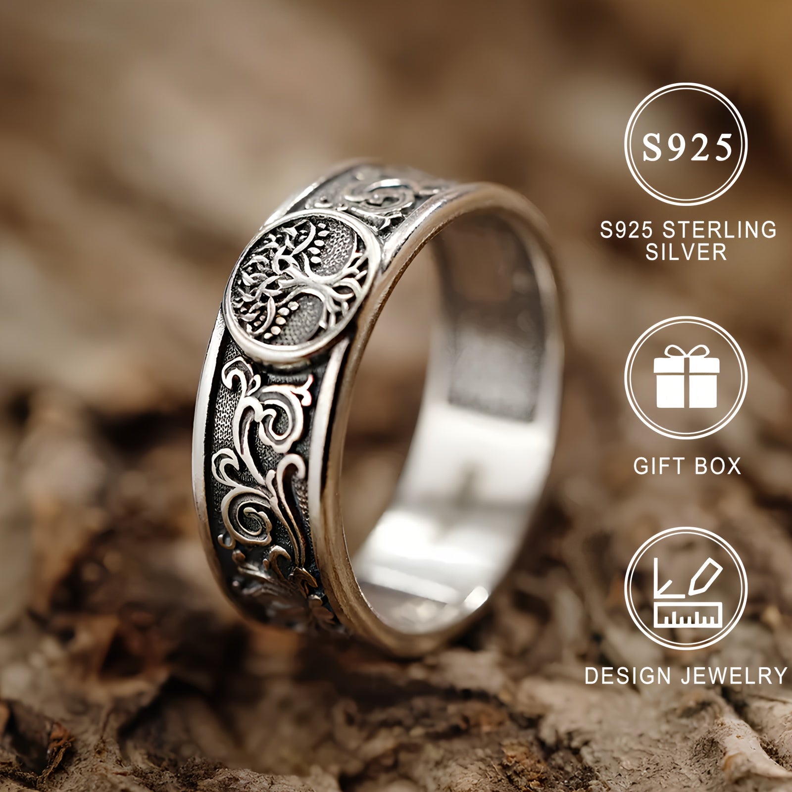 This S925 pure silvery ring features a tree of life design with retro flower carvings, making it a classic and elegant jewelry piece for daily wear.