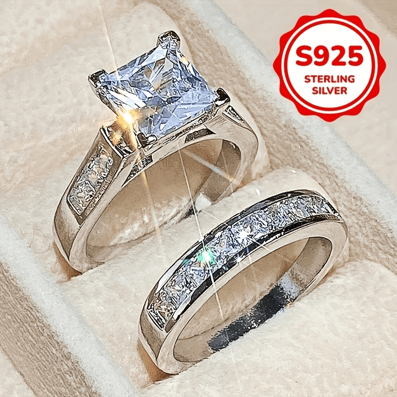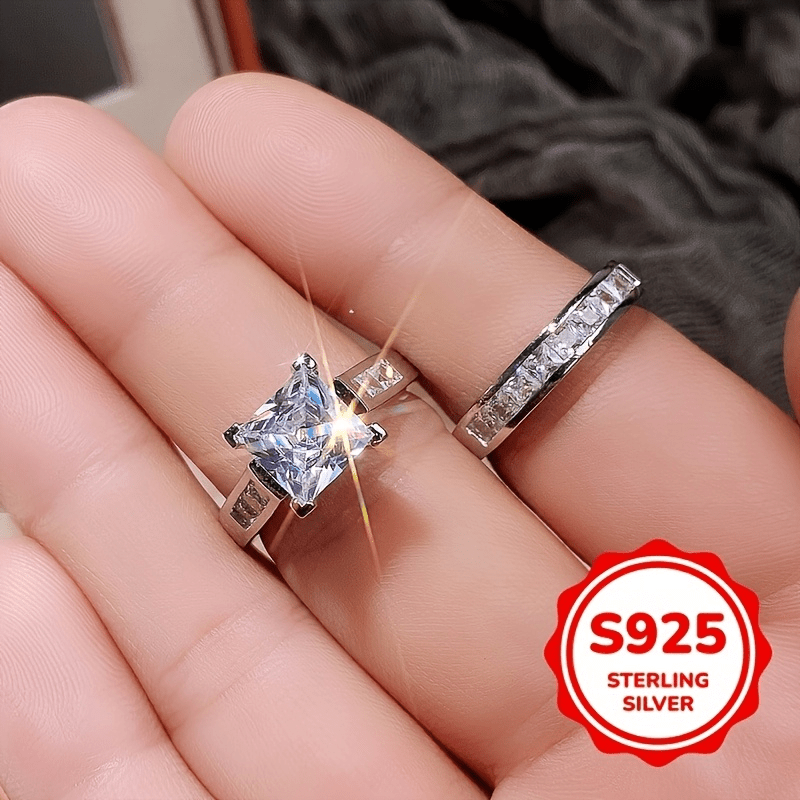 Elegant and captivating, this S925 silver ring set features a stunning synthetic zirconia princess square ring. Perfect for engagement, proposal, bride, wedding, and banquet occasions.