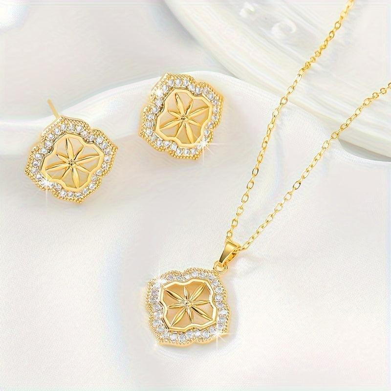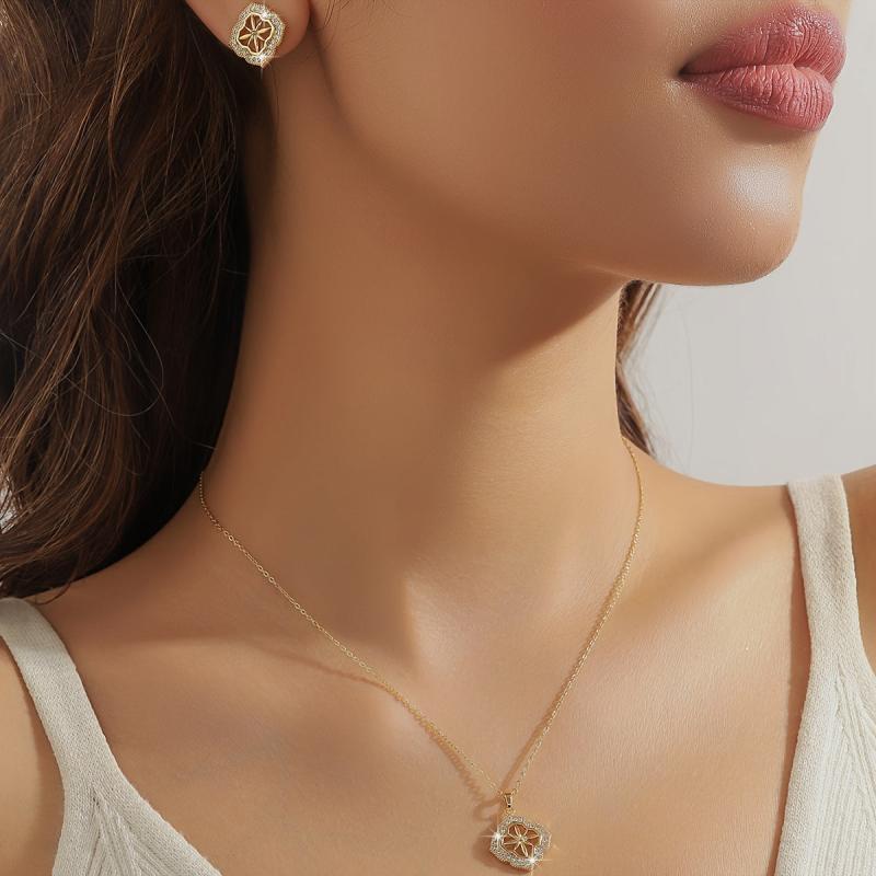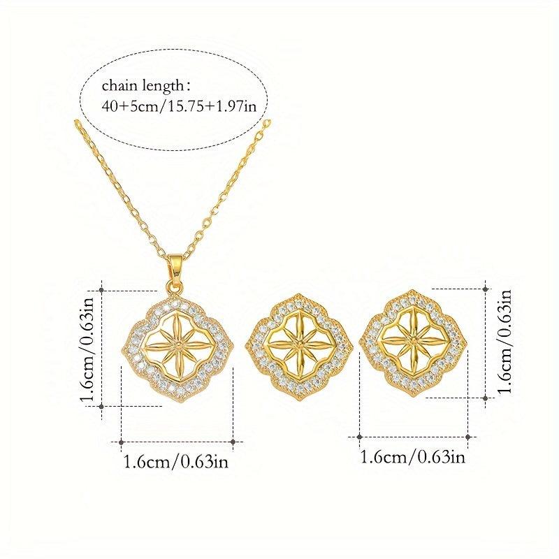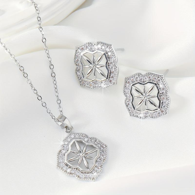 This set includes a delicate four leaf flower stud earrings, an elegant eight pointed star stud earrings and a matching necklace. Perfect for sophisticated jewelry lovers.