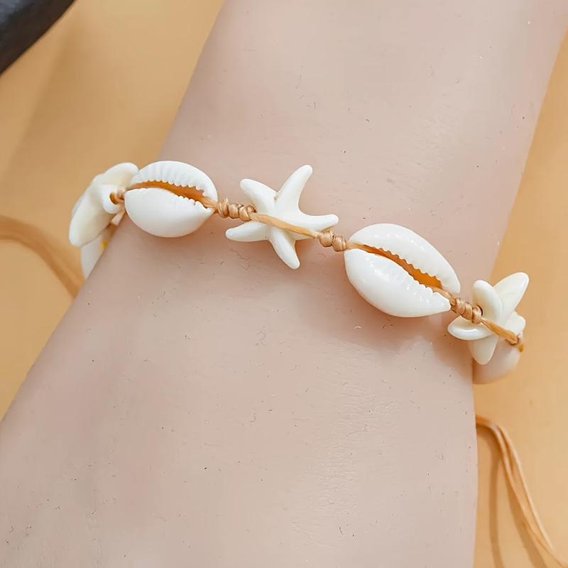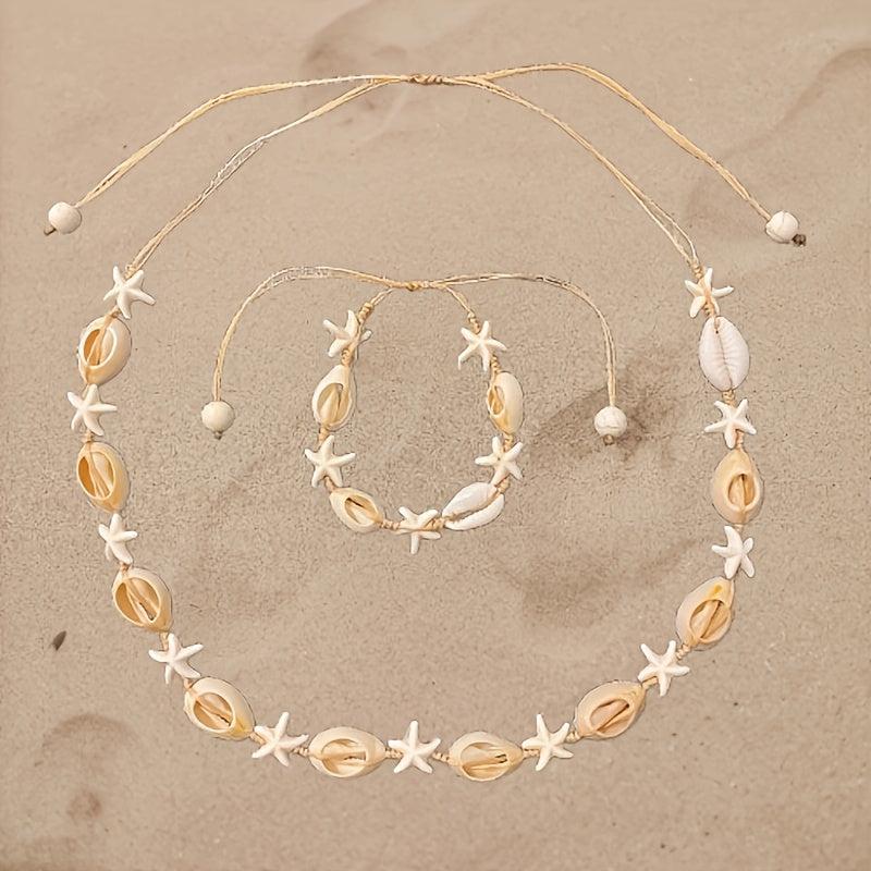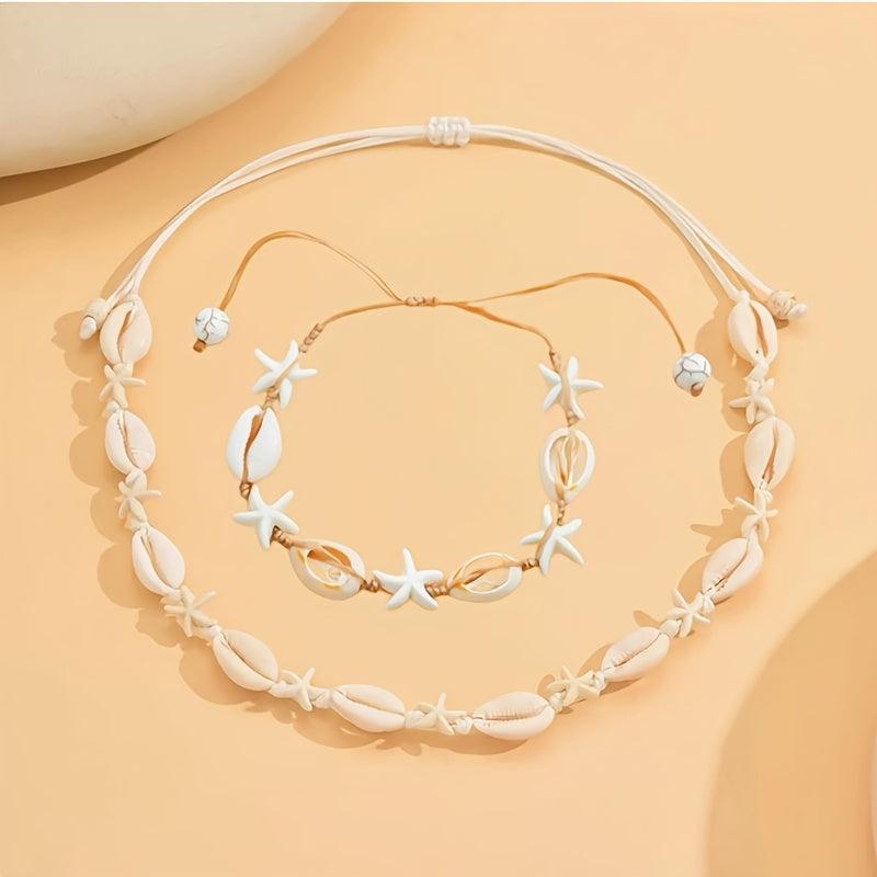 This necklace and bracelet set is ideal for a beach vacation look. Features adjustable rope design with shell and starfish charms.