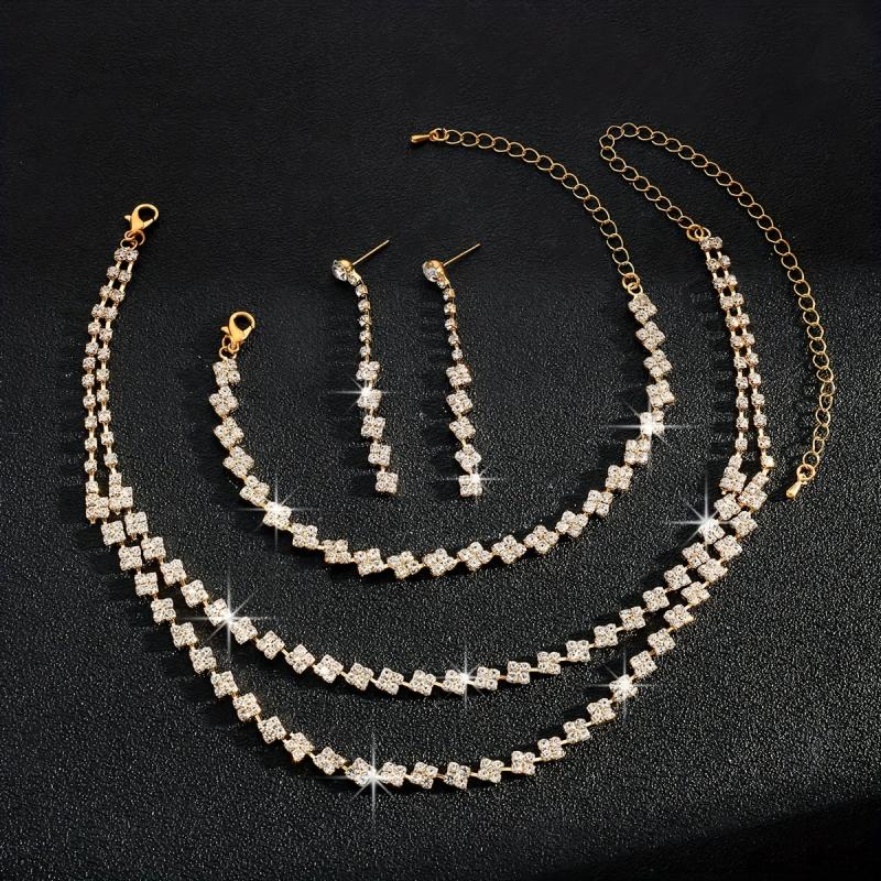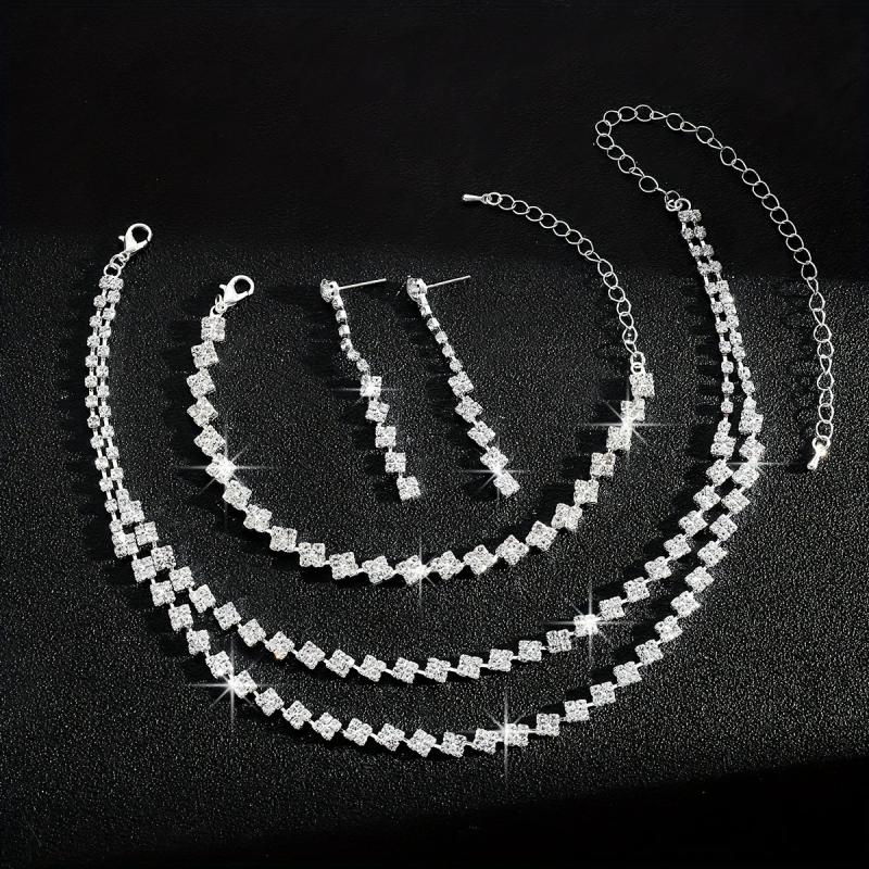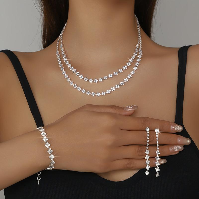 This exquisite set features a brilliant rhinestone double layer necklace and matching earrings, perfect for a fashionable bride.