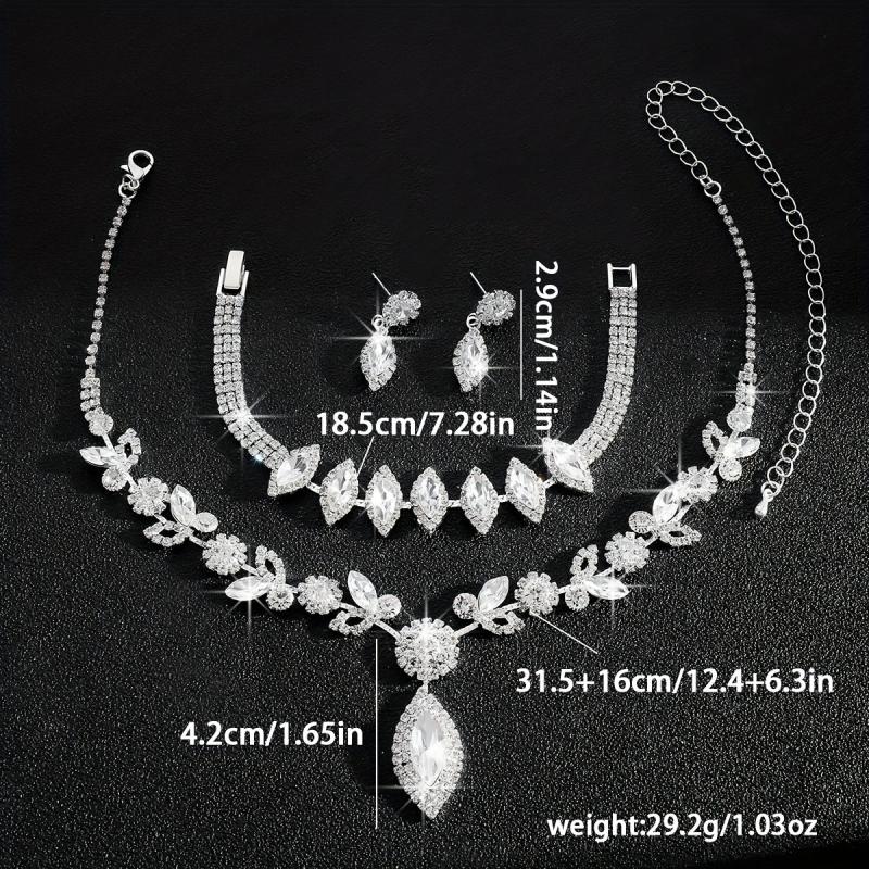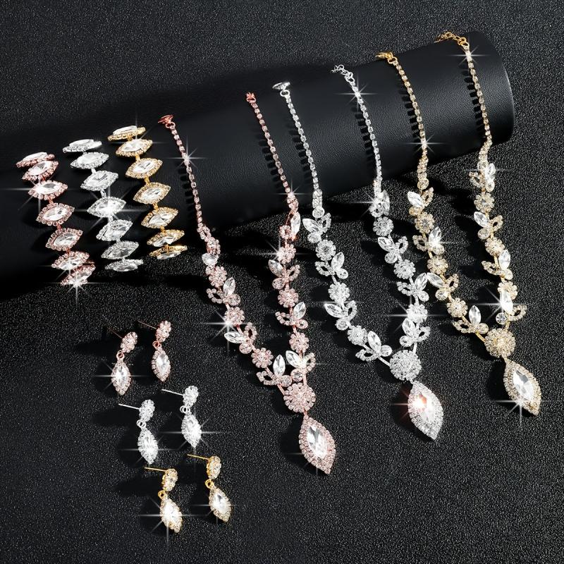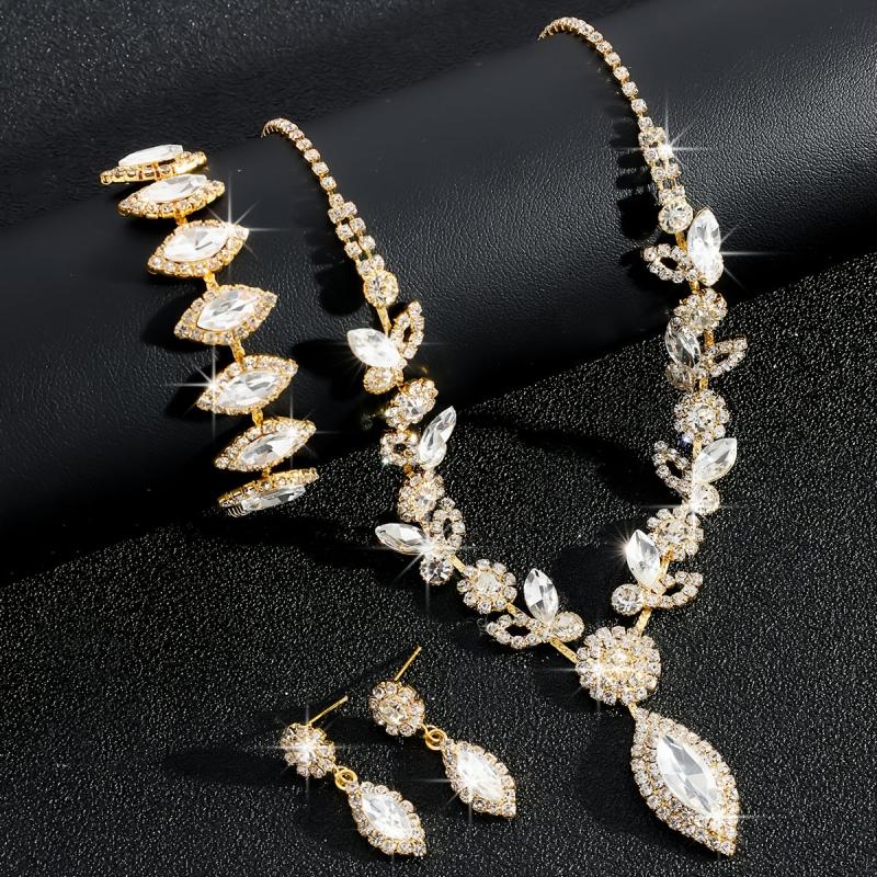 This stunning jewelry set includes a necklace, earrings, and bracelet, perfect for bridal or formal events. Made with sparkling rhinestones in a marquise floral design on a copper base with golden plating.