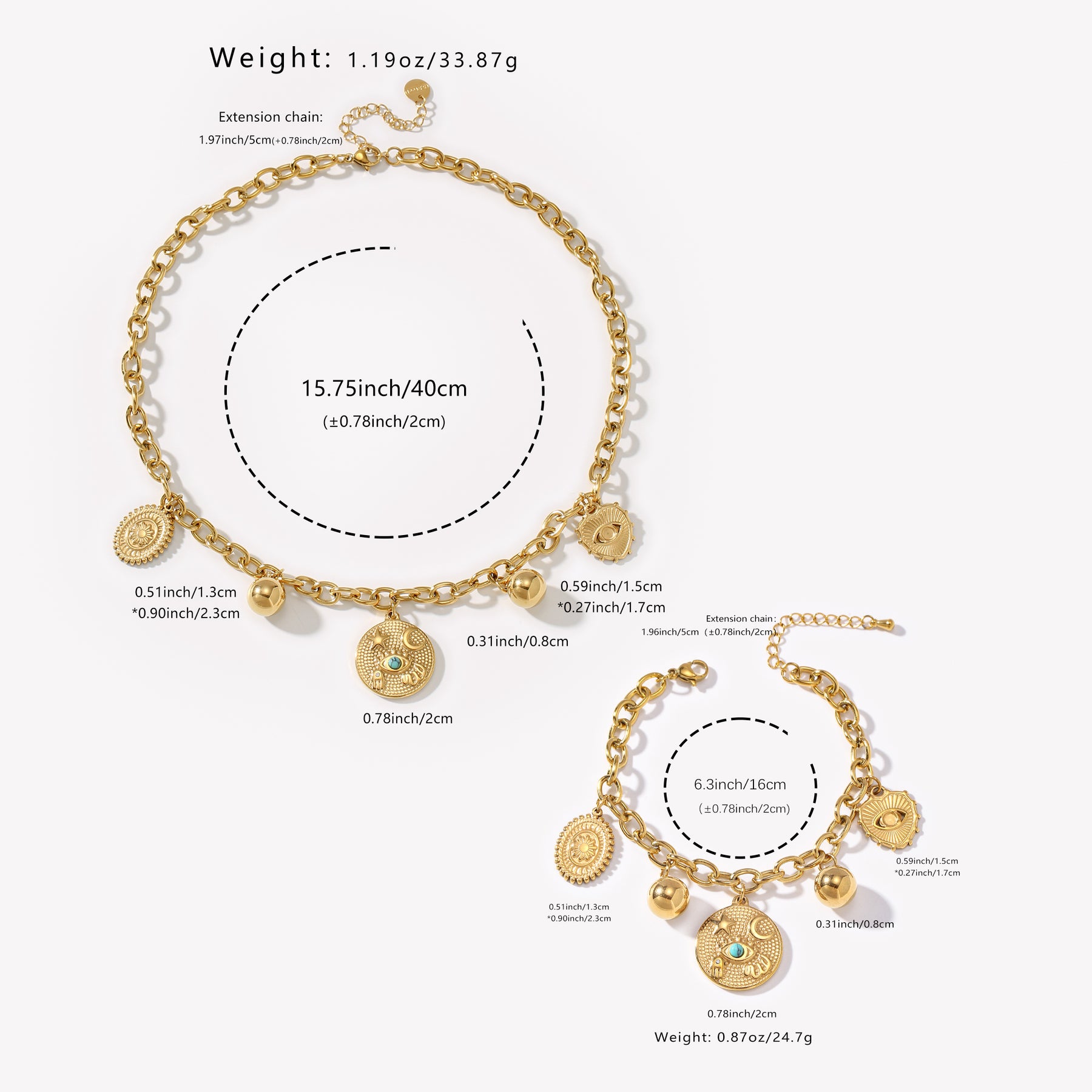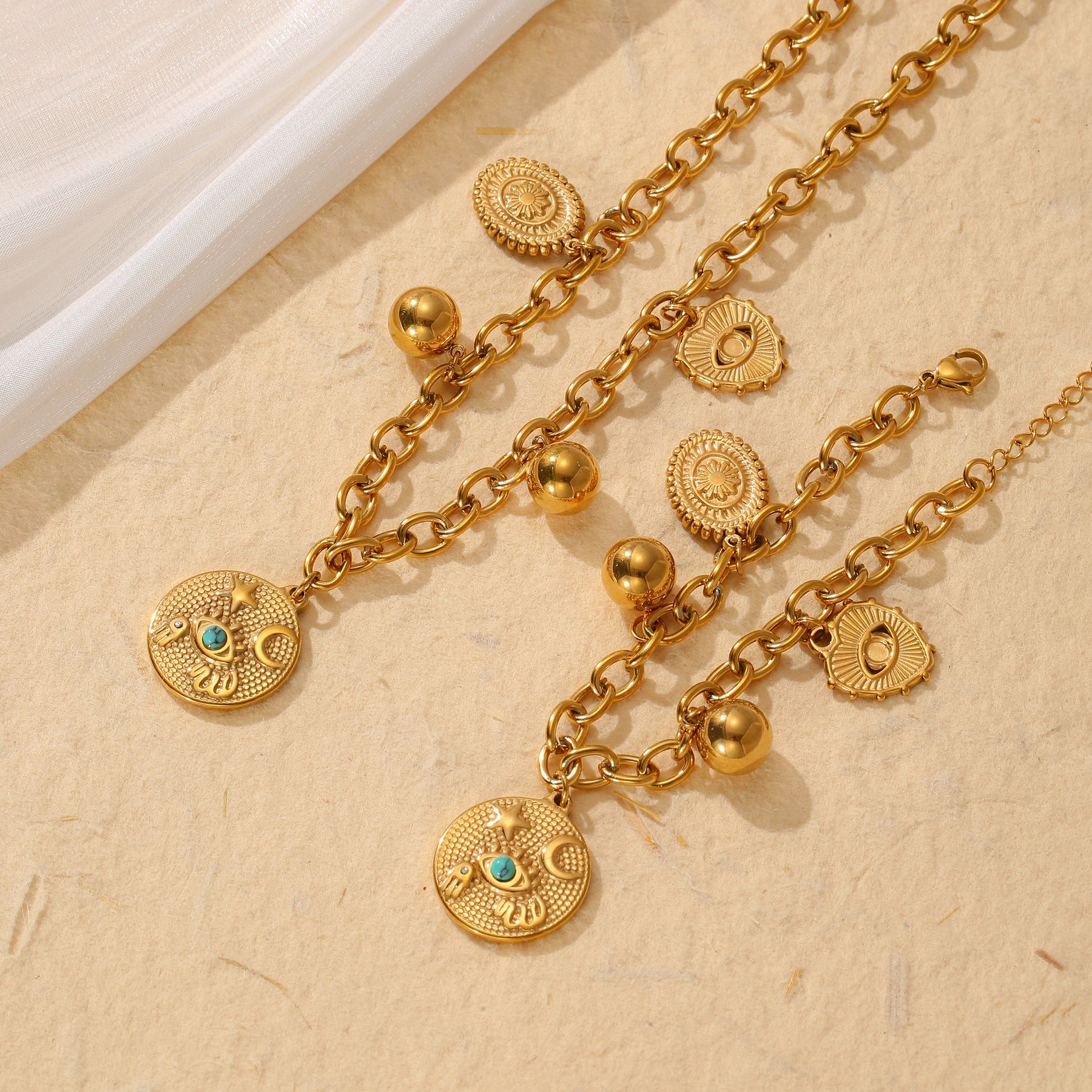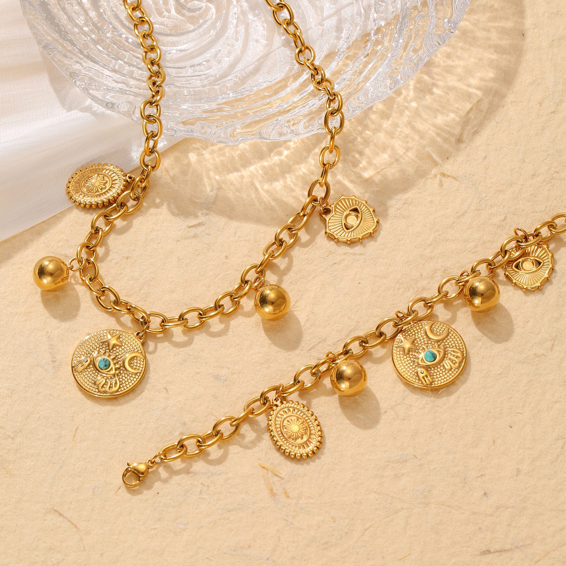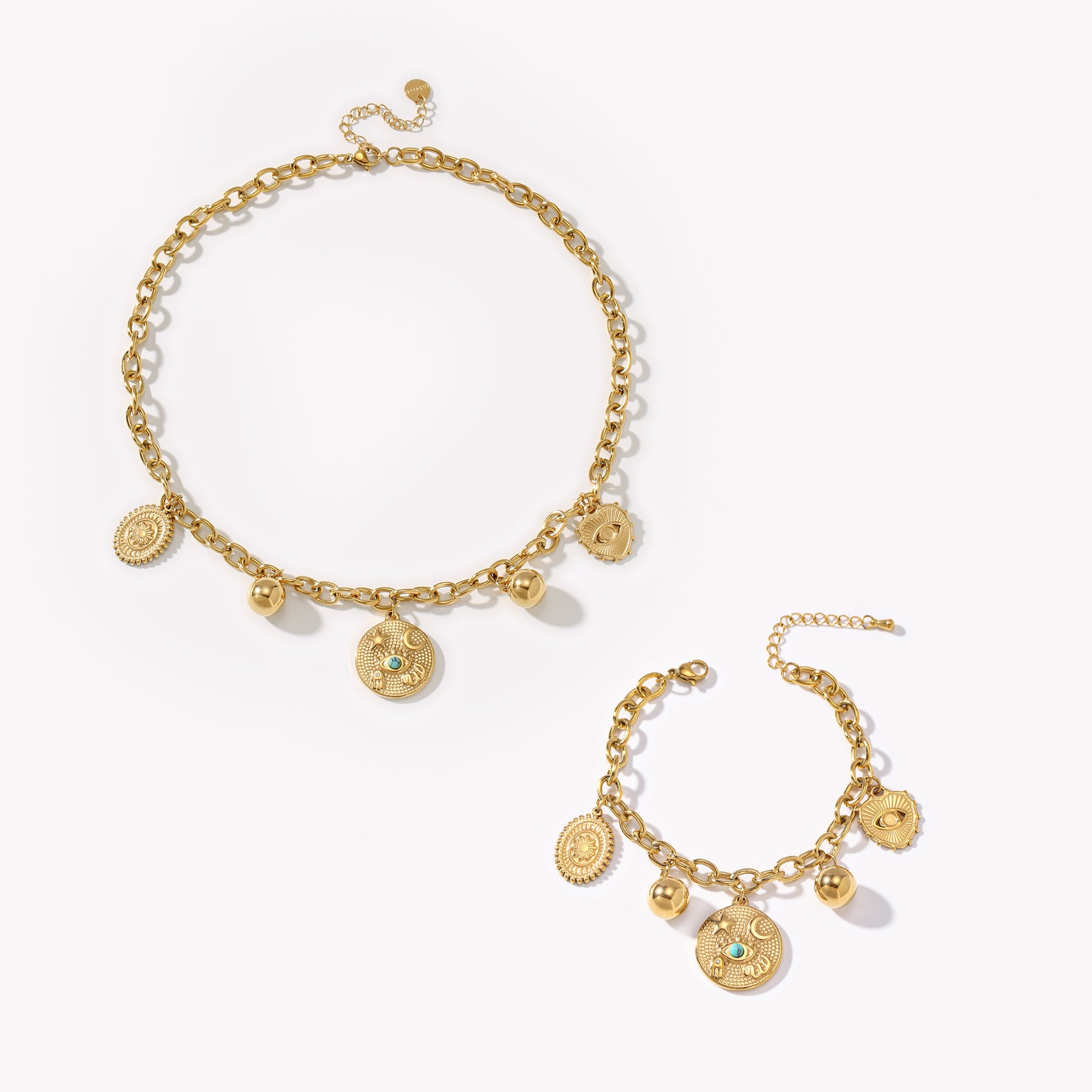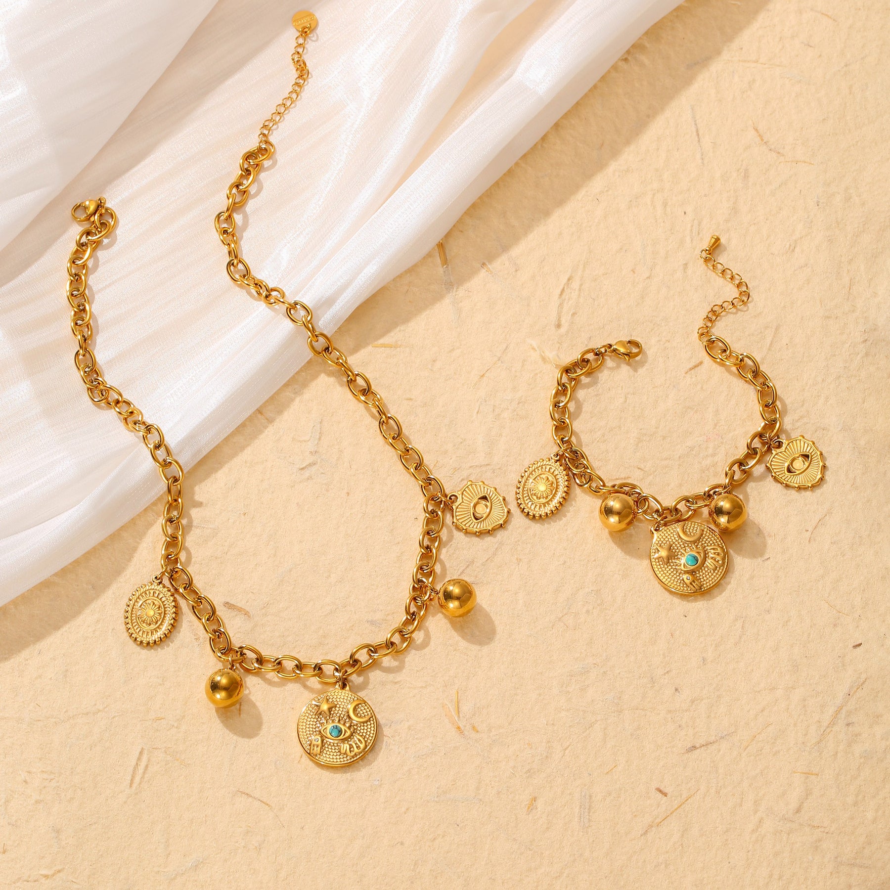 Elegant set featuring star, moon, eye, and round pendants. Made of hypoallergenic stainless steel. Perfect for daily wear and shopping.