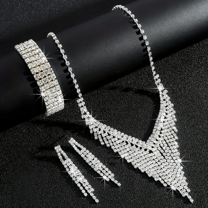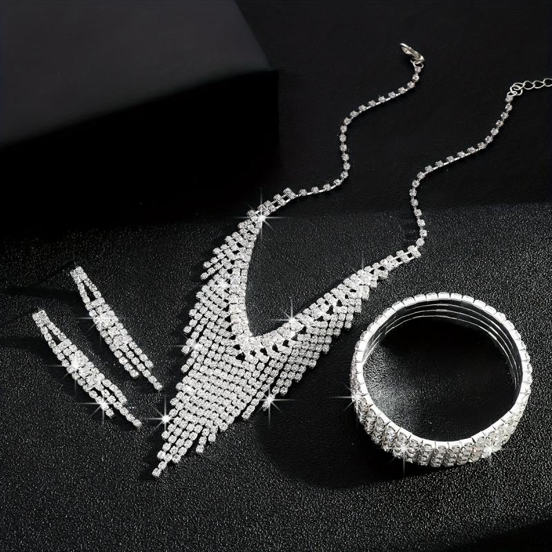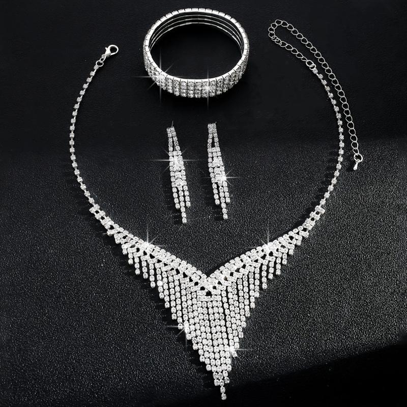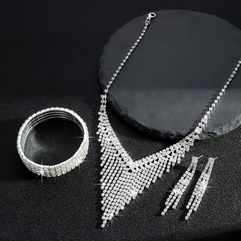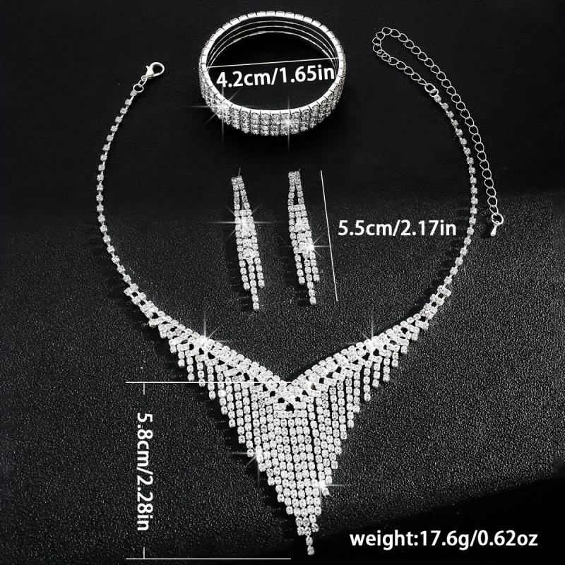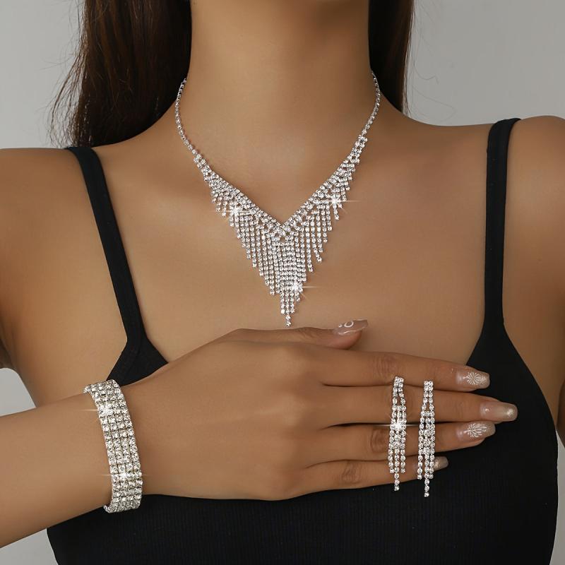 Elevate your bridal look with this fashionable jewelry set featuring a tassel necklace, matching bracelet, and earrings.