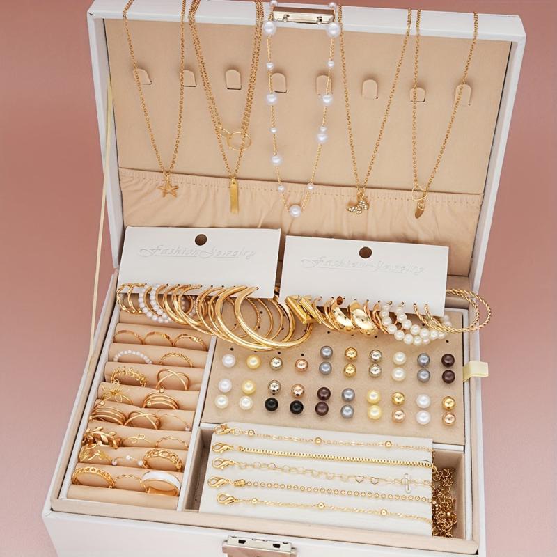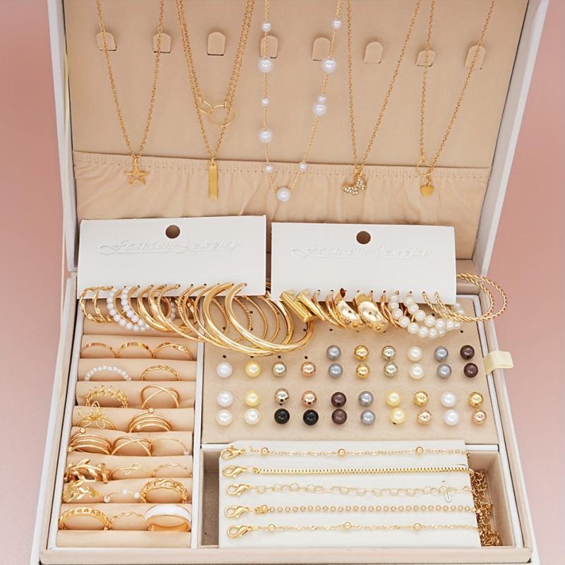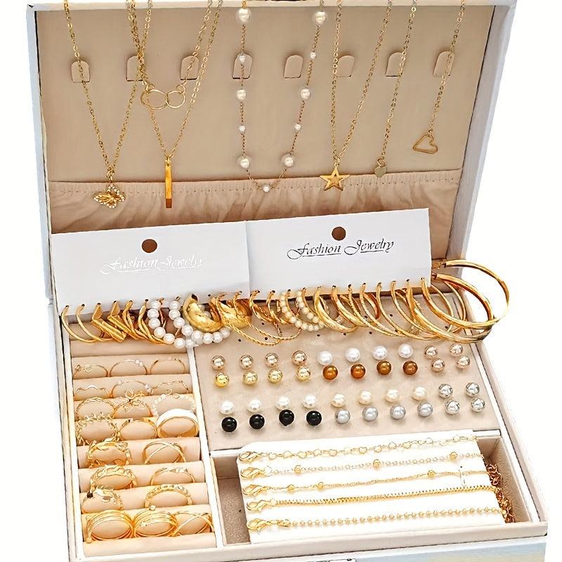 Elevate your casual or festive attire with this 91-piece jewelry set that includes earrings, necklace, ring, and bracelet. Suitable for various occasions.