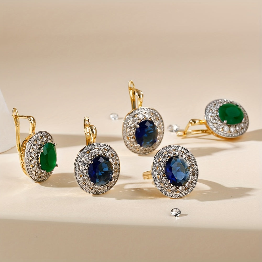 Complete your party look with this stunning two-tone oval inlaid synthetic zirconia earrings and ring set. The set is 14K golden plated, making it perfect for a party or banquet.