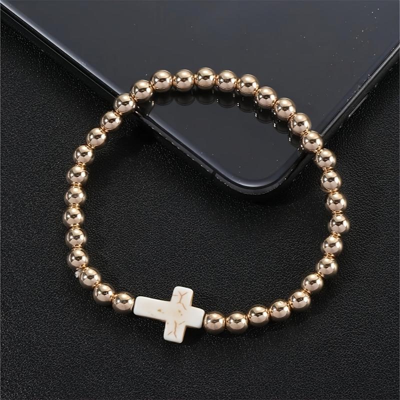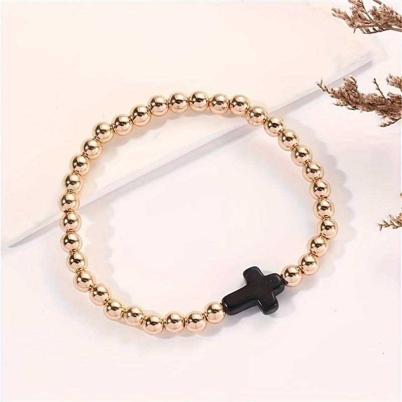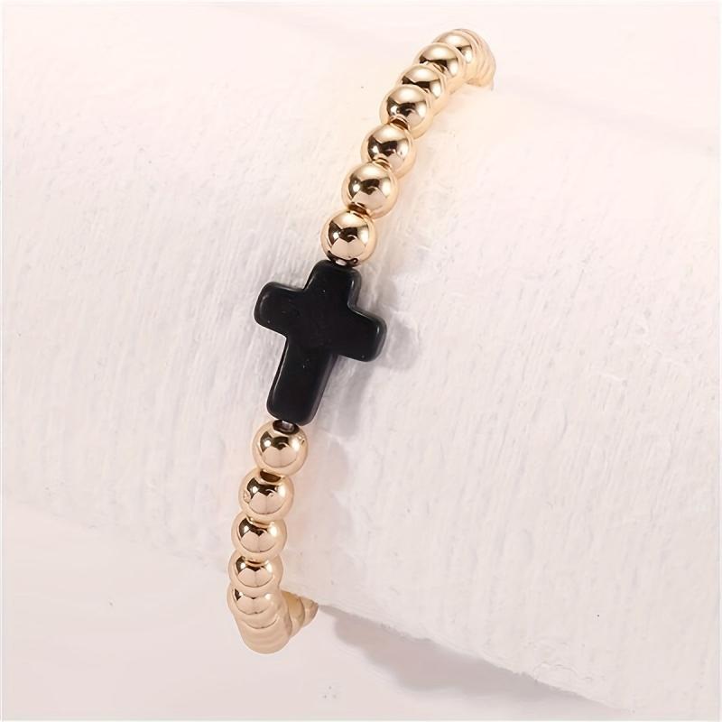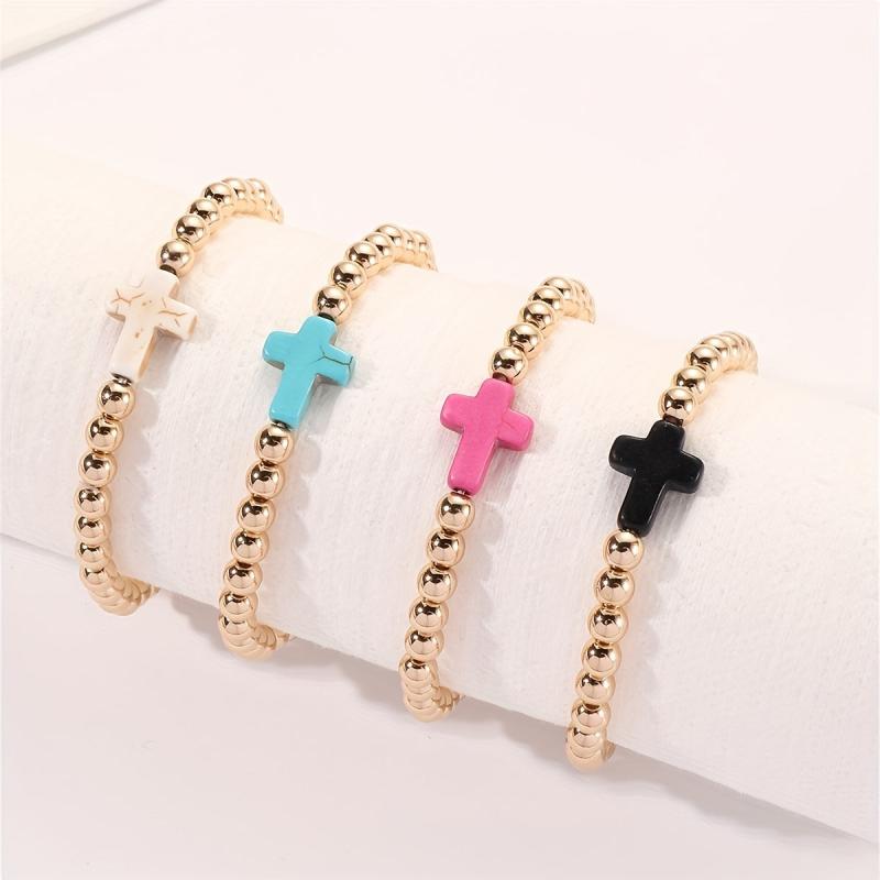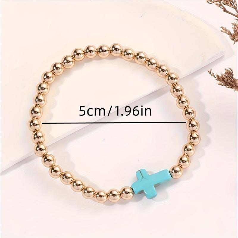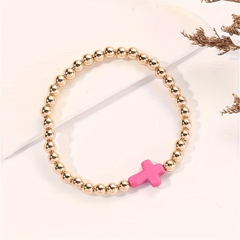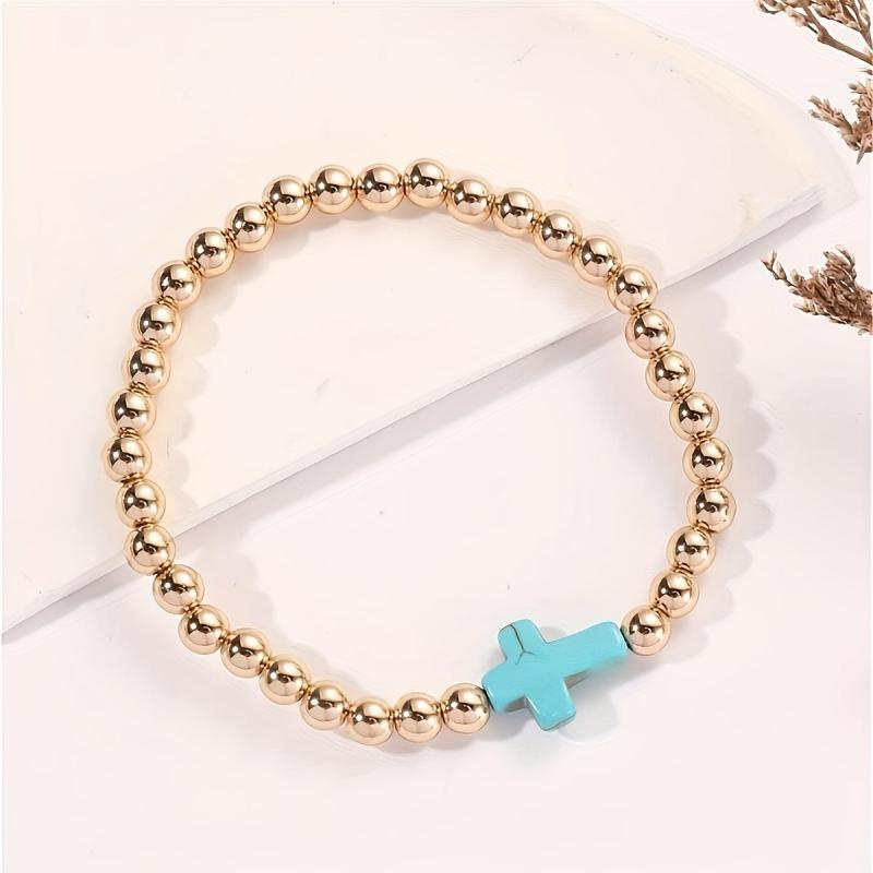 Add a touch of elegance to your outfit with this stylish cross bead bracelet. The mix of turquoise and pink beads, along with cross charms and golden tone accents, make it a versatile accessory for both everyday wear and special occasions.