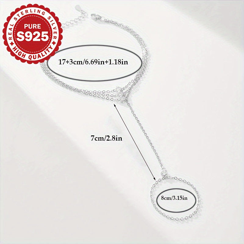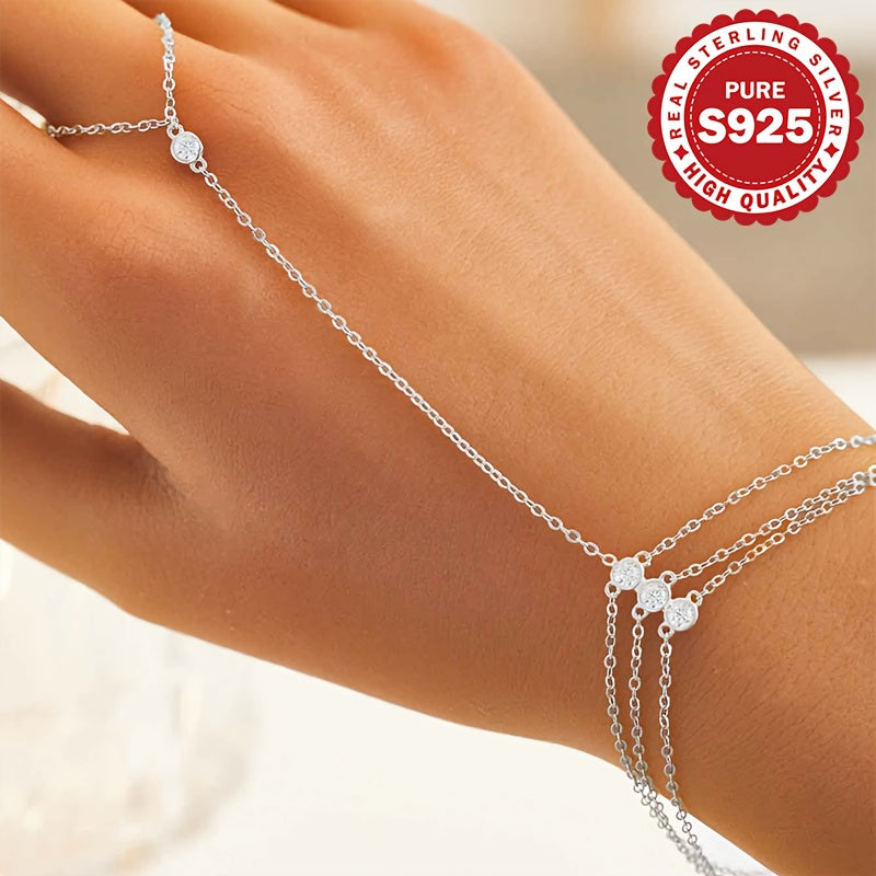 This elegant finger chain features three layers of linked S925 pure silver with synthetic zircon. It is suitable for all seasons and makes a lovely gift. The chain is lightweight and low in allergy potential.