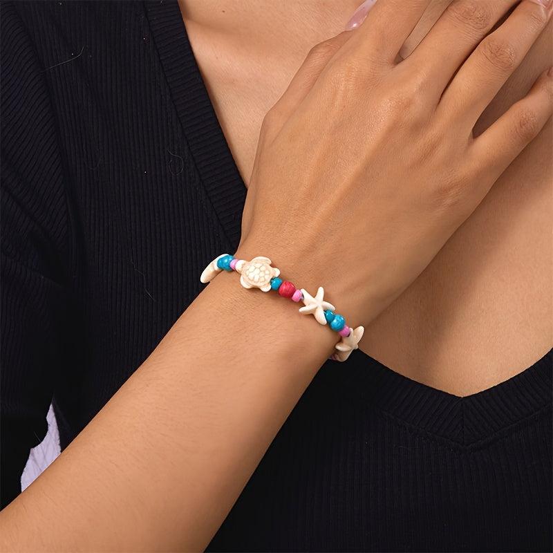 Elevate your beach look with this fresh beaded starfish and rice bead bracelet. Perfect for vacation parties, holidays, and beach outings.