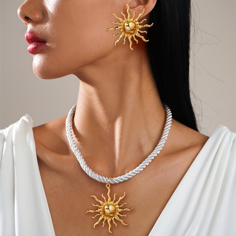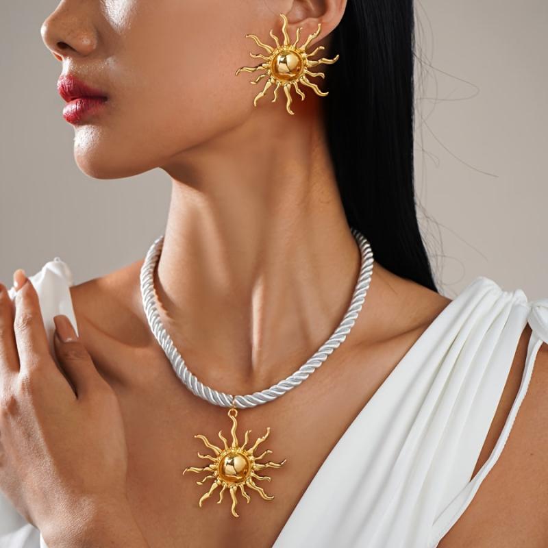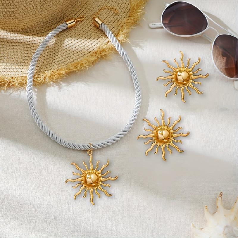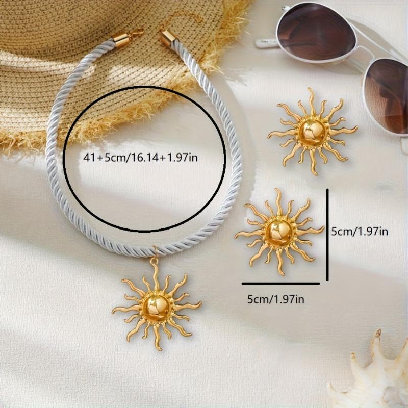 Enhance your style with this two-piece jewelry set featuring a sun pendant on a twisted rope necklace and matching earrings. Perfect for daily wear, parties, or vacations.