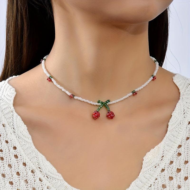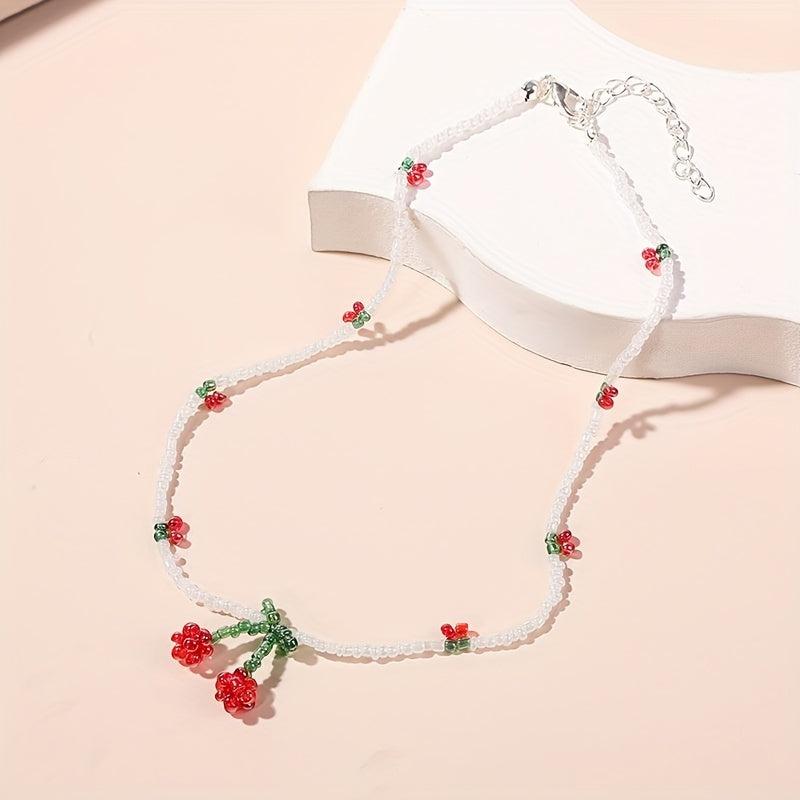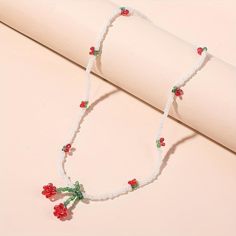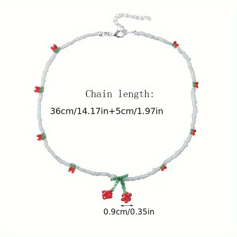 Y2K Cherry Bead Necklace Red & Green Charms Chain Summer Jewelry Women