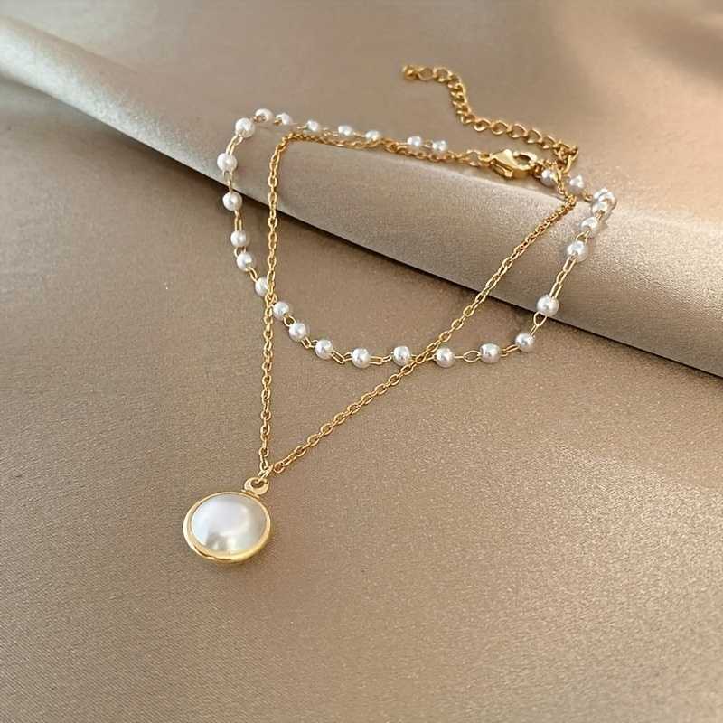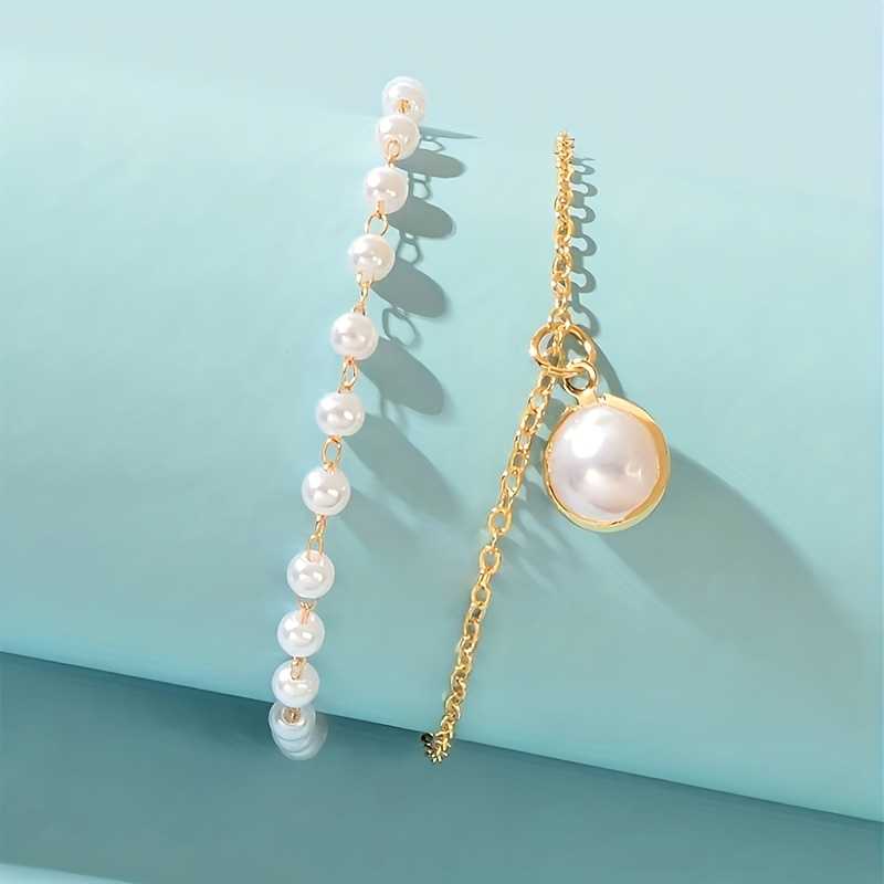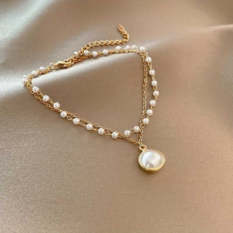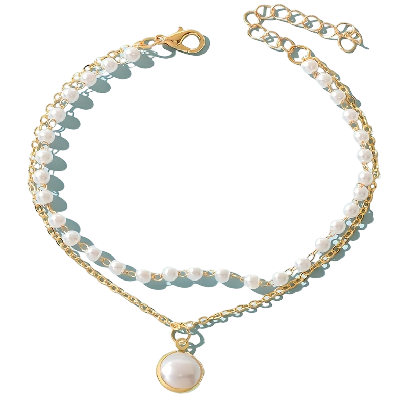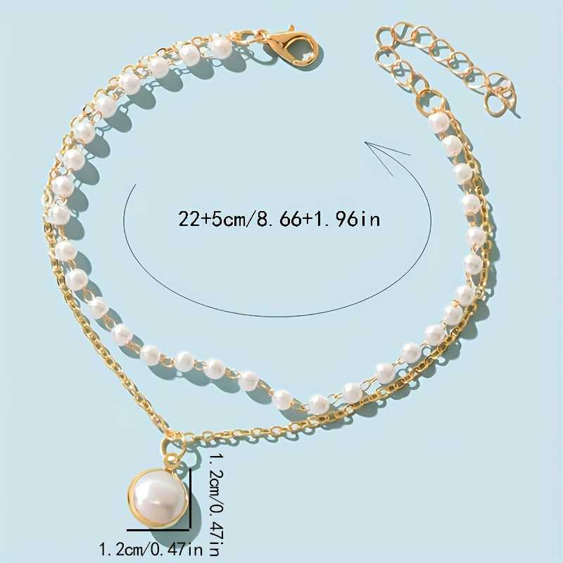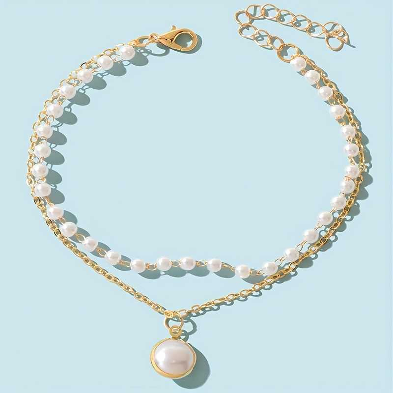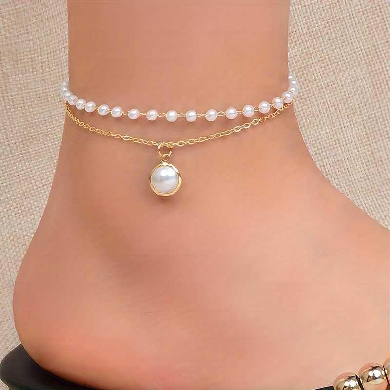 Bracelet de cheville pour femme plaqué or, double couche de perles blanches et chaîne pendante