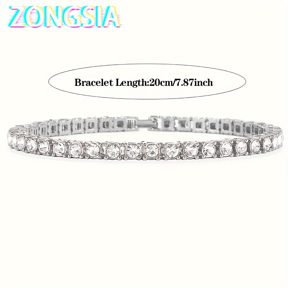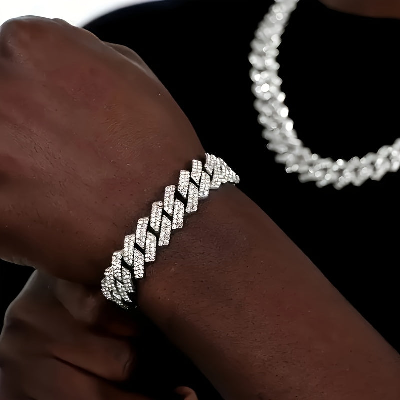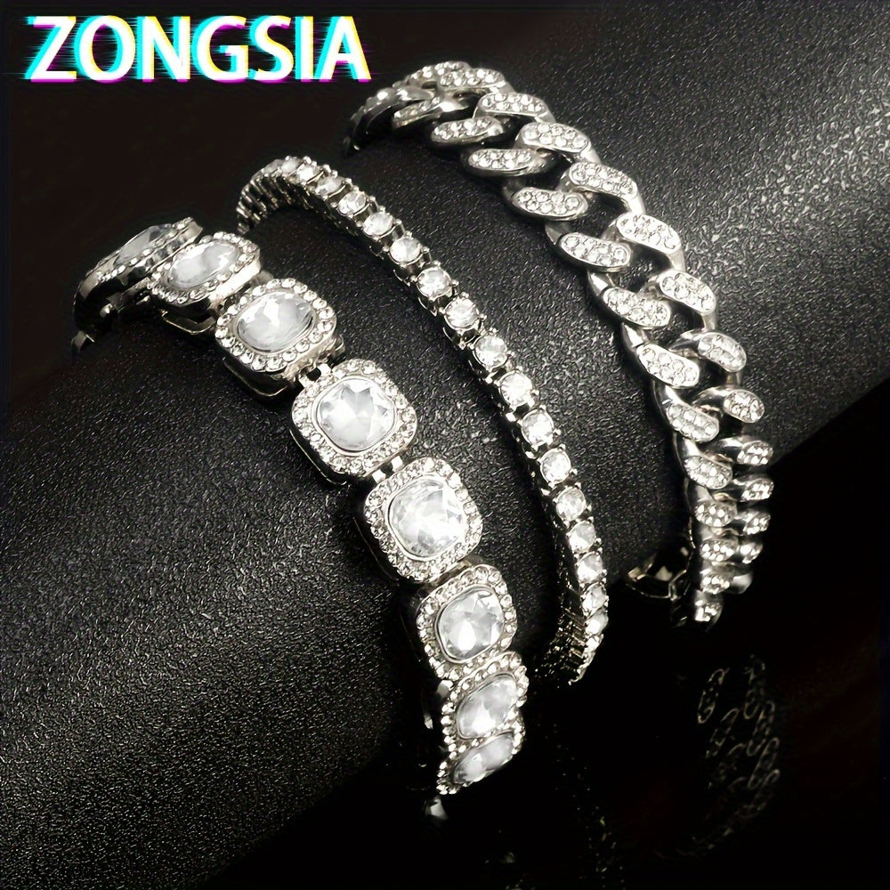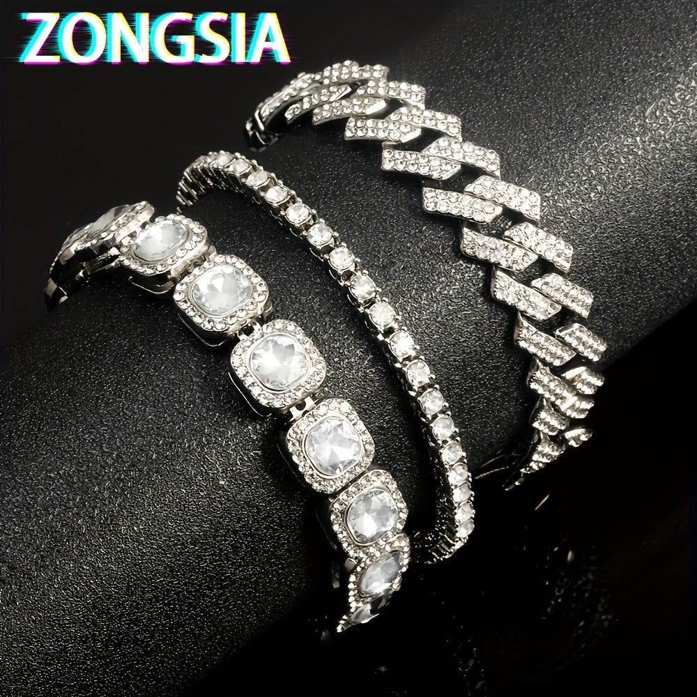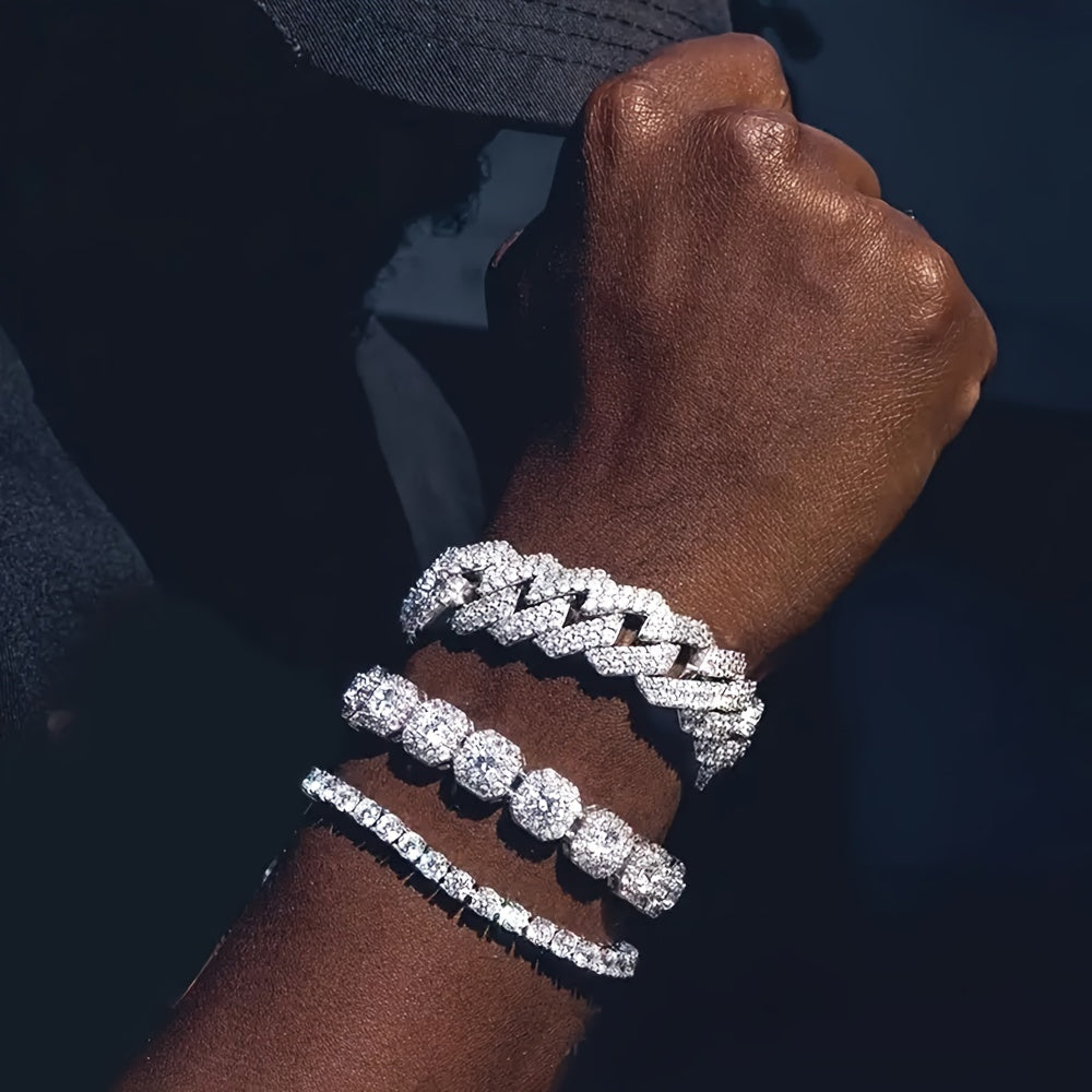 This 3-piece bracelet set includes a Cuban chain, tennis chain, and sugar chain. The silvery finish adds a stylish touch to any outfit. Perfect for hip hop and punk enthusiasts. Makes a great gift for men and women.