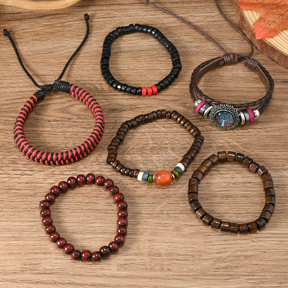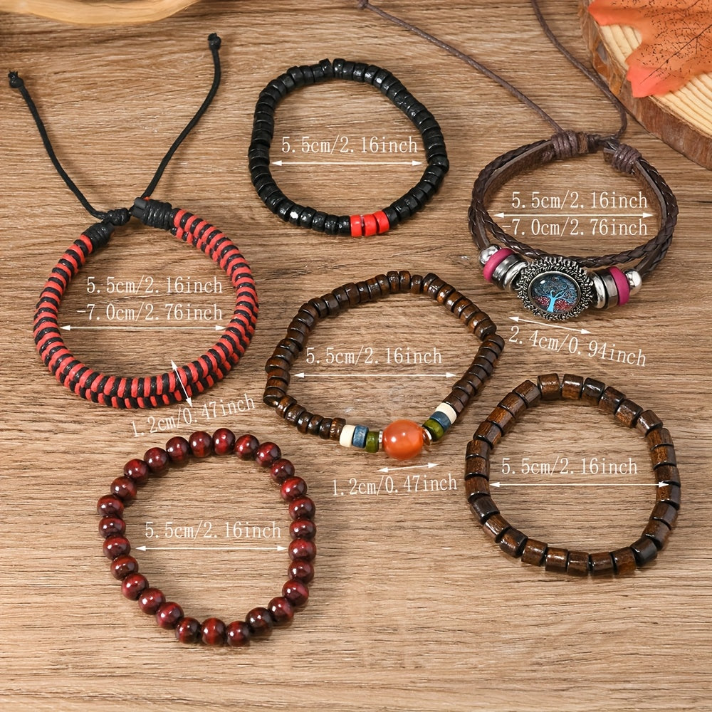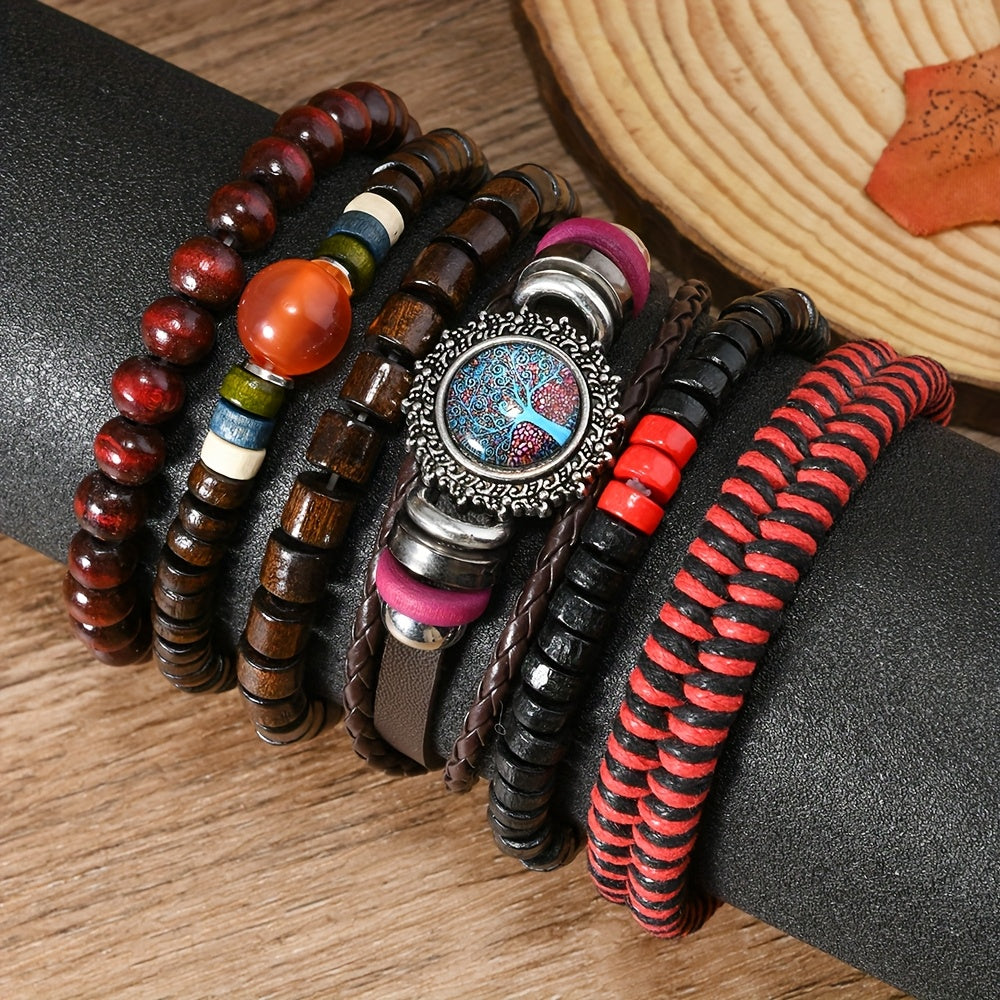 This set includes 6 Gothic retro faux leather bracelets with braided and beaded design. Each bracelet has wooden beads, cat's eye stones, and inlaid glass. The tree of life pattern adds a mystical touch.
