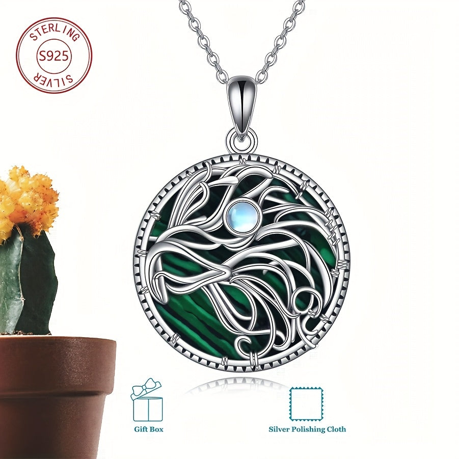 This stunning eagle necklace is made of sterling silver with synthetic moonstone and synthetic malachite, perfect for both women and men.