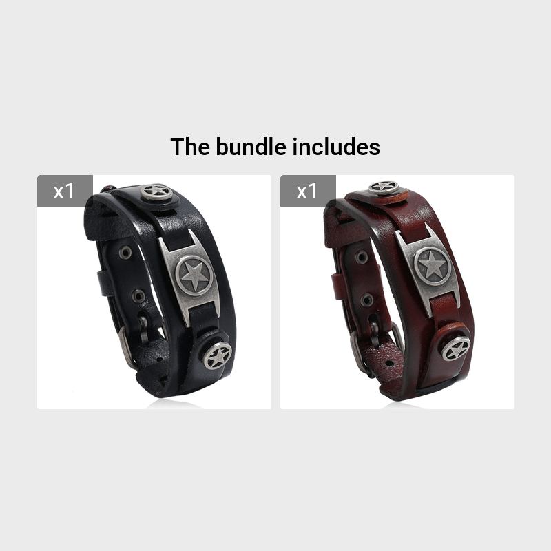 Make a bold statement with this punk rock leather bracelet featuring zinc alloy metal five star detail. Perfect for casual wear and adding a touch of edgy style to your outfit.