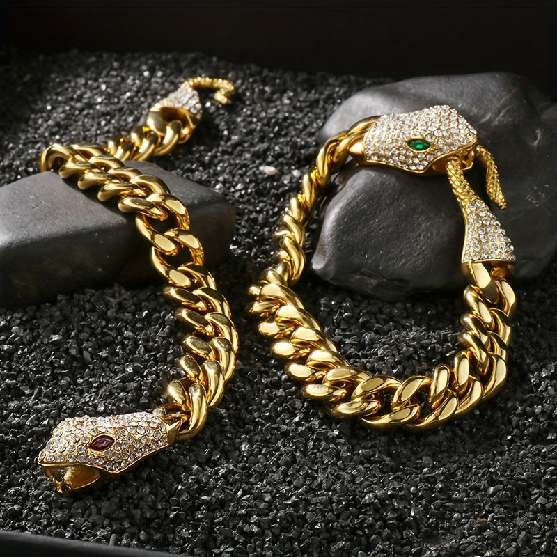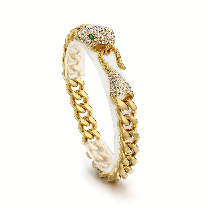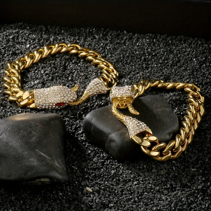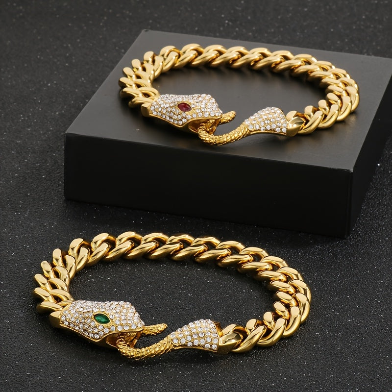 Men's Cuban Link Bracelet with Snake Head Charm Golden Tone Stainless Steel Chai