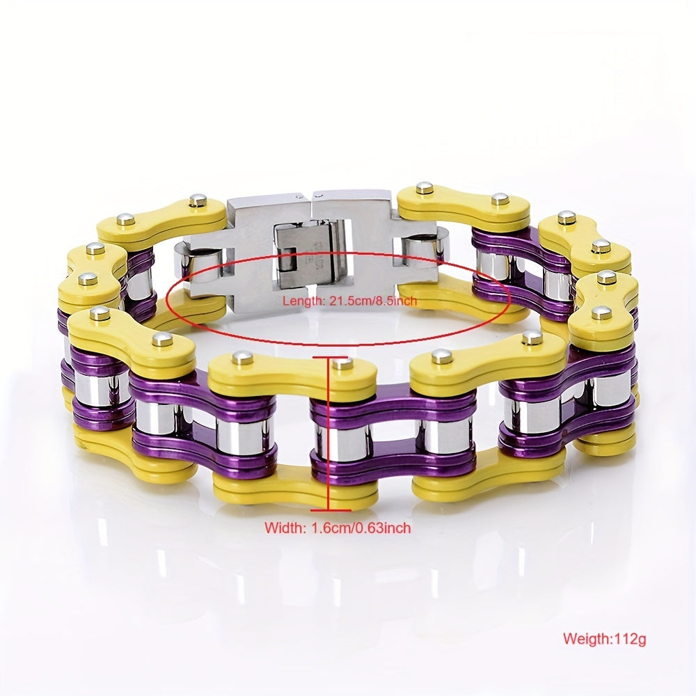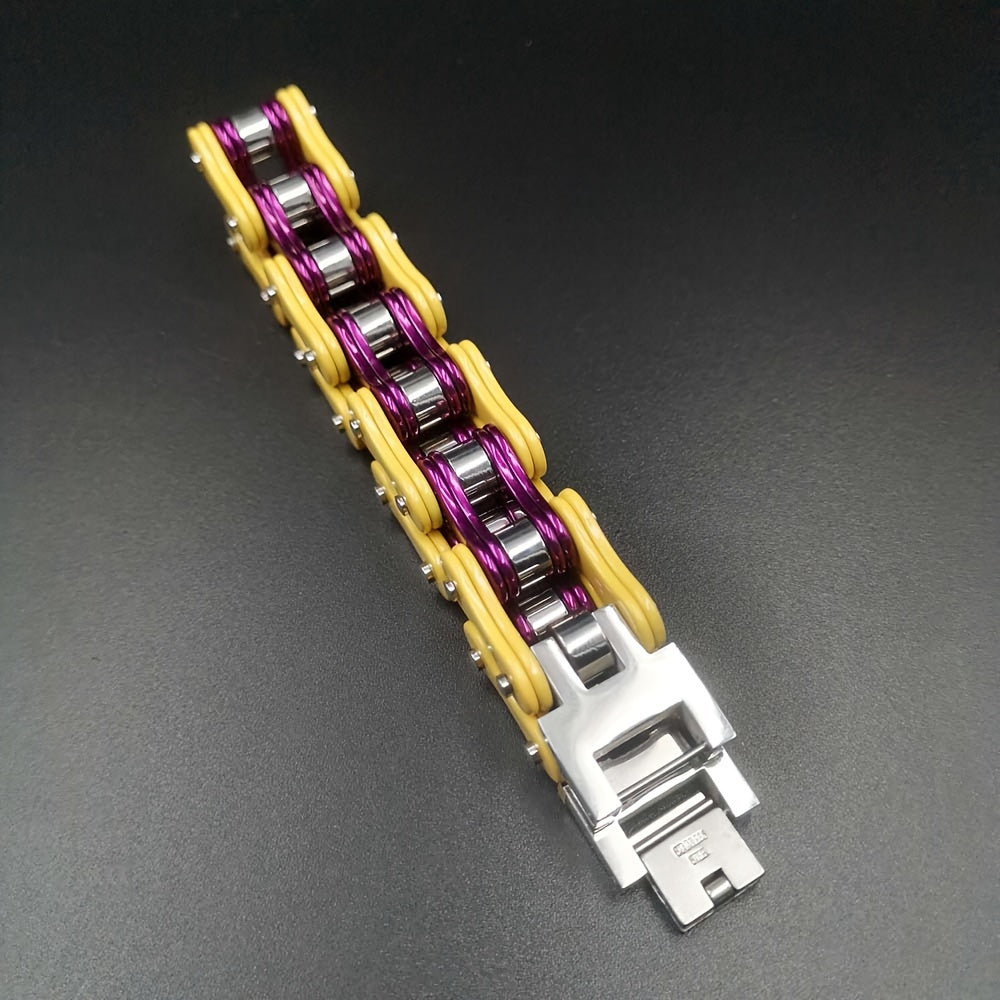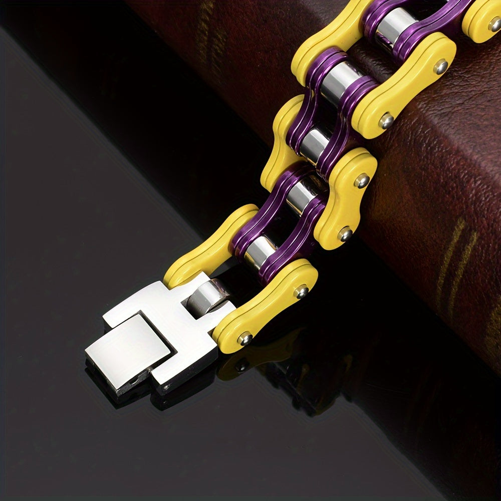 Add a touch of punk rock style to your look with this stainless steel bracelet featuring yellow and purple chain links. Perfect for hip hop enthusiasts and motorcycle riders.