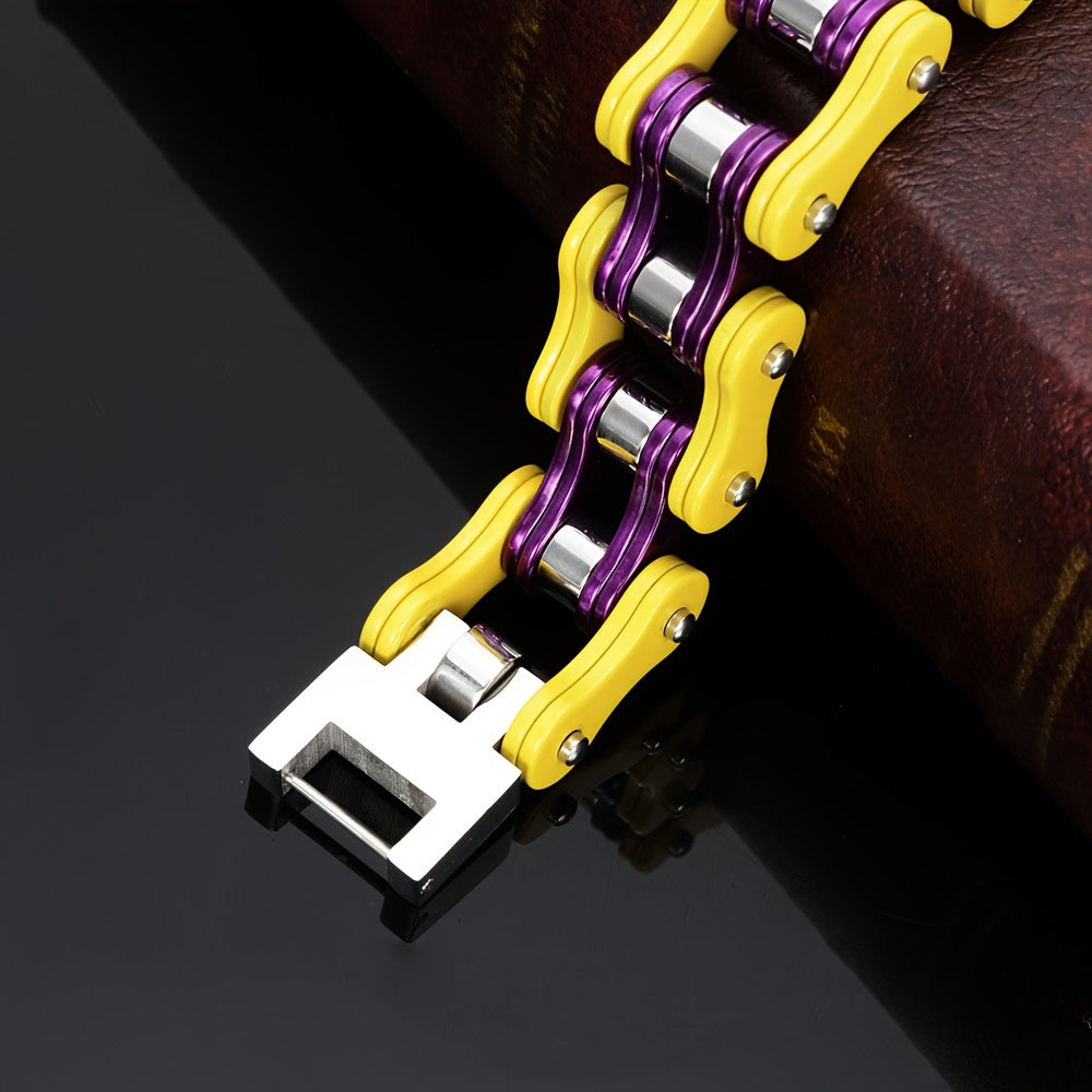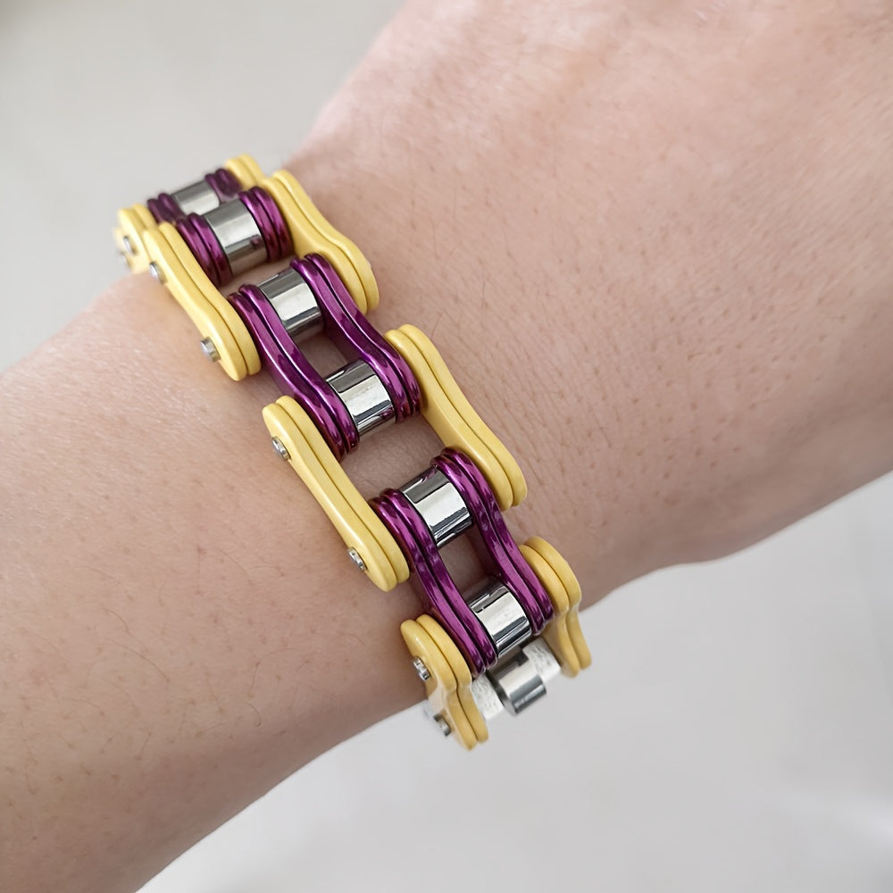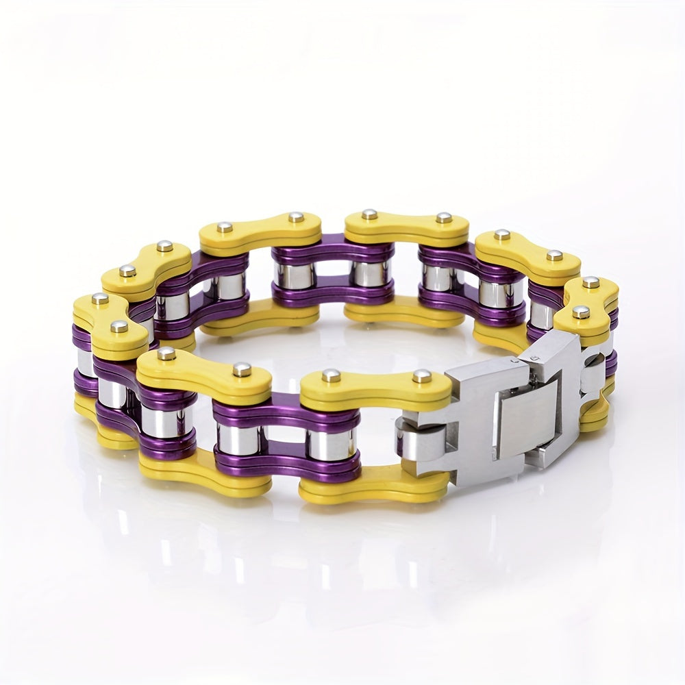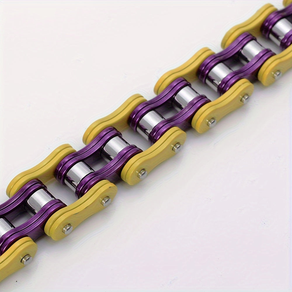 Add a touch of punk rock style to your look with this stainless steel bracelet featuring yellow and purple chain links. Perfect for hip hop enthusiasts and motorcycle riders.