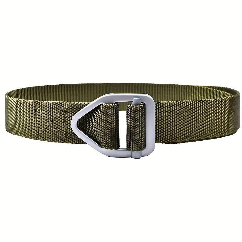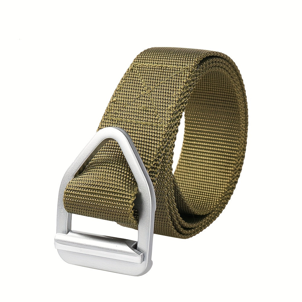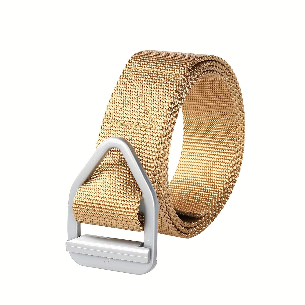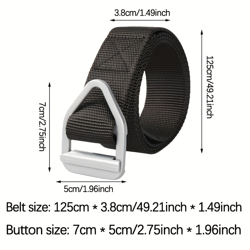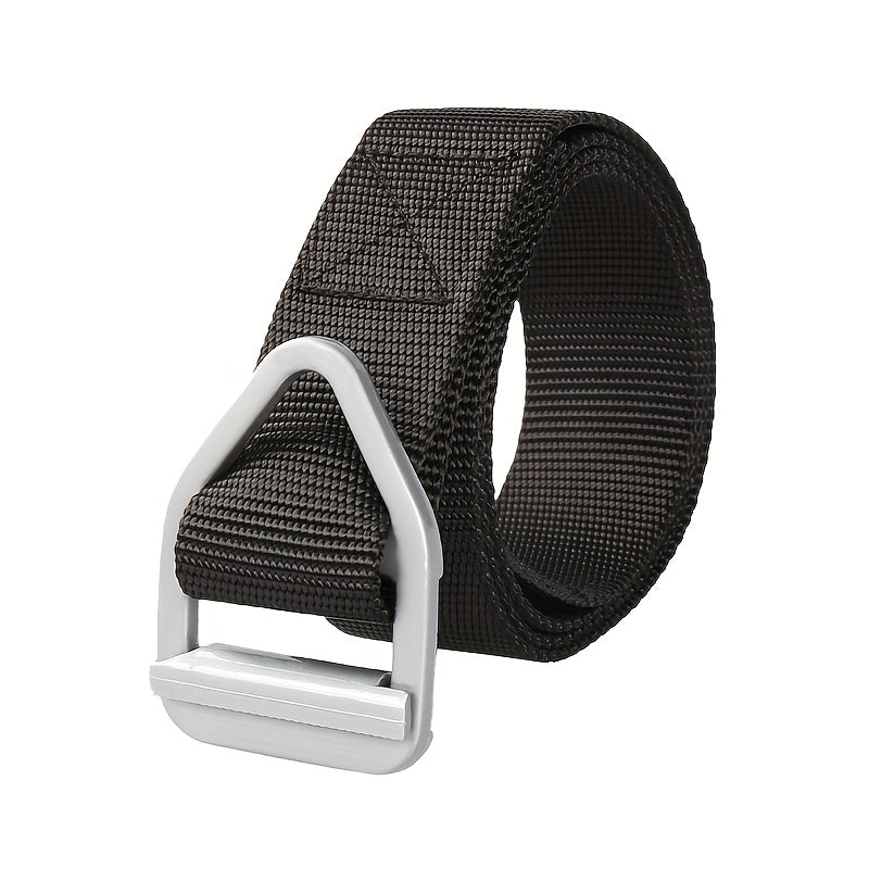 This belt is made of durable nylon material with an alloy triangular buckle, perfect for sports and casual wear.