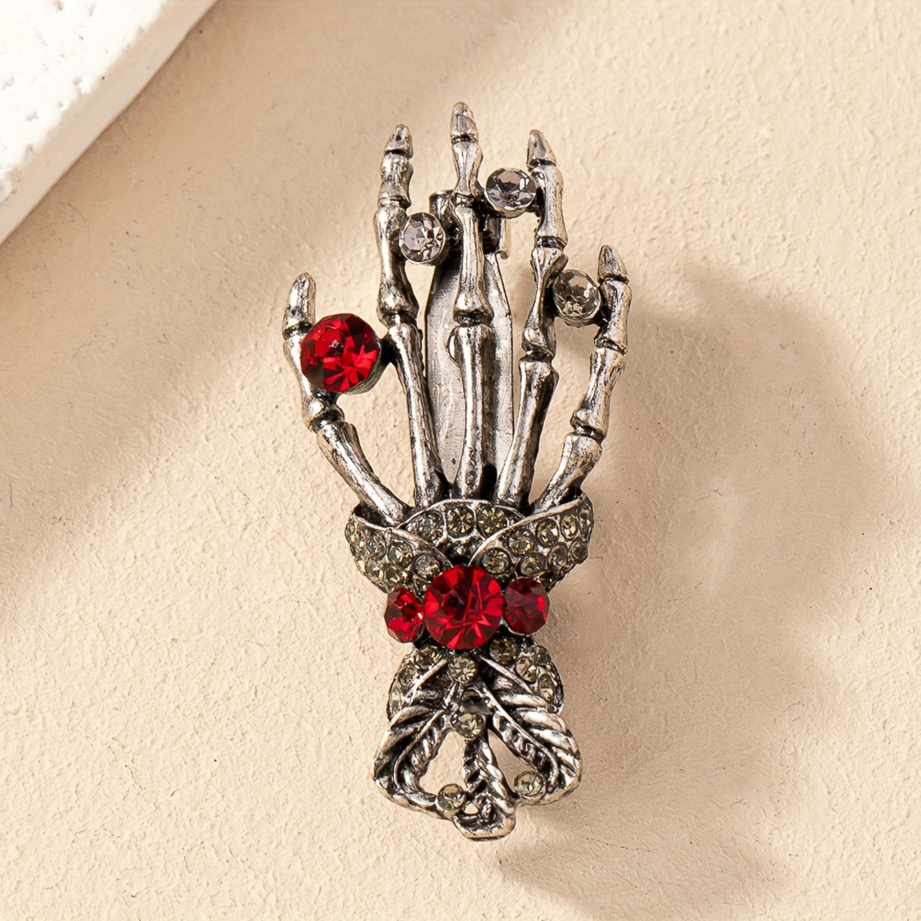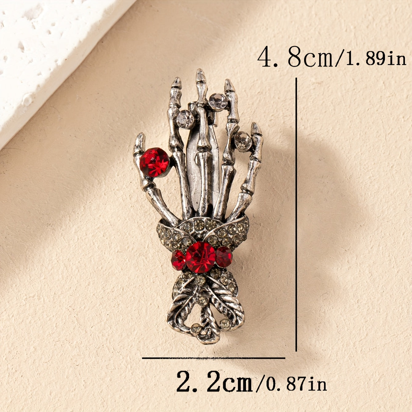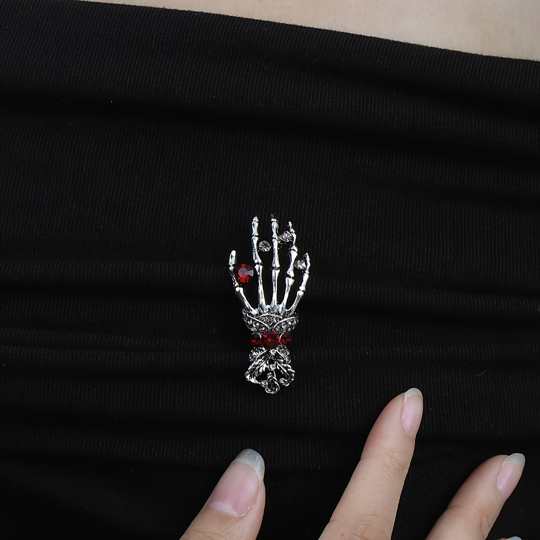 Add a touch of punk gothic style with this skull hand brooch pin featuring inlaid red rhinestone. Perfect for Halloween or everyday wear.