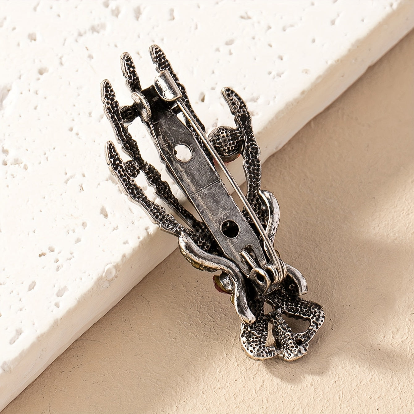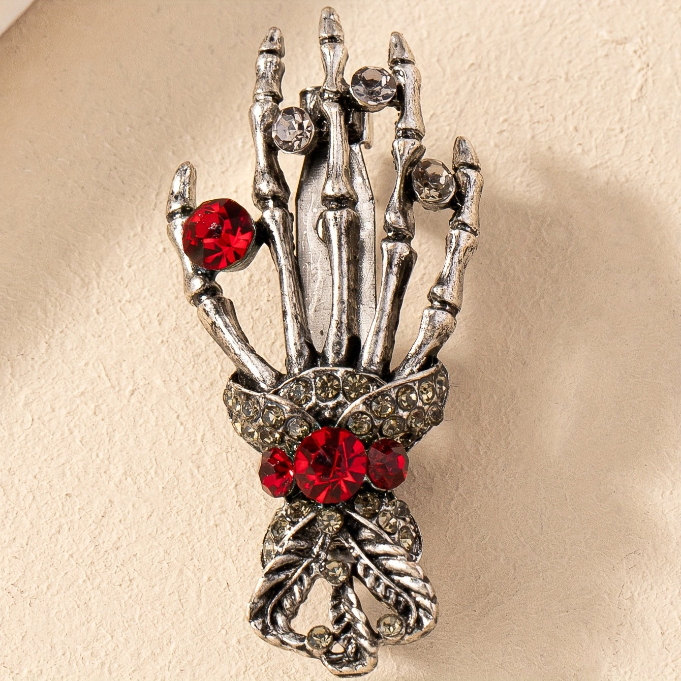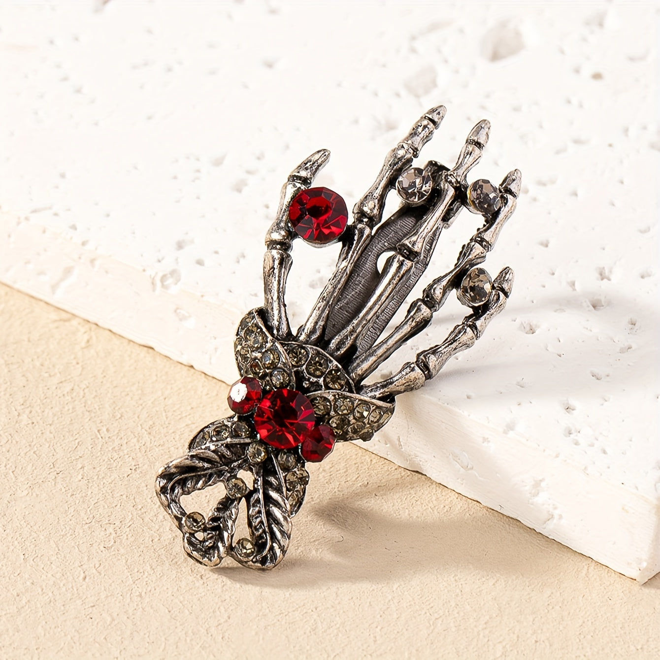 Add a touch of punk gothic style with this skull hand brooch pin featuring inlaid red rhinestone. Perfect for Halloween or everyday wear.