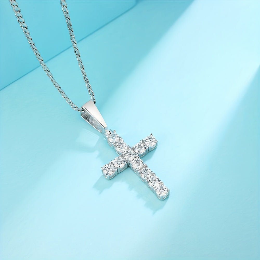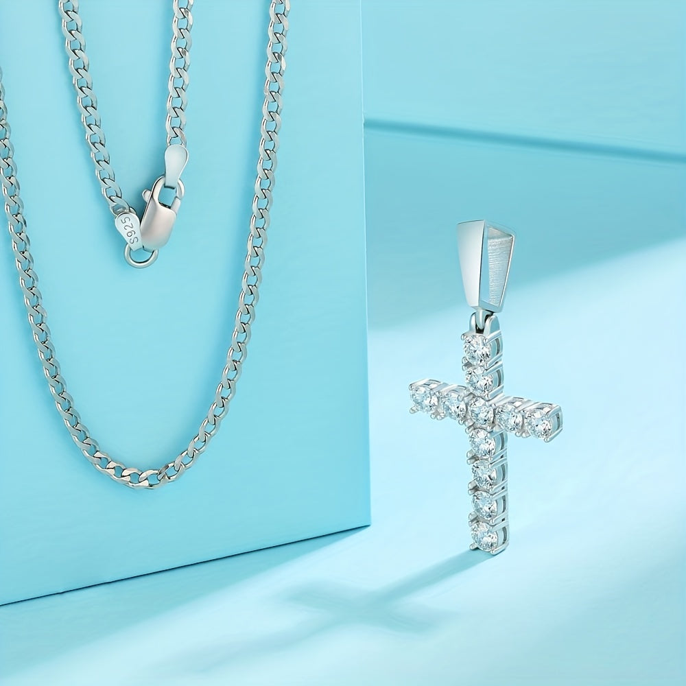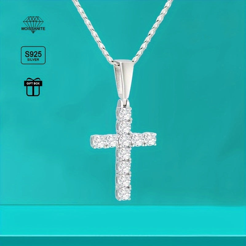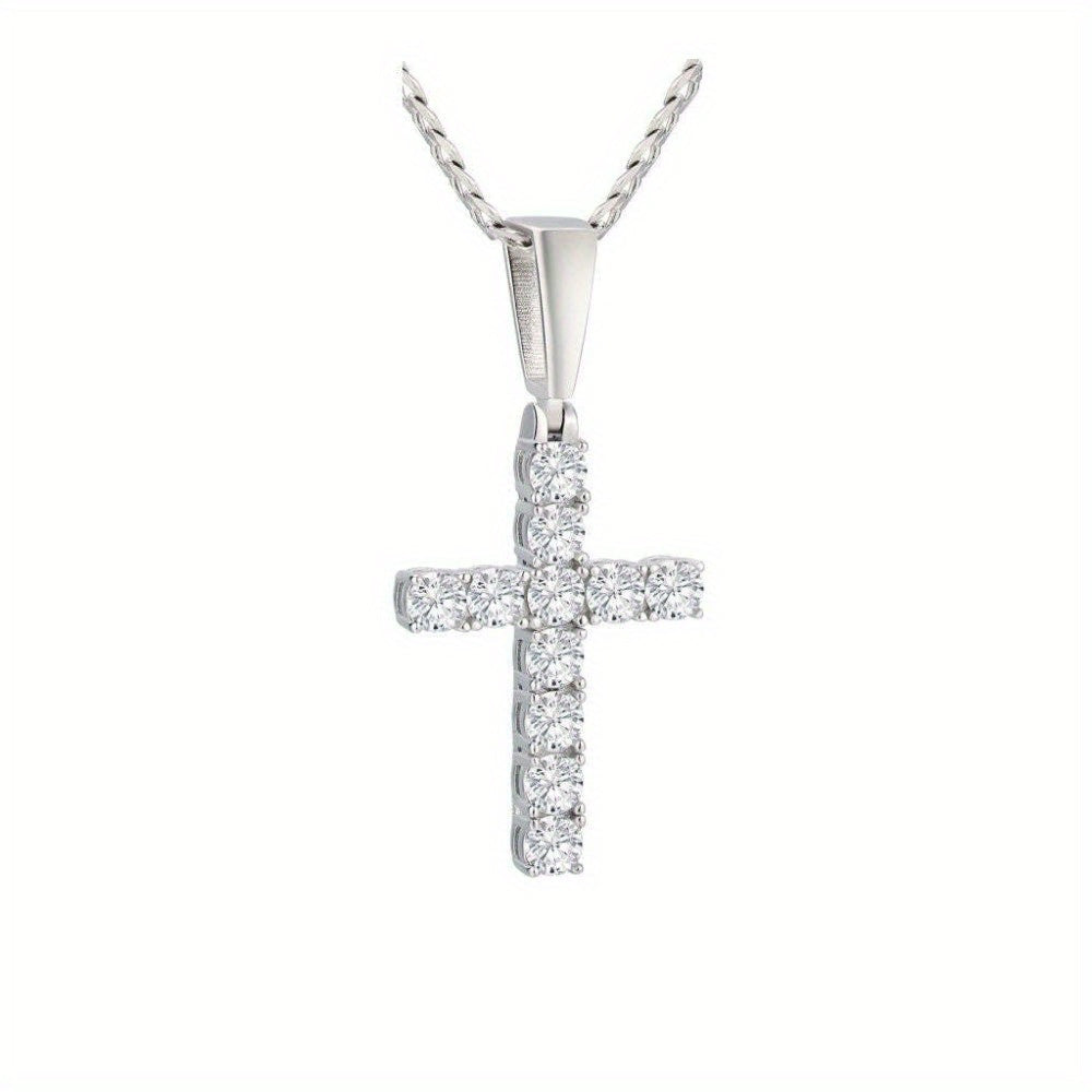 This silvery moissanite cross necklace is perfect for men and women. It features a classic and versatile design, making it a great accessory for any outfit. The minimalist pendant adds a touch of elegance to your look.
