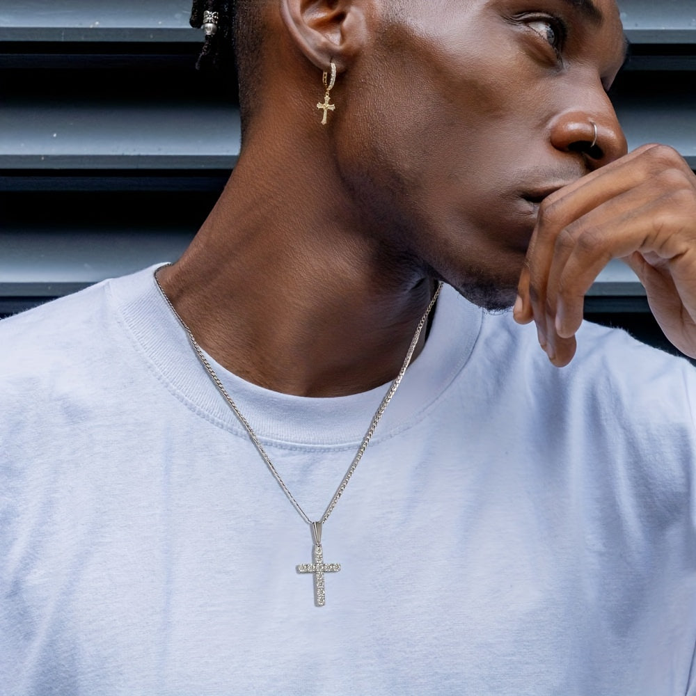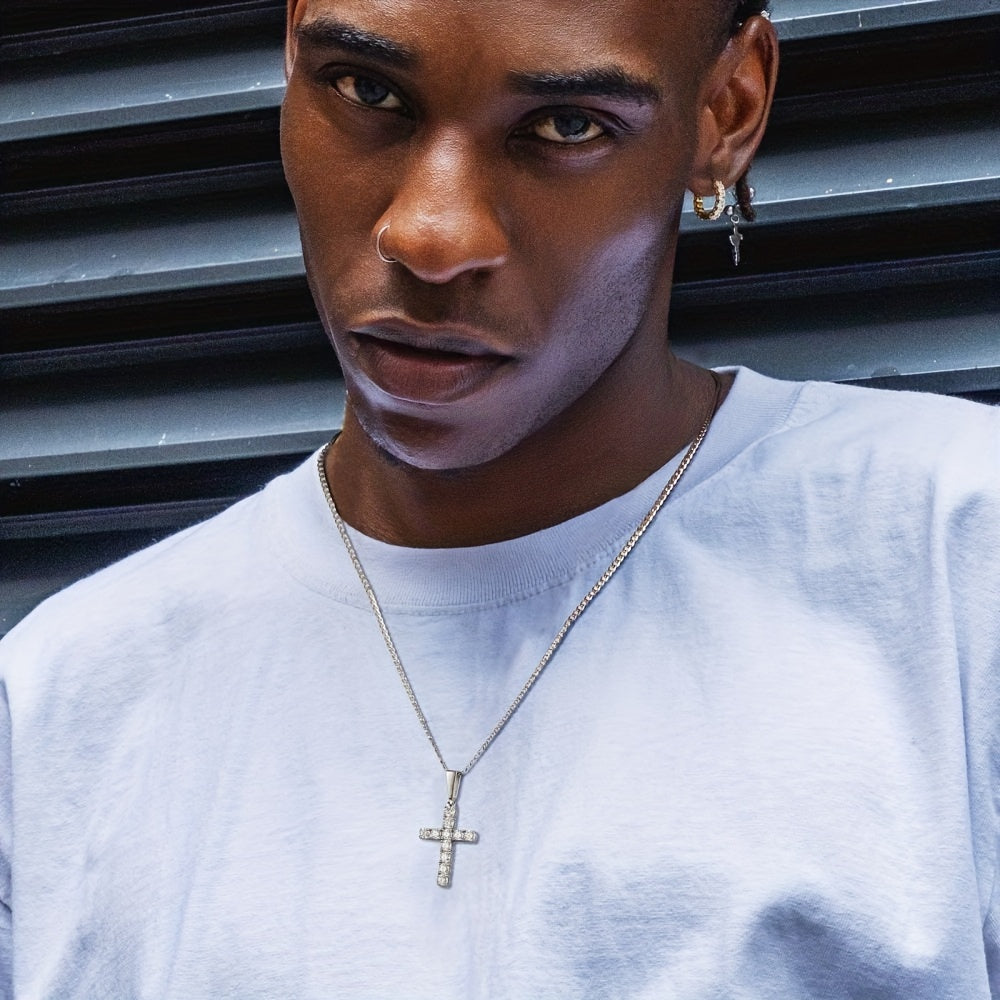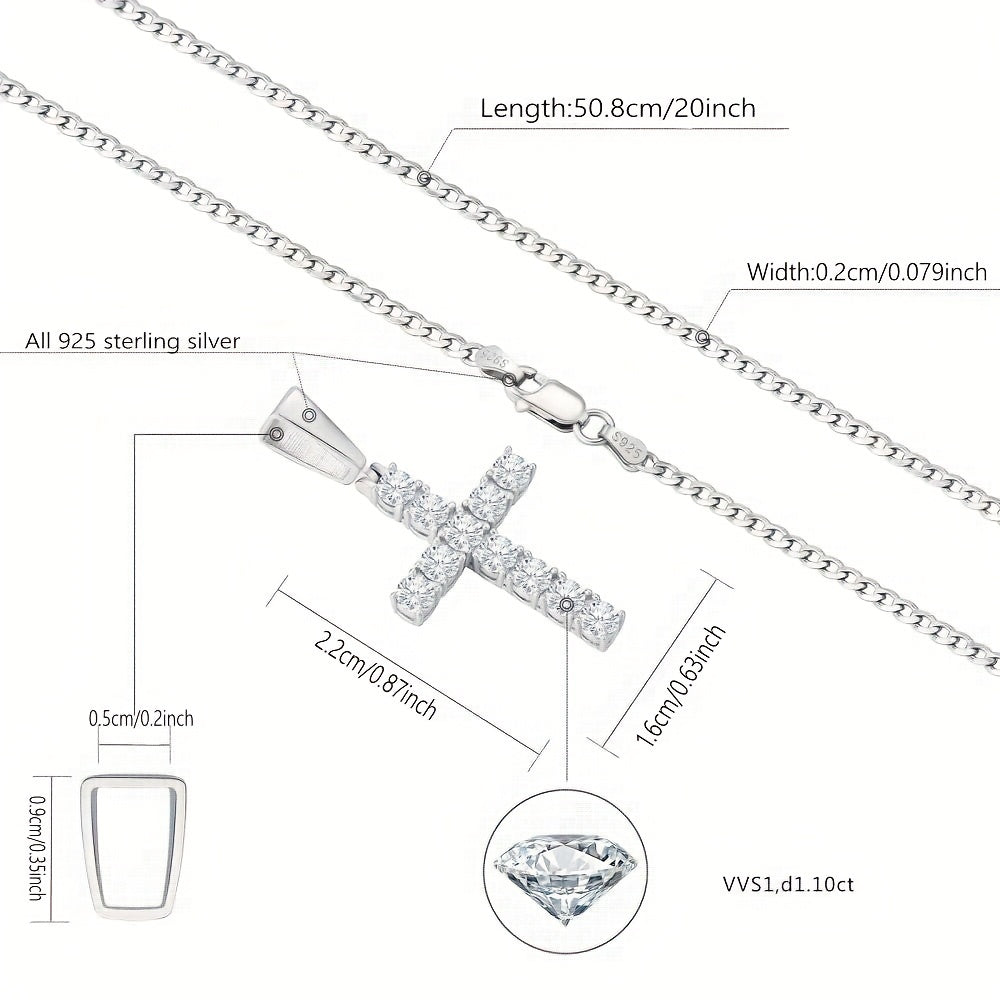 This silvery moissanite cross necklace is perfect for men and women. It features a classic and versatile design, making it a great accessory for any outfit. The minimalist pendant adds a touch of elegance to your look.