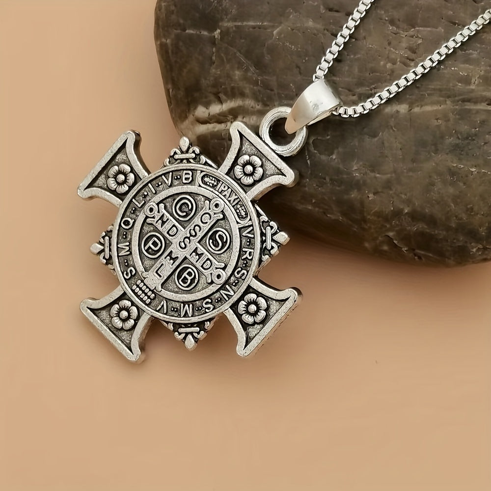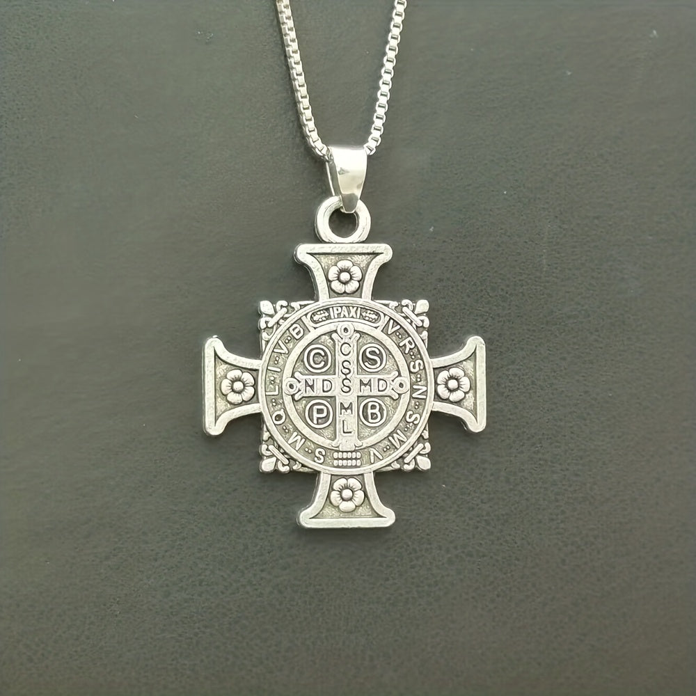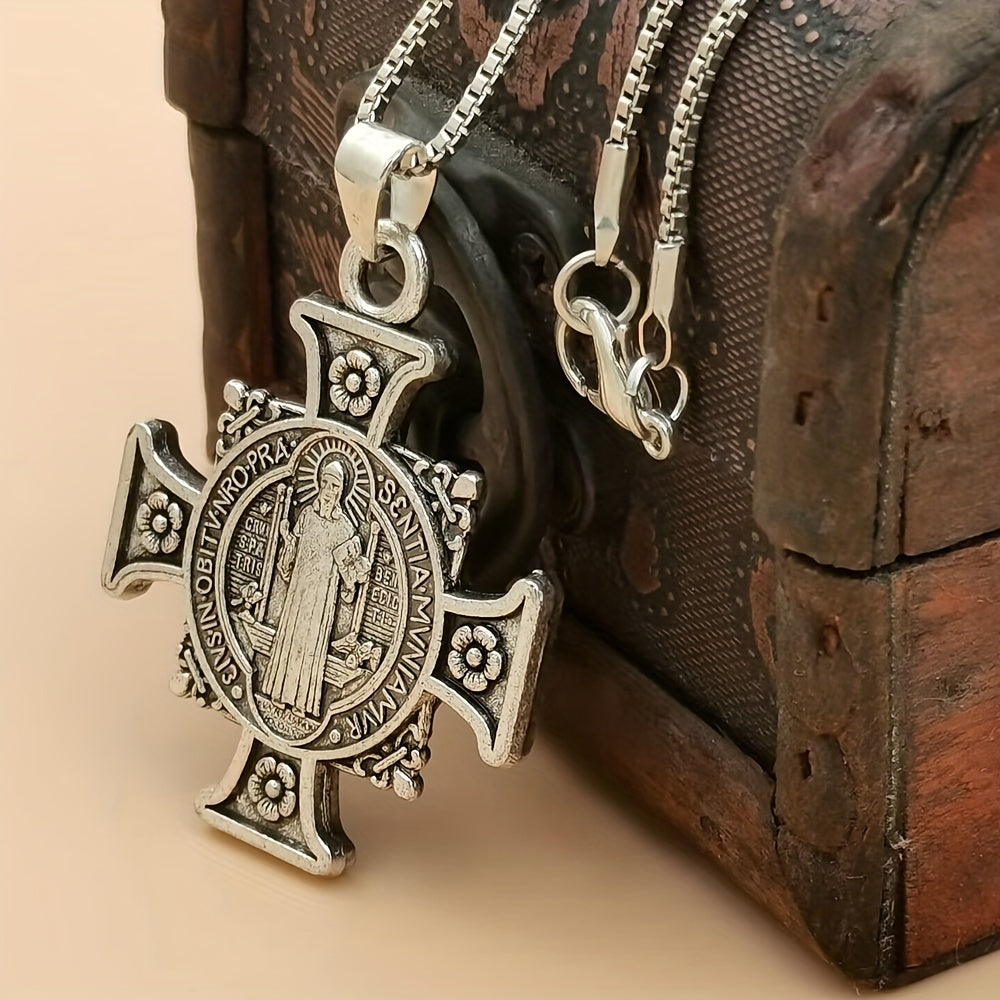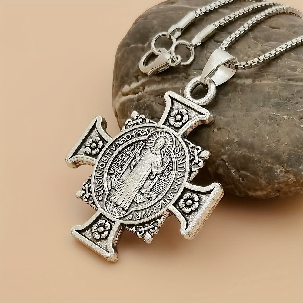 This pendant necklace features the images of St. Michael, St. Christopher, Jesus, Cross, and St. Benedict. It is a meaningful and stylish accessory for men.