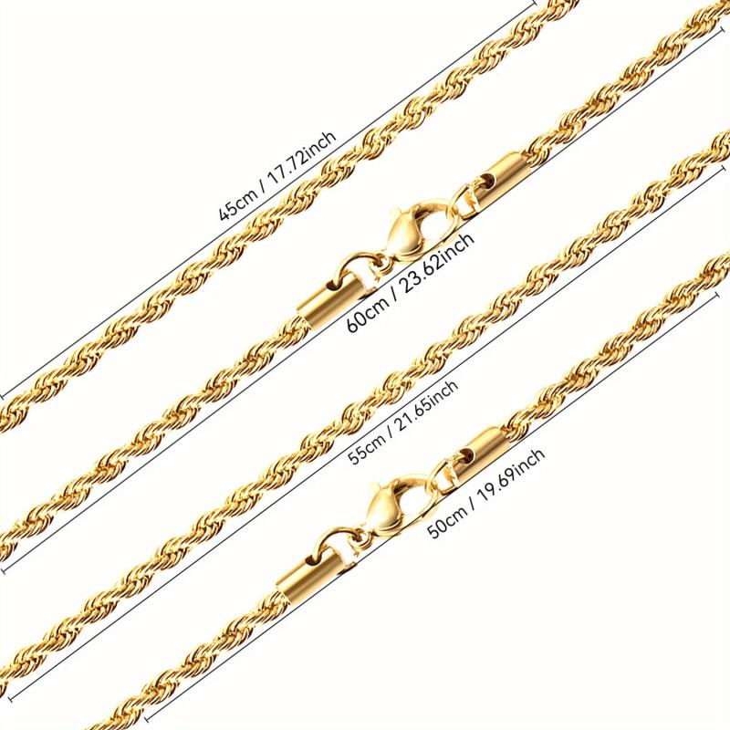 This stylish stainless steel rope chain necklace is perfect for men and women. It features a twisted design and is available in 18 to 24 inches. The chain is durable and non-fading.