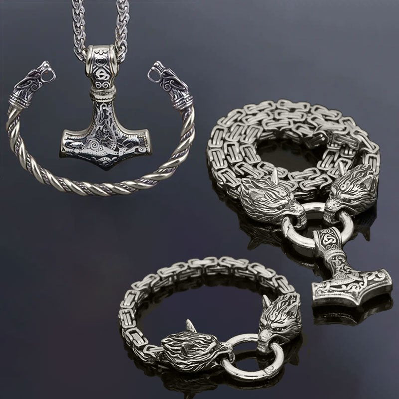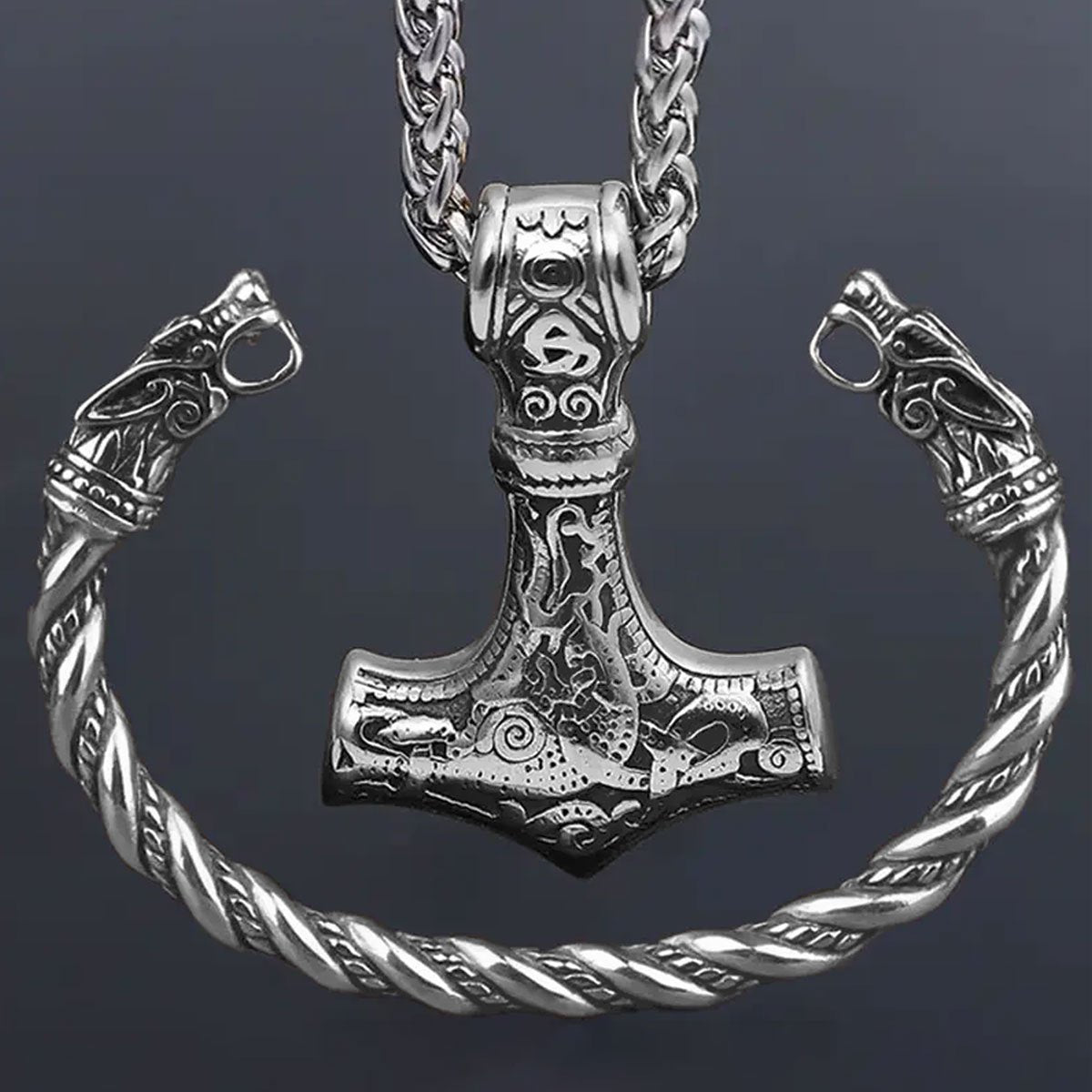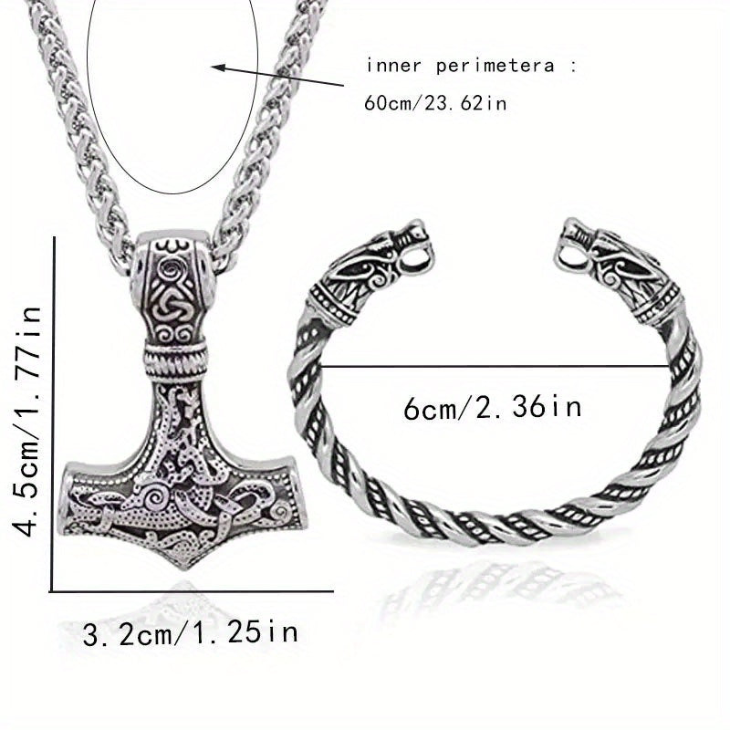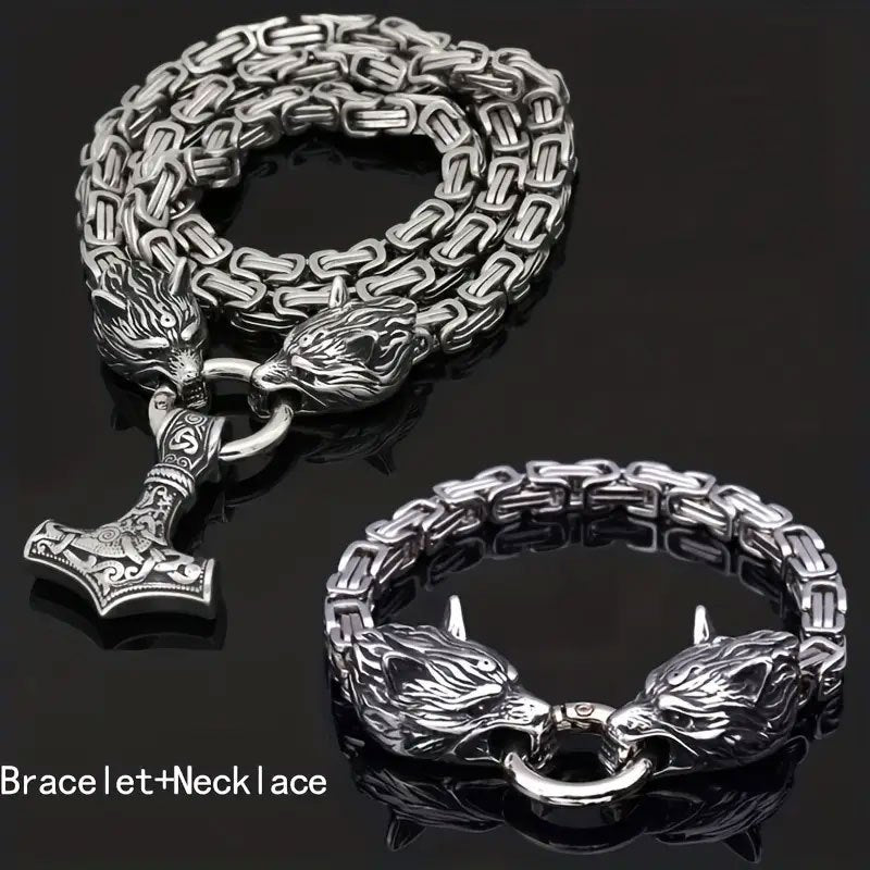 Embrace the Norse traditions with this 4-piece set featuring a Viking retro rune hammer pendant necklace and wolf head bracelet. Made of stainless steel, this set blends style and symbolism seamlessly.
