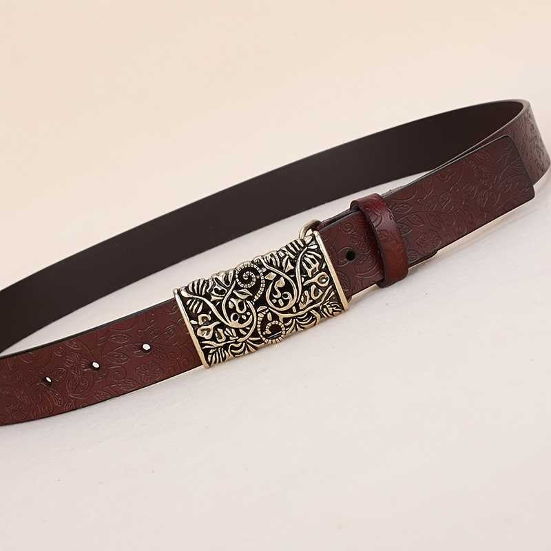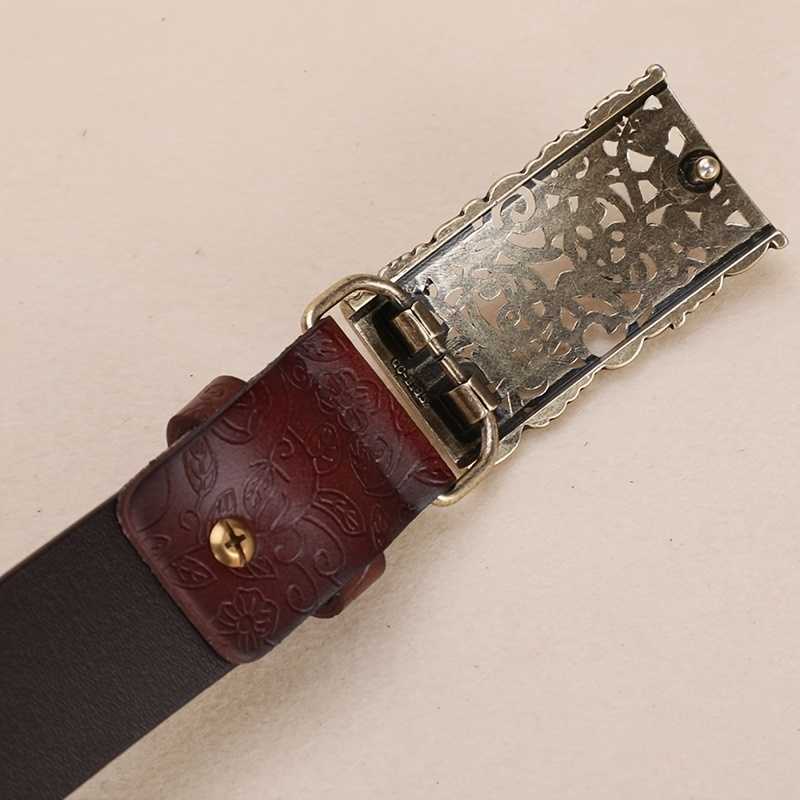 Ceinture rétro en cuir de vache véritable gaufré avec large boucle carrée gravée