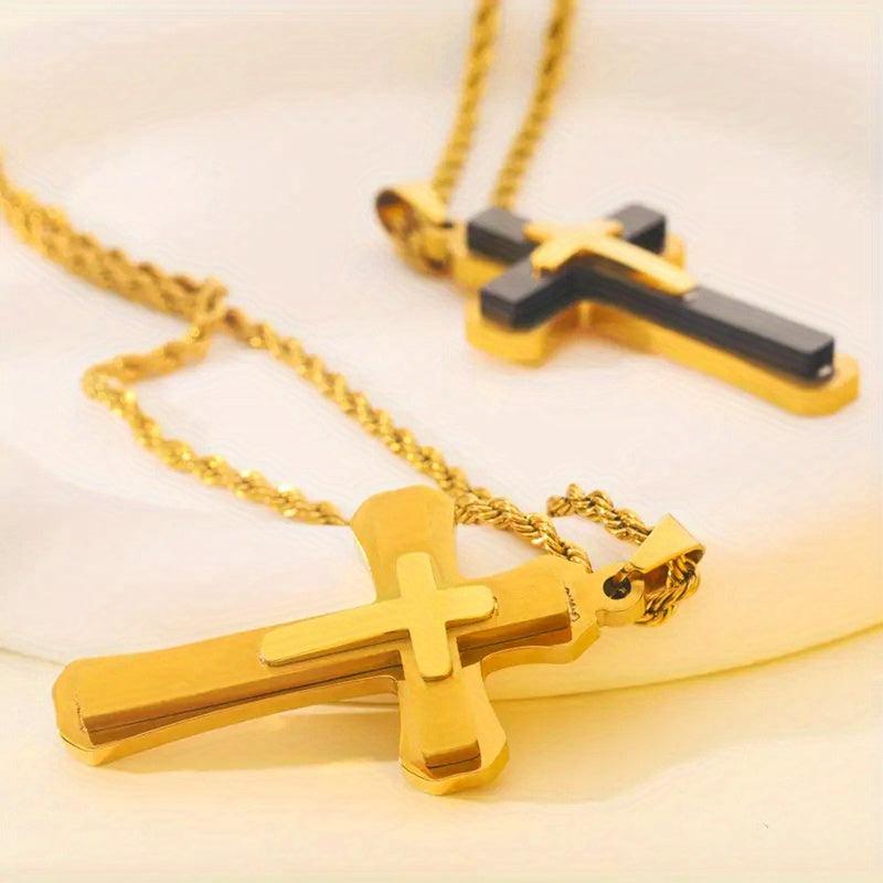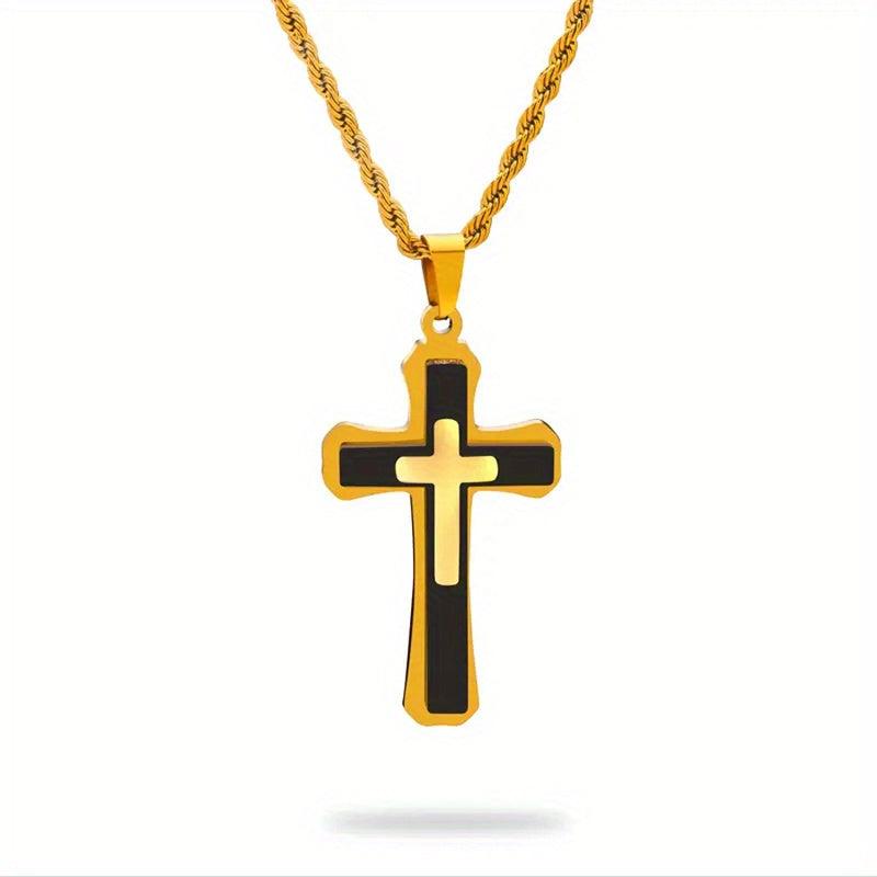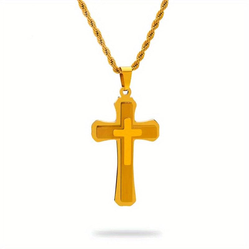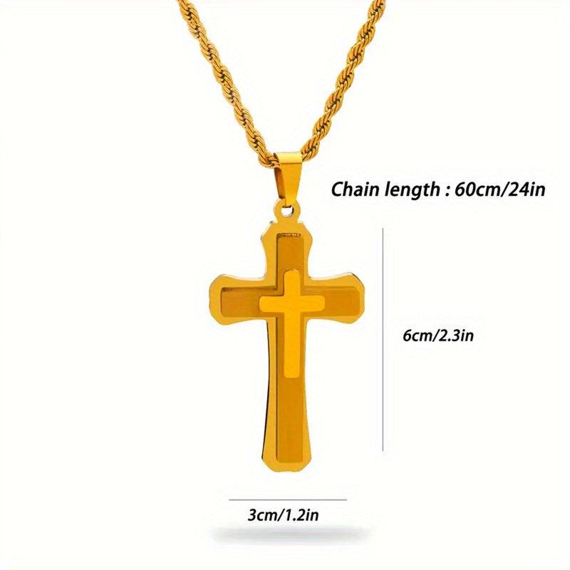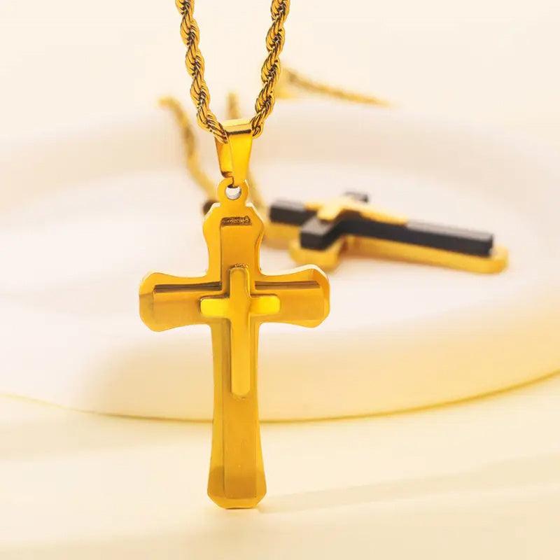 Classic cross pendant necklace with a hip hop twist, suitable for men and women. Made of 18K golden plated metal, this religious jewellery piece adds a touch of style to any outfit.
