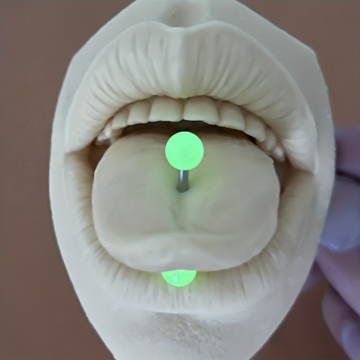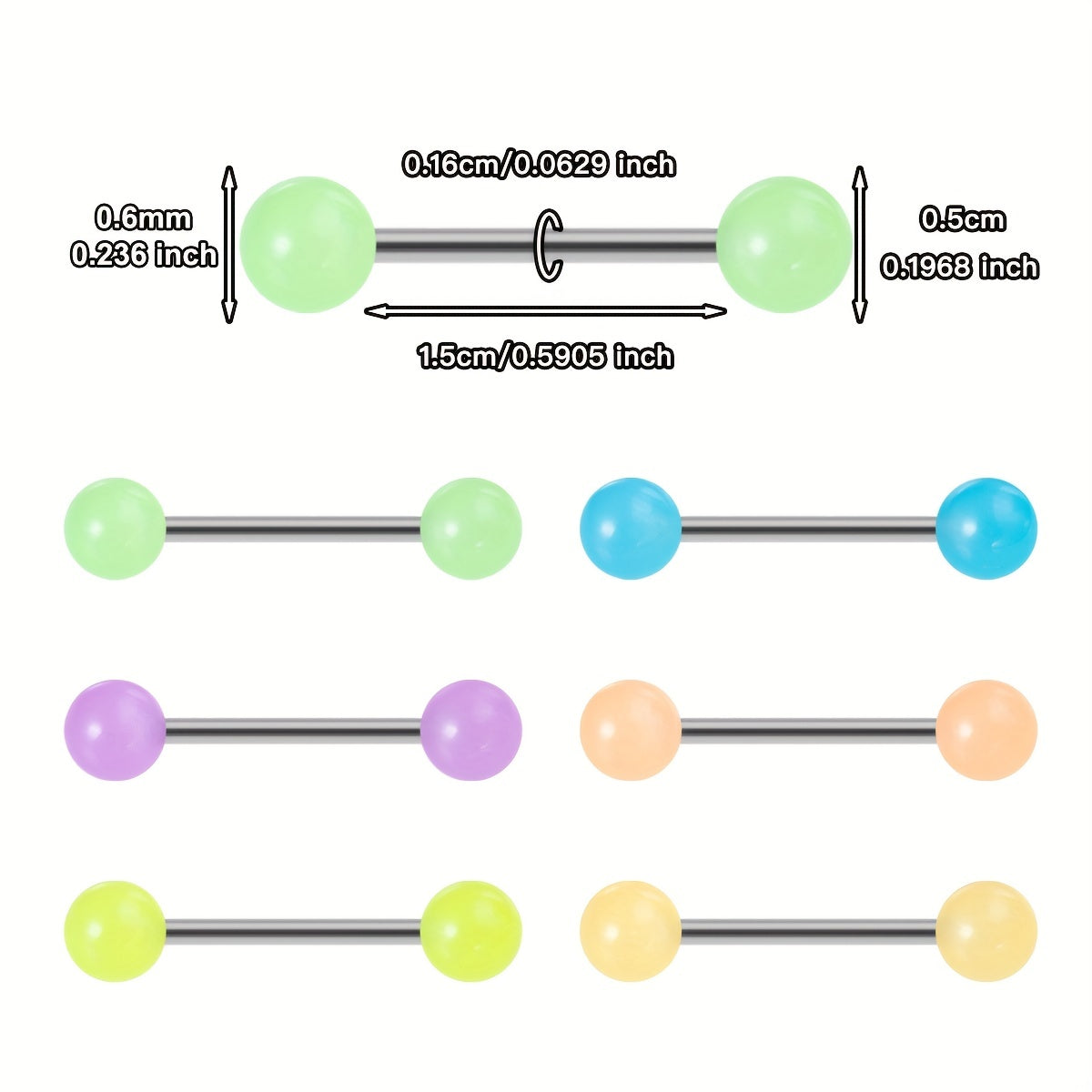 Get noticed with these glow-in-the-dark tongue rings. Made from stainless steel and acrylic, these barbell studs are perfect for both men and women.