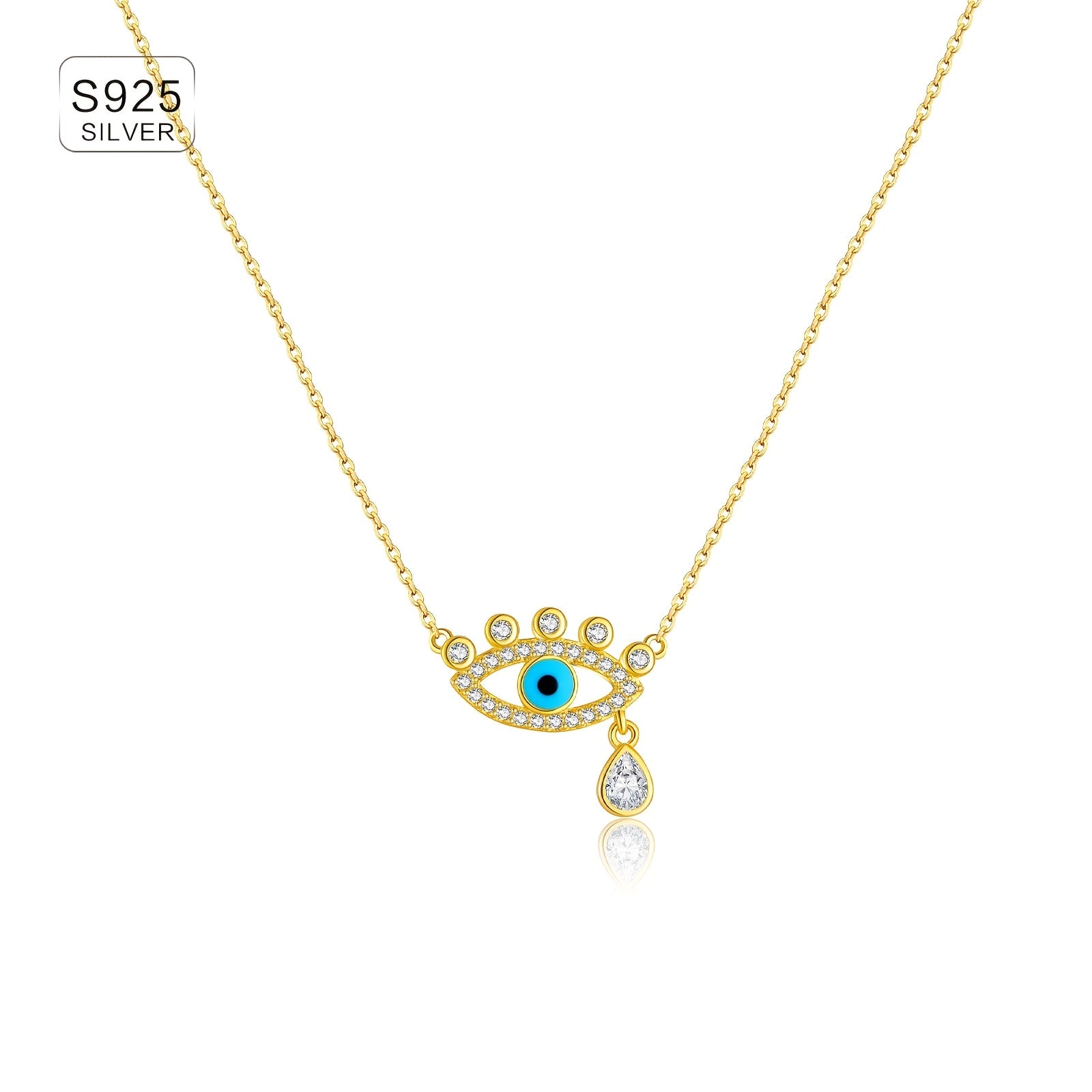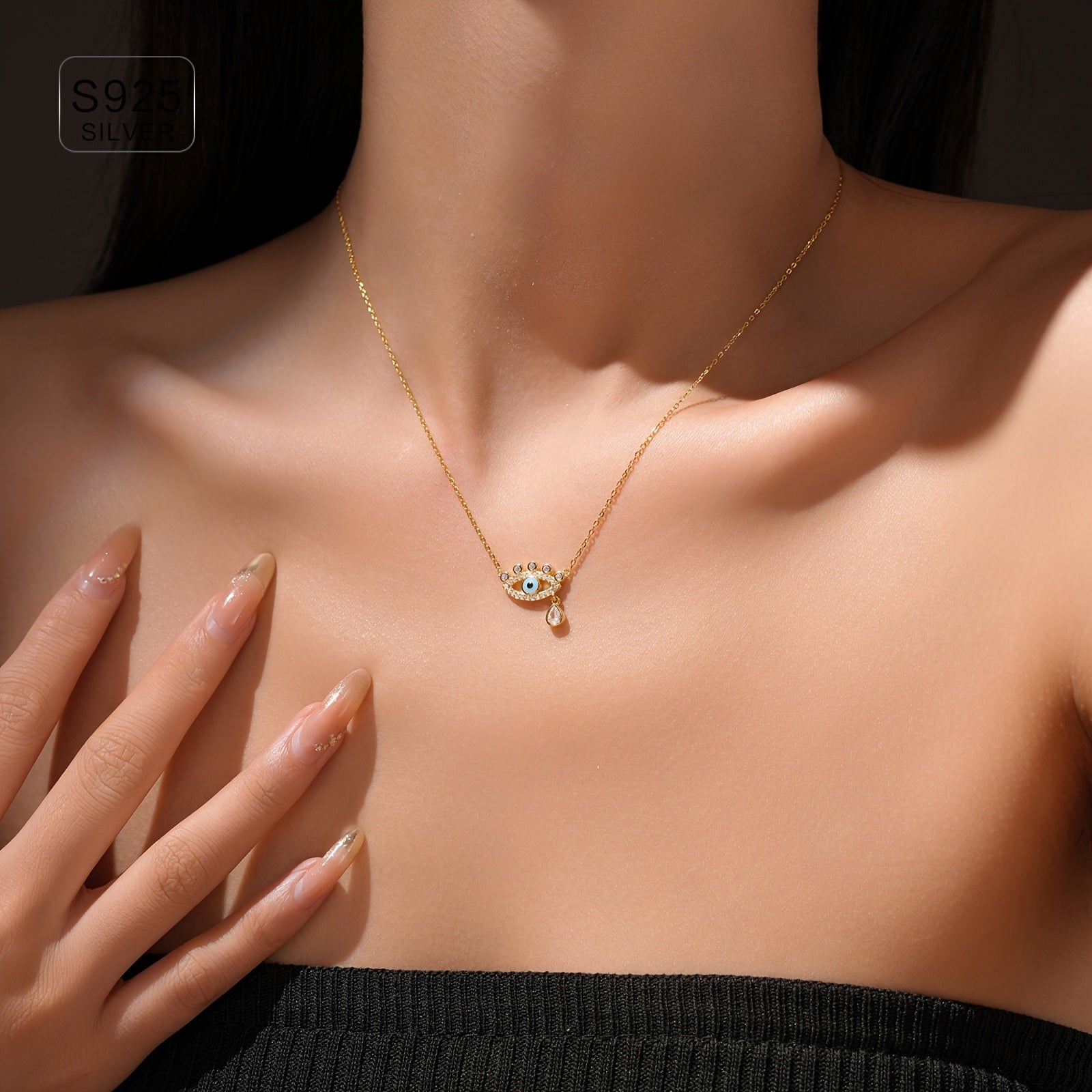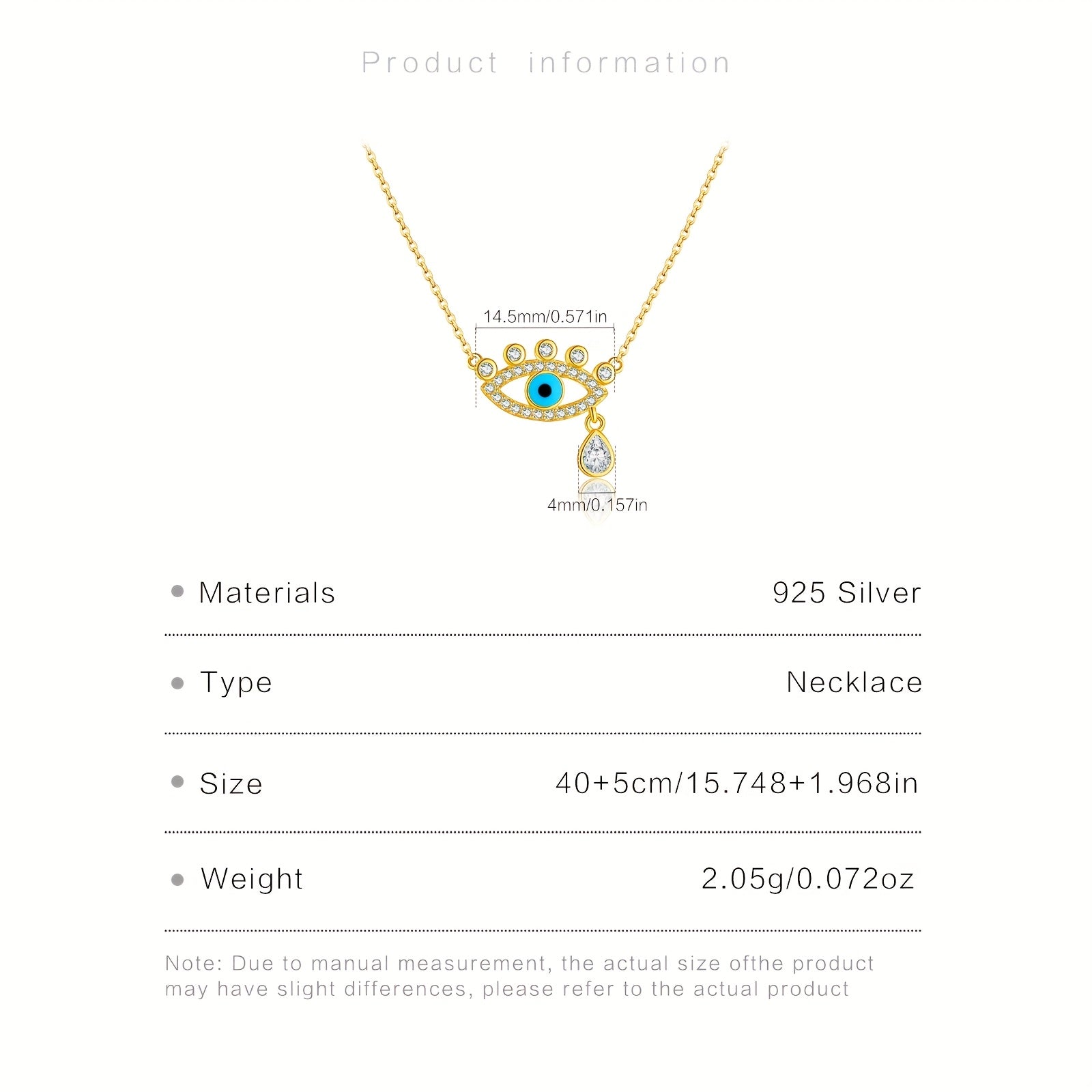 Elegant 925 silver necklace with a stunning eye pendant encrusted with synthetic zirconia stones. The pendant is elegantly styled with a 18K gold plating, making it a chic and versatile accessory for women.