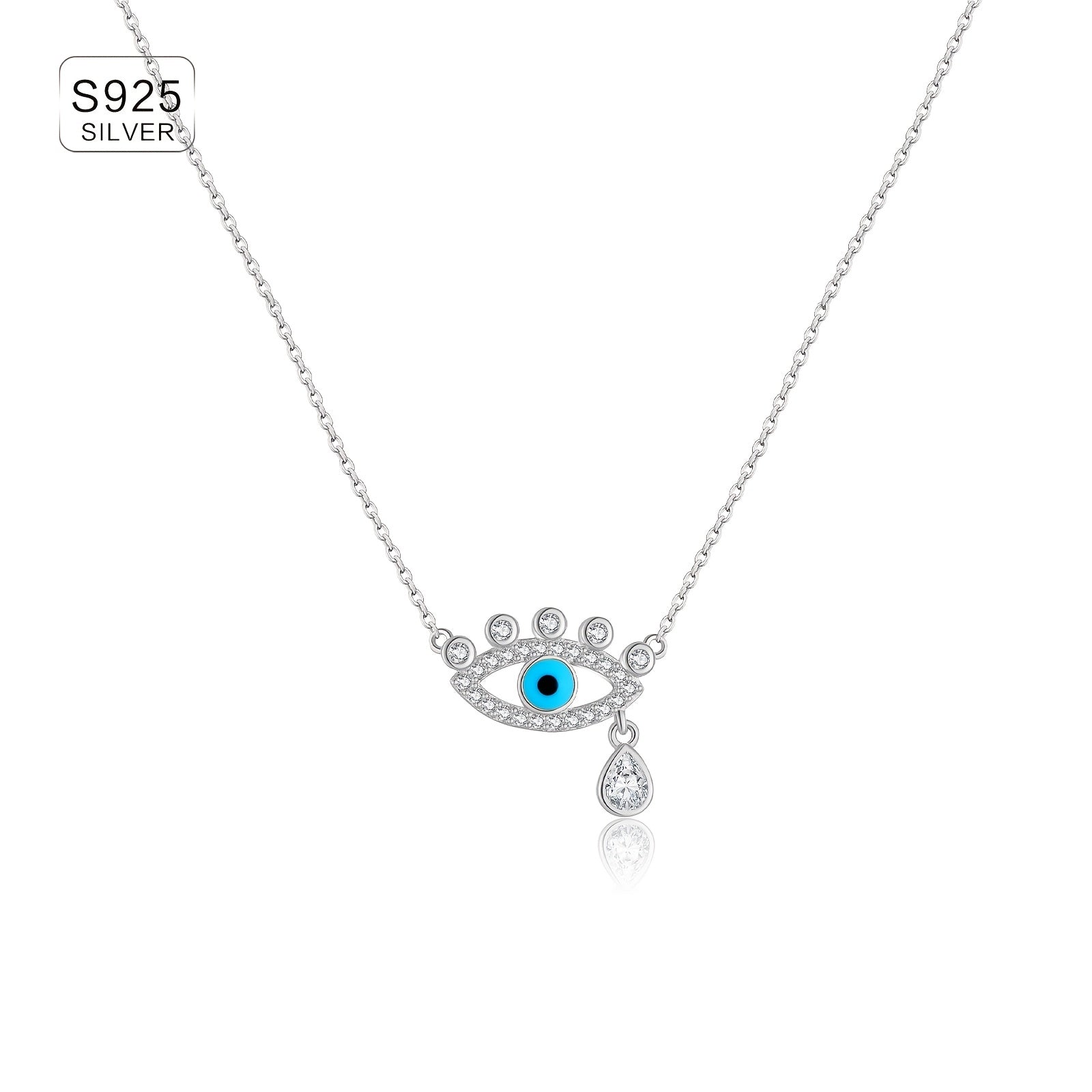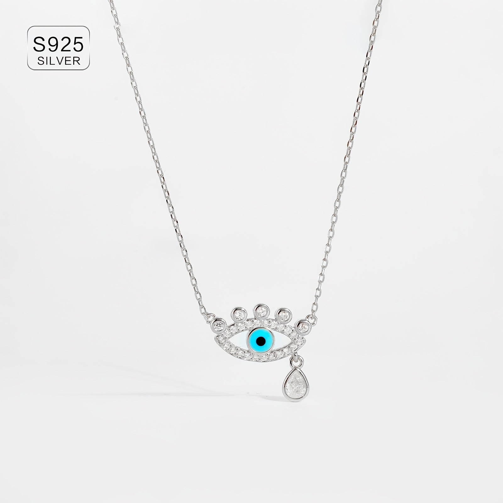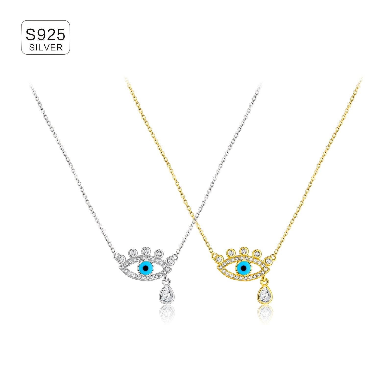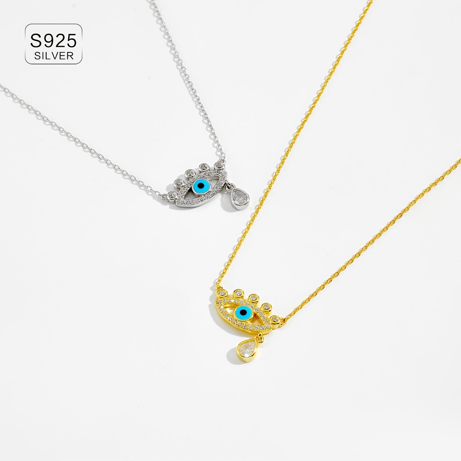 Elegant 925 silver necklace with a stunning eye pendant encrusted with synthetic zirconia stones. The pendant is elegantly styled with a 18K gold plating, making it a chic and versatile accessory for women.