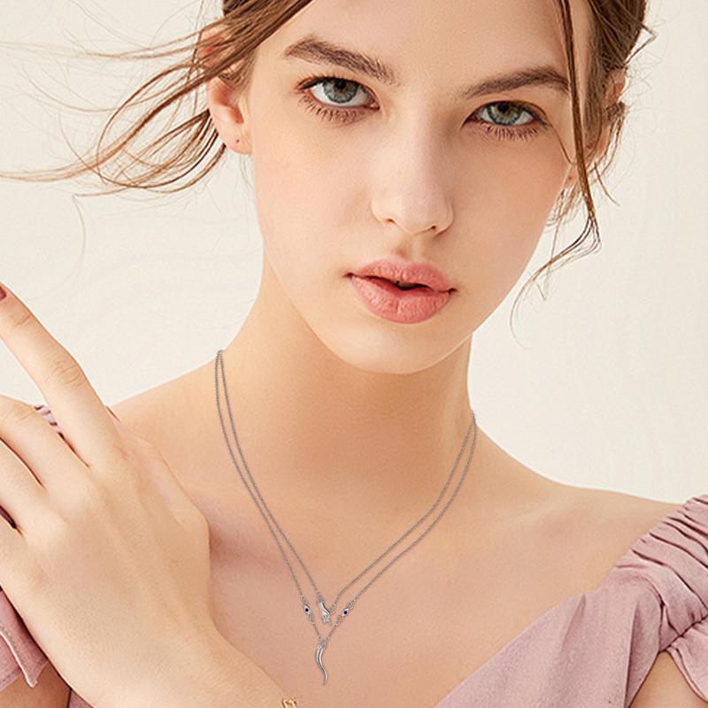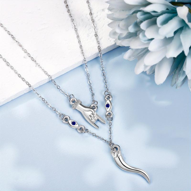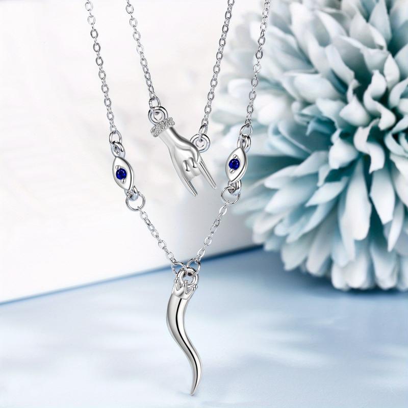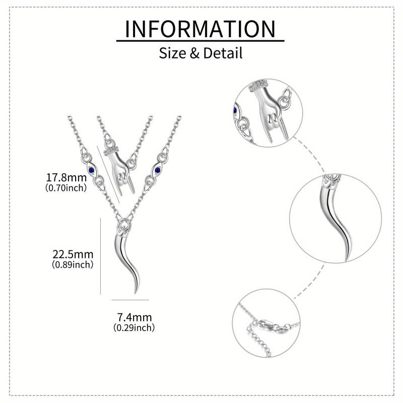 This Italian Horn necklace is made of 925 sterling silver and features a hand-layered design. The pendant is in the shape of the Italian Horn with an evil eye detail, making it a stylish and protective piece of jewelry.