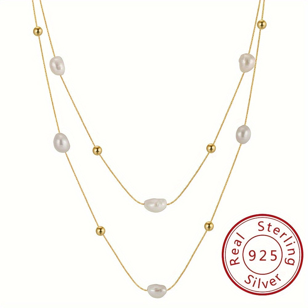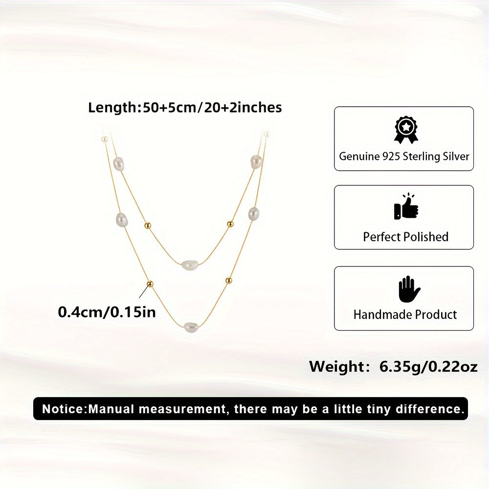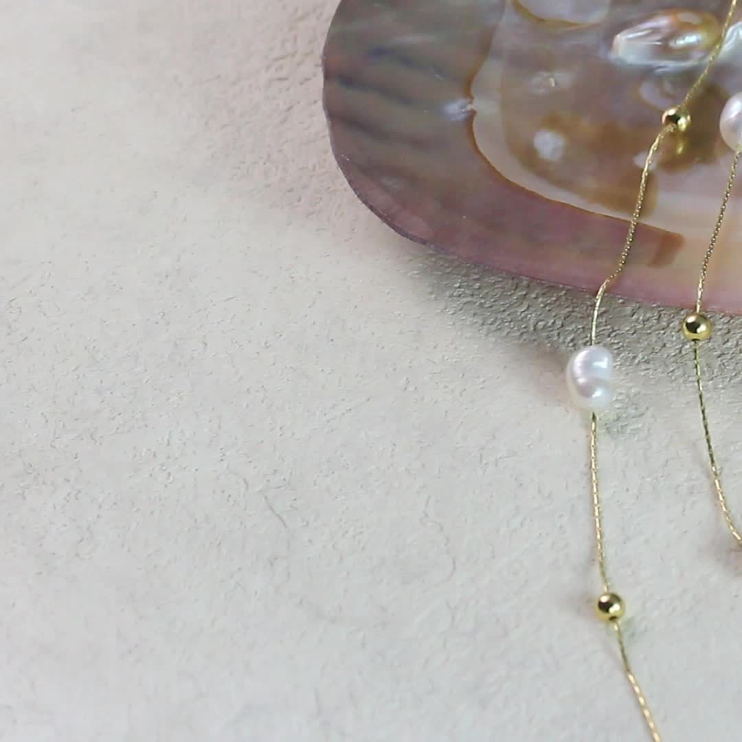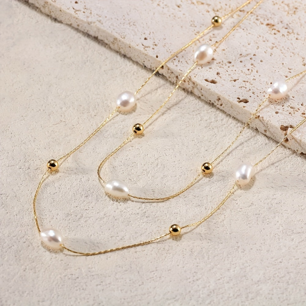 This elegant necklace features a double-layer thin chain with natural freshwater pearl beads. The neck chain is adjustable to suit your preference.